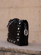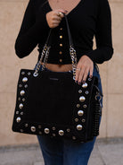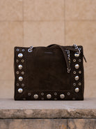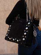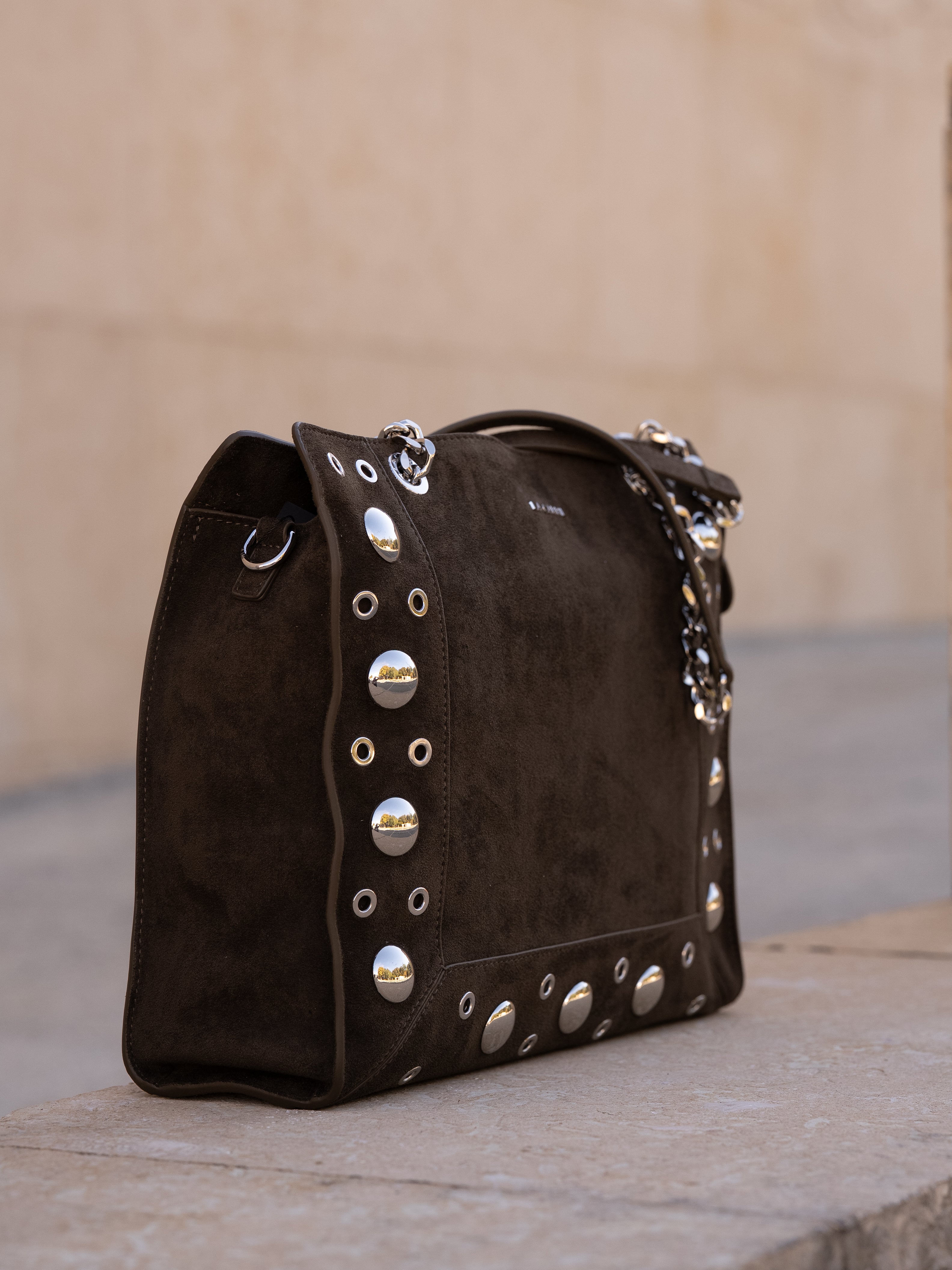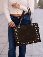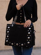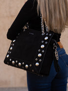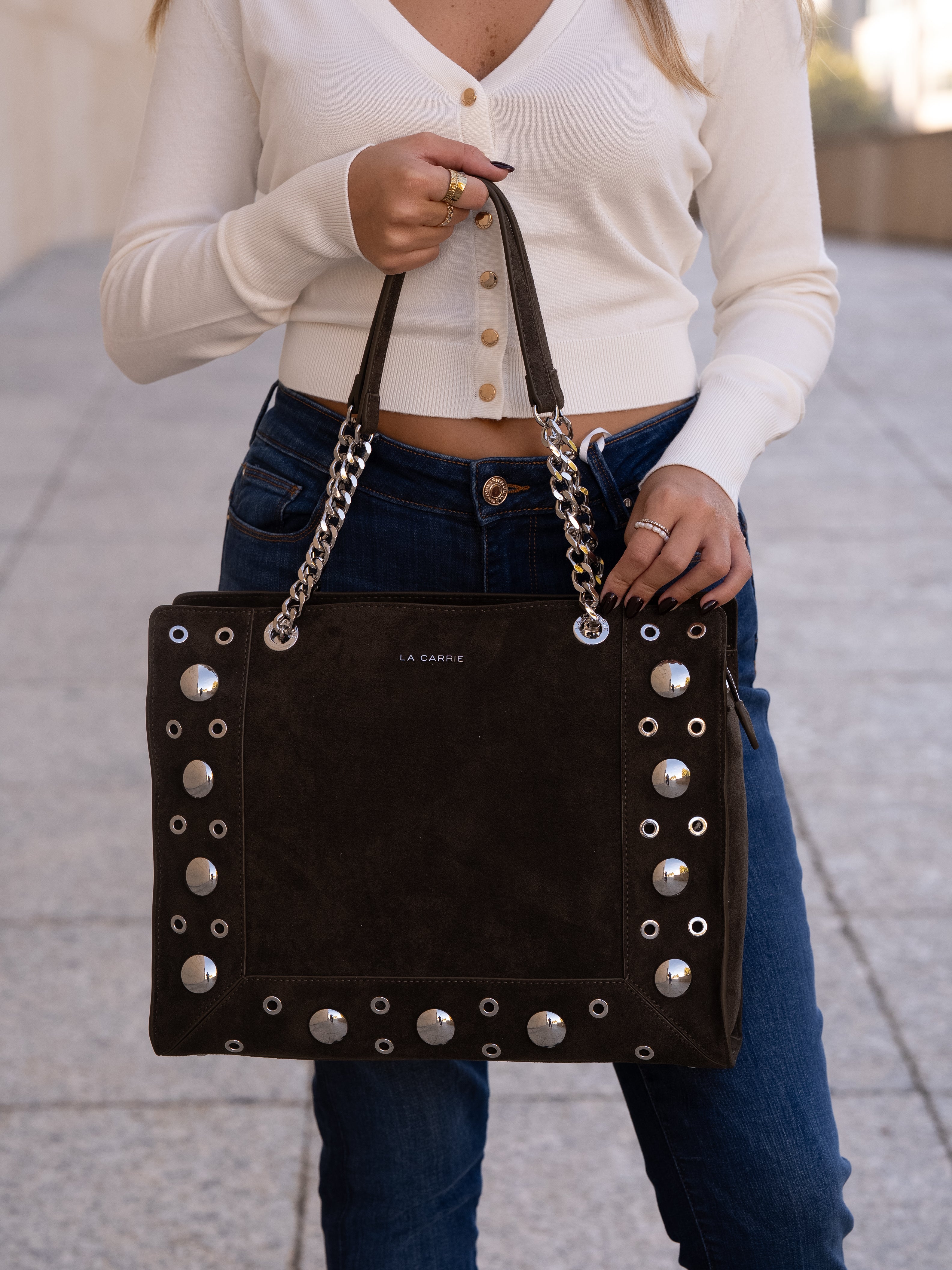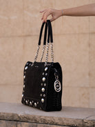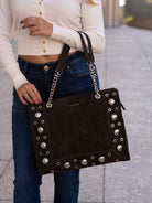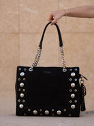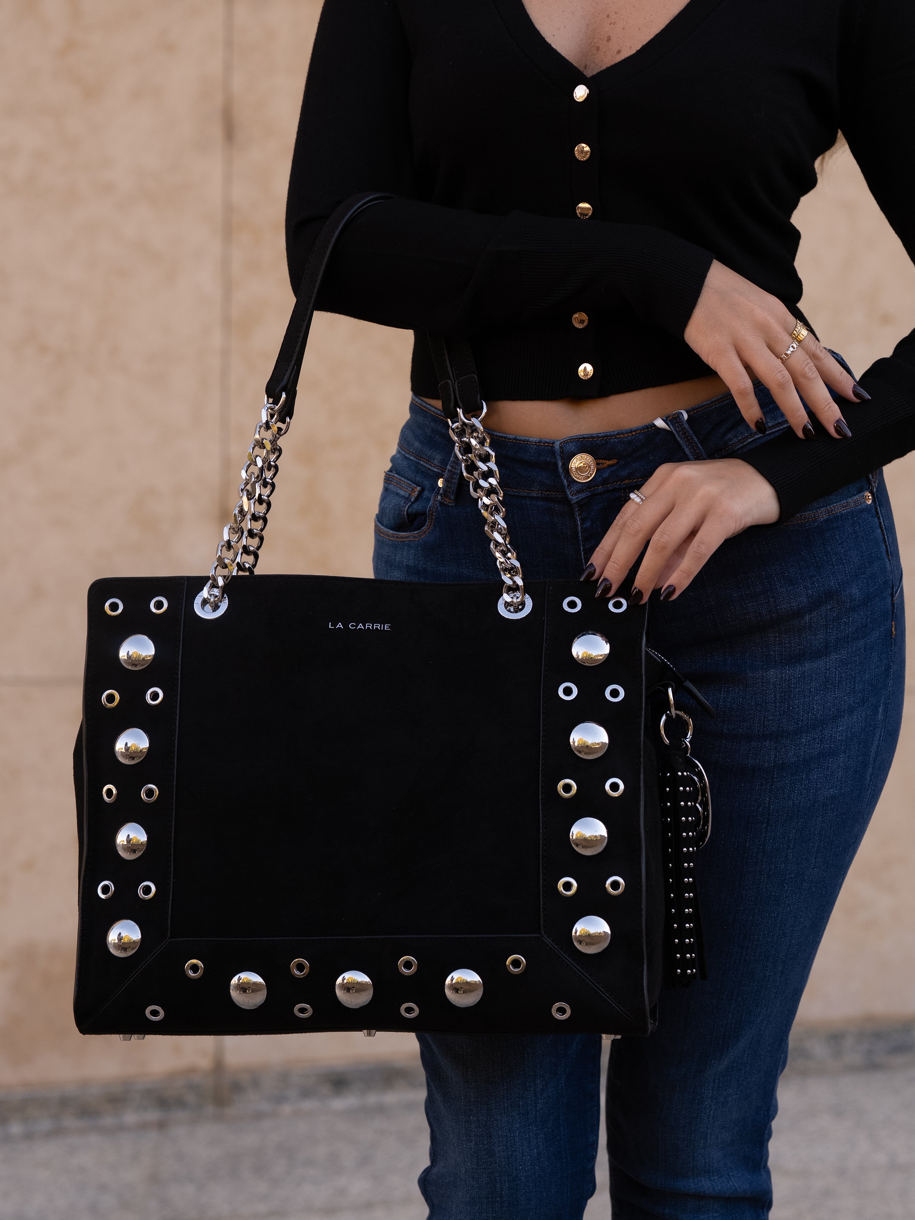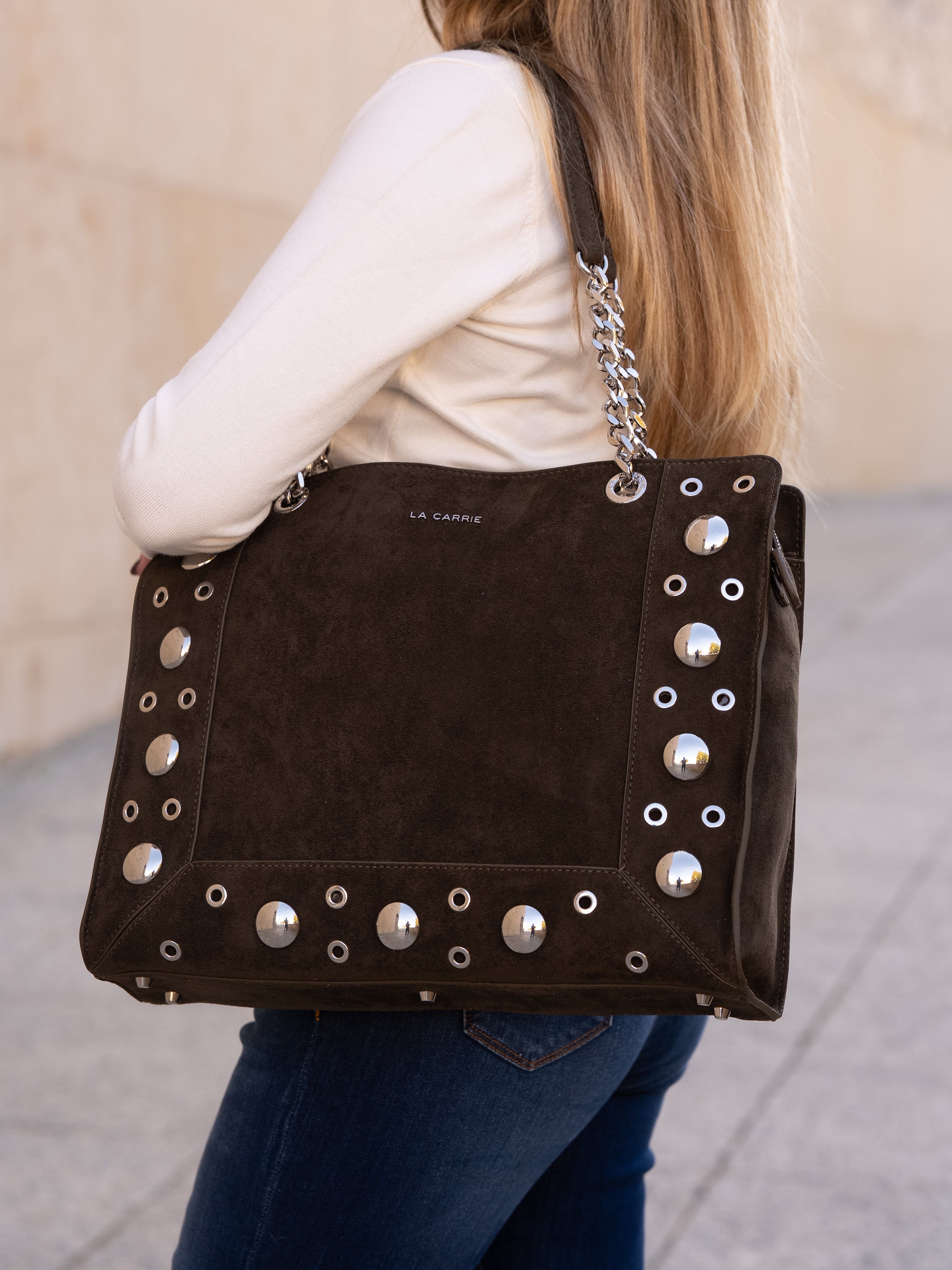 Suede shopping bag with eyelets and silver studs, double chain handles and removable shoulder strap