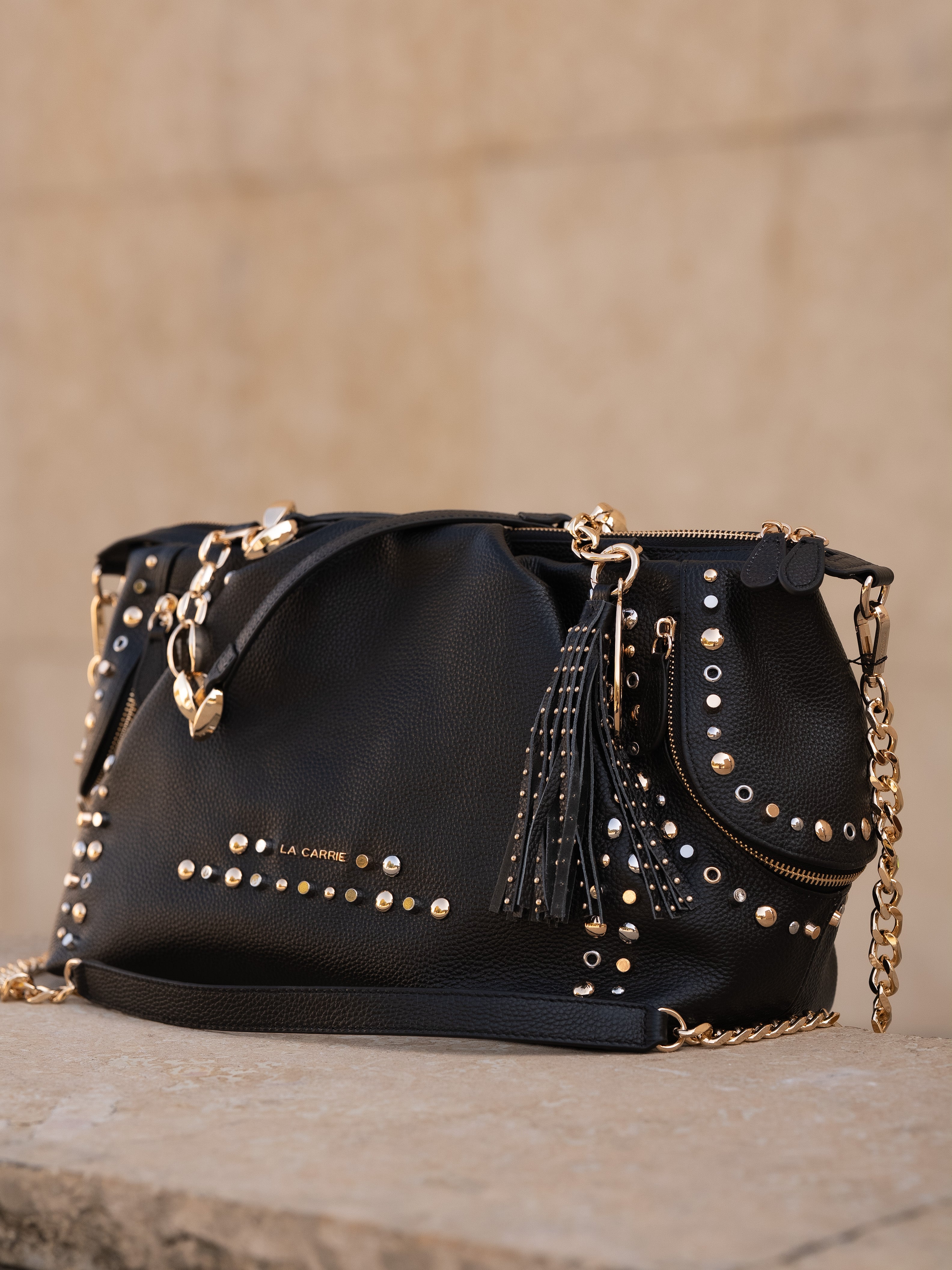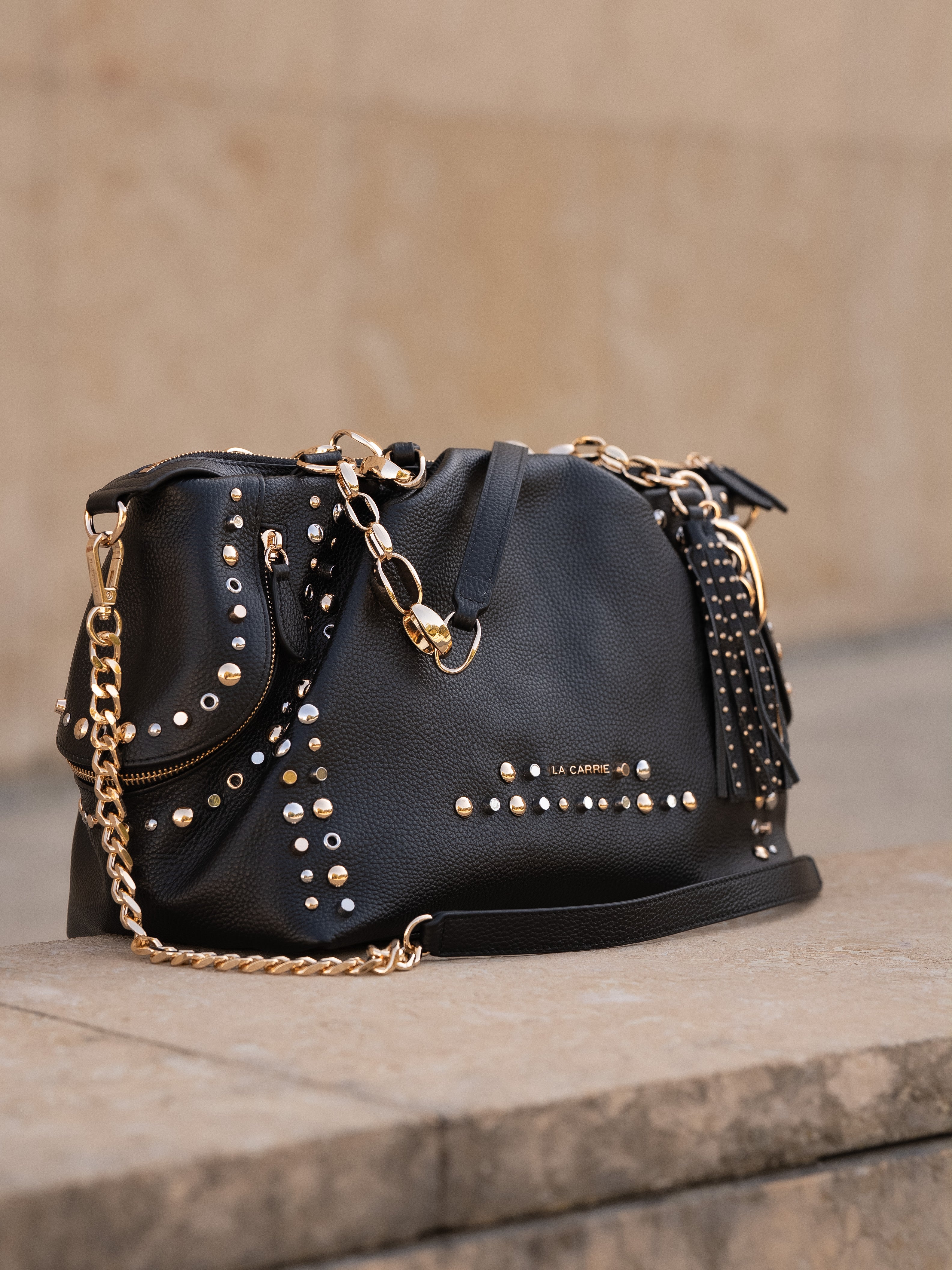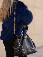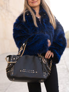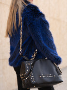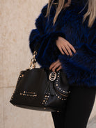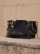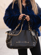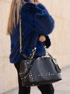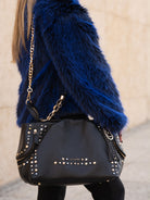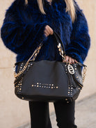 Hammered leather shopping bag with studs applied on the edges and chain handles, removable shoulder strap