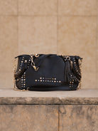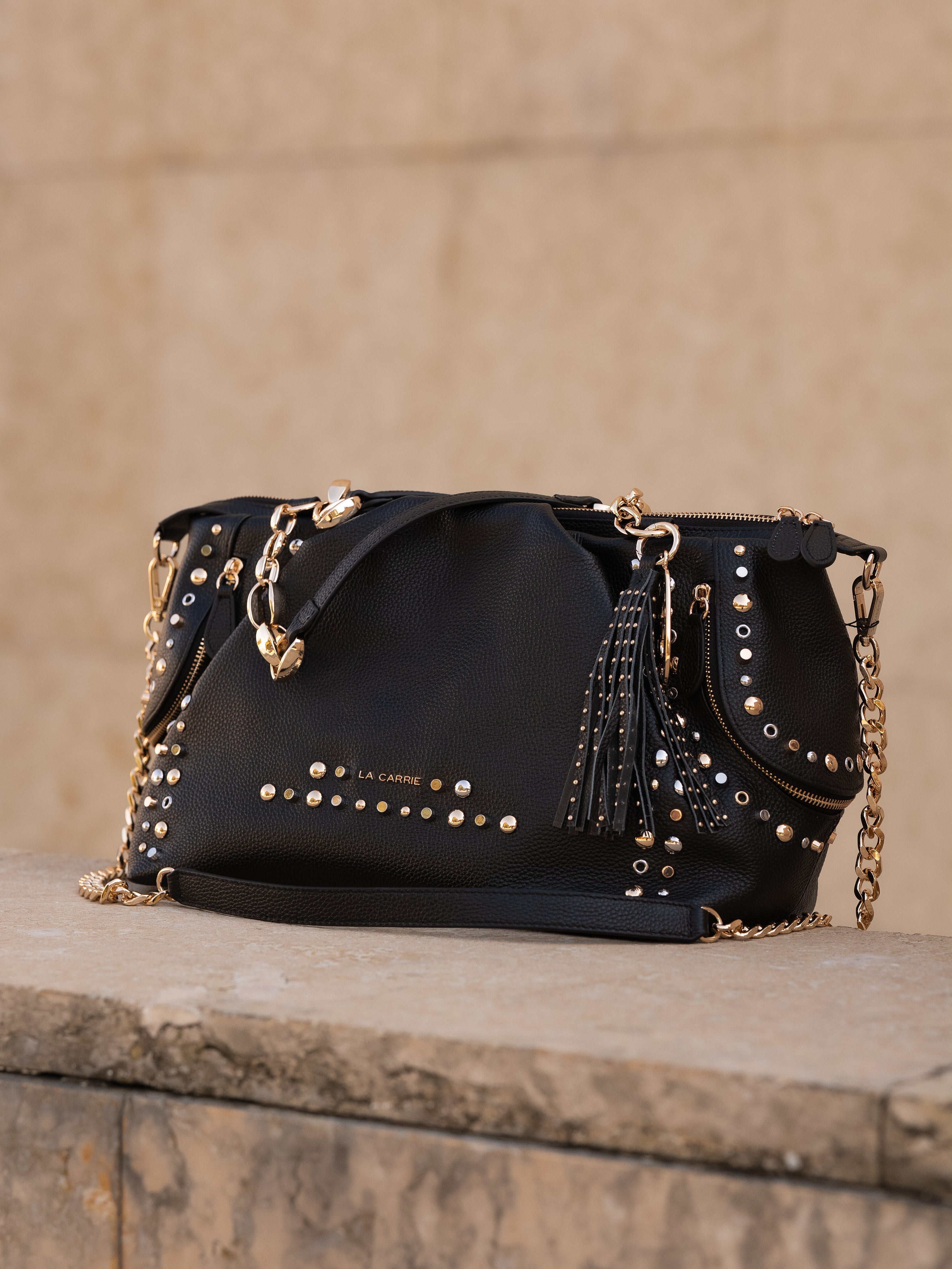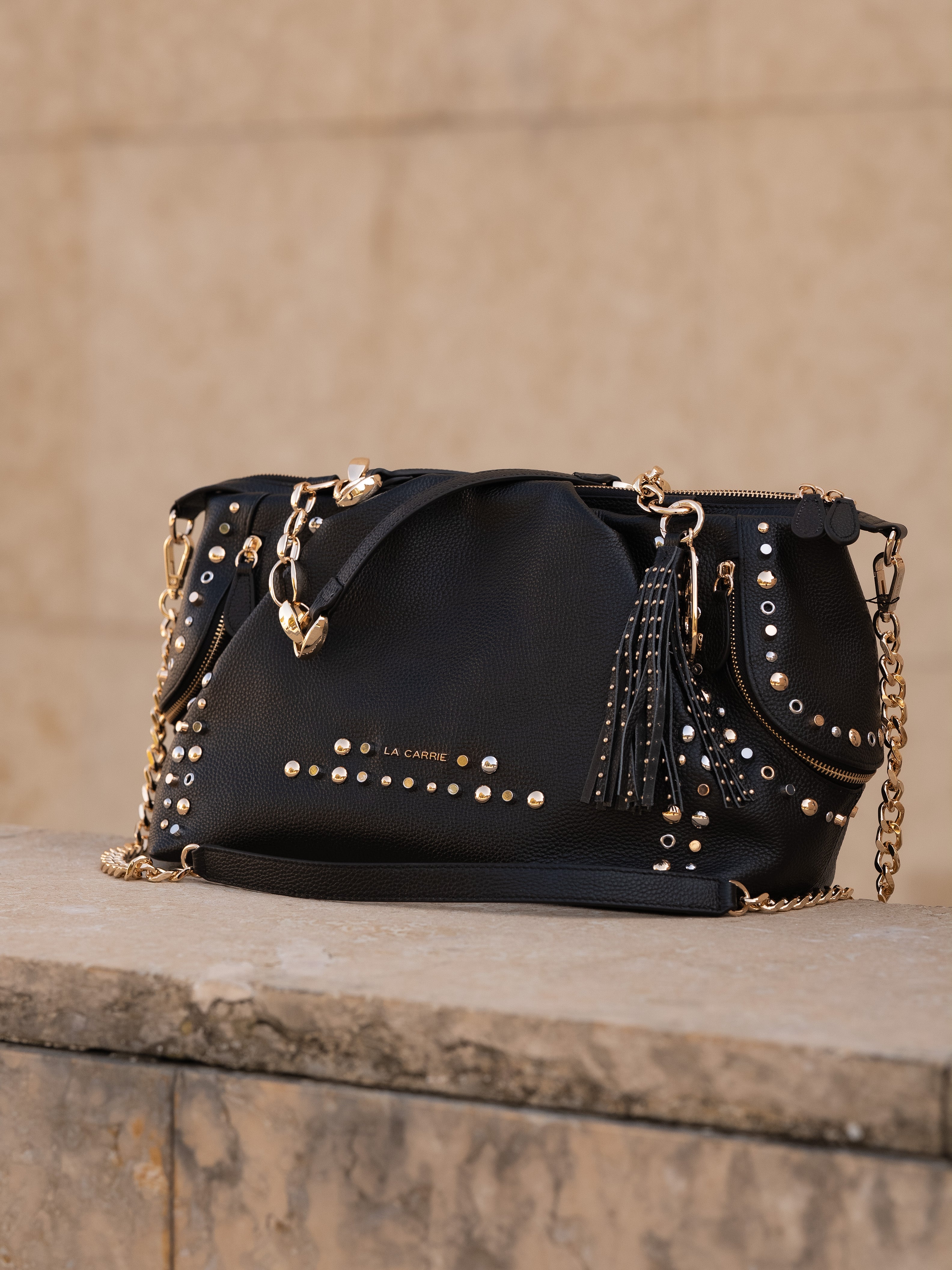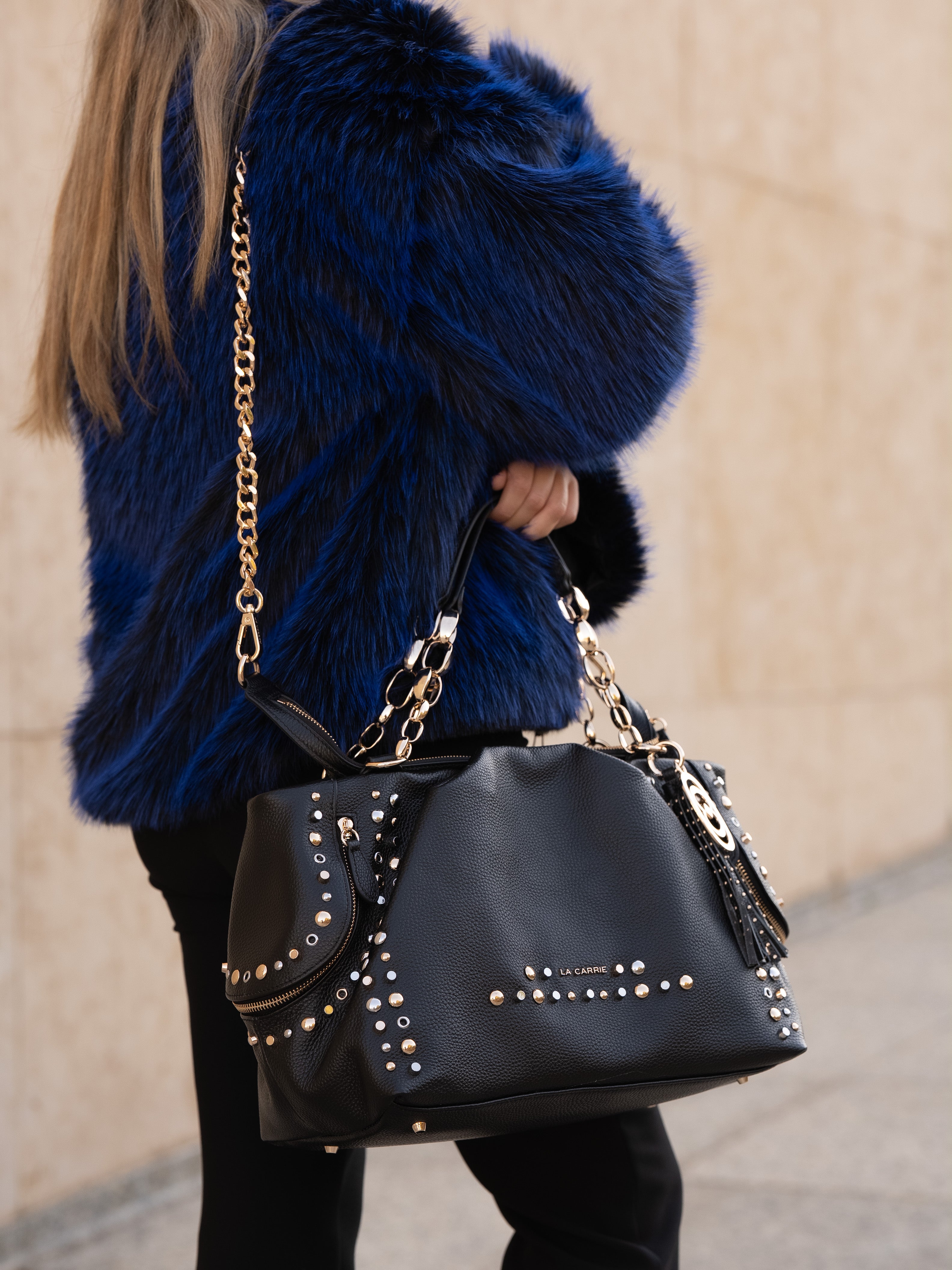 Hammered leather shopping bag with studs applied on the edges and chain handles, removable shoulder strap