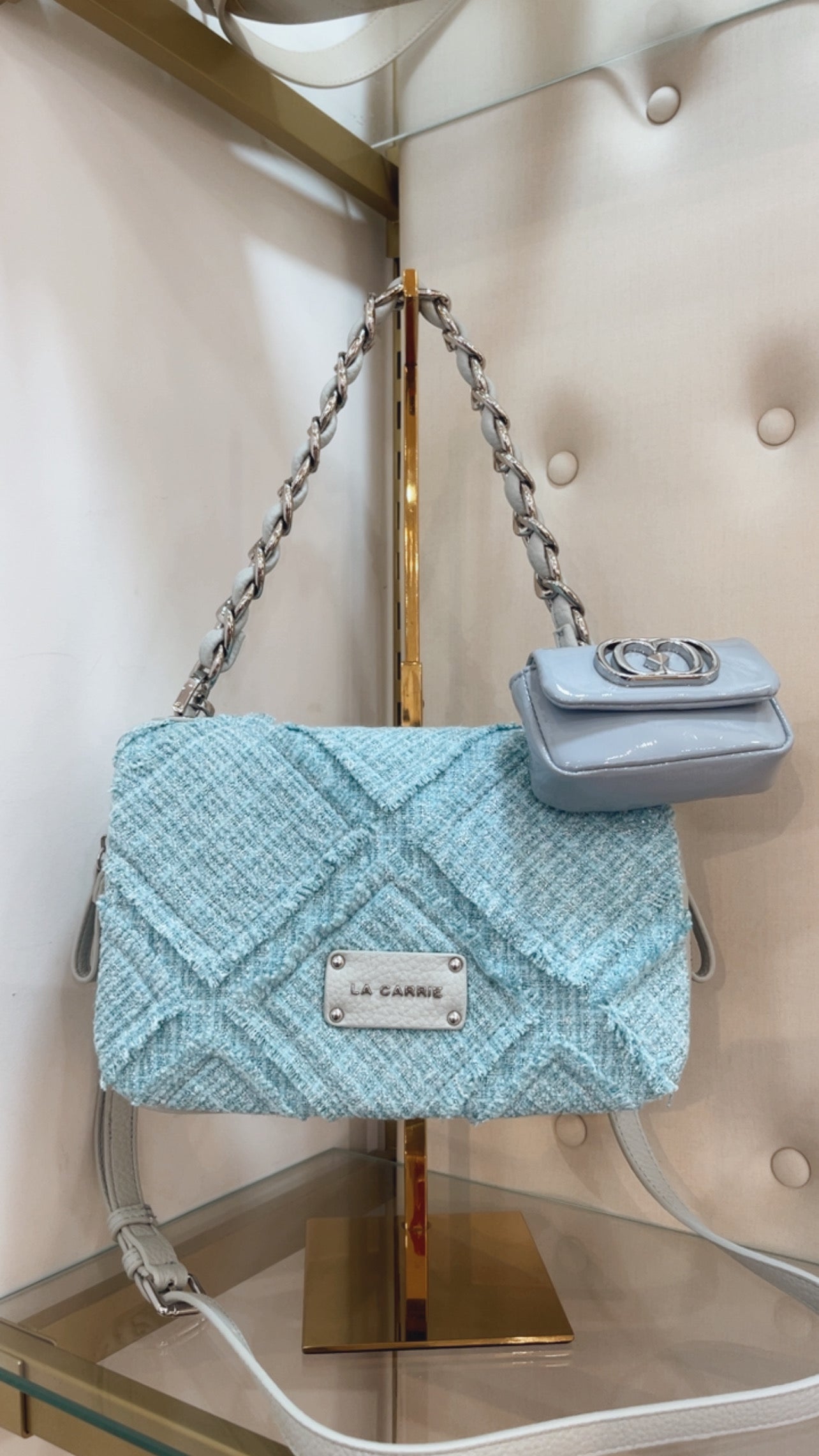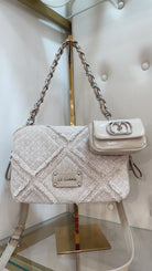 Canvas shoulder bag with diamond pattern and mini bag, chain handle inserted into canvas and removable shoulder strap