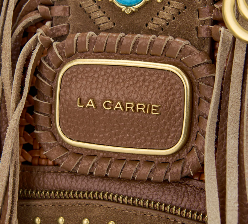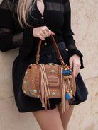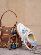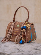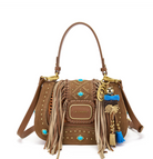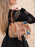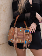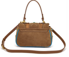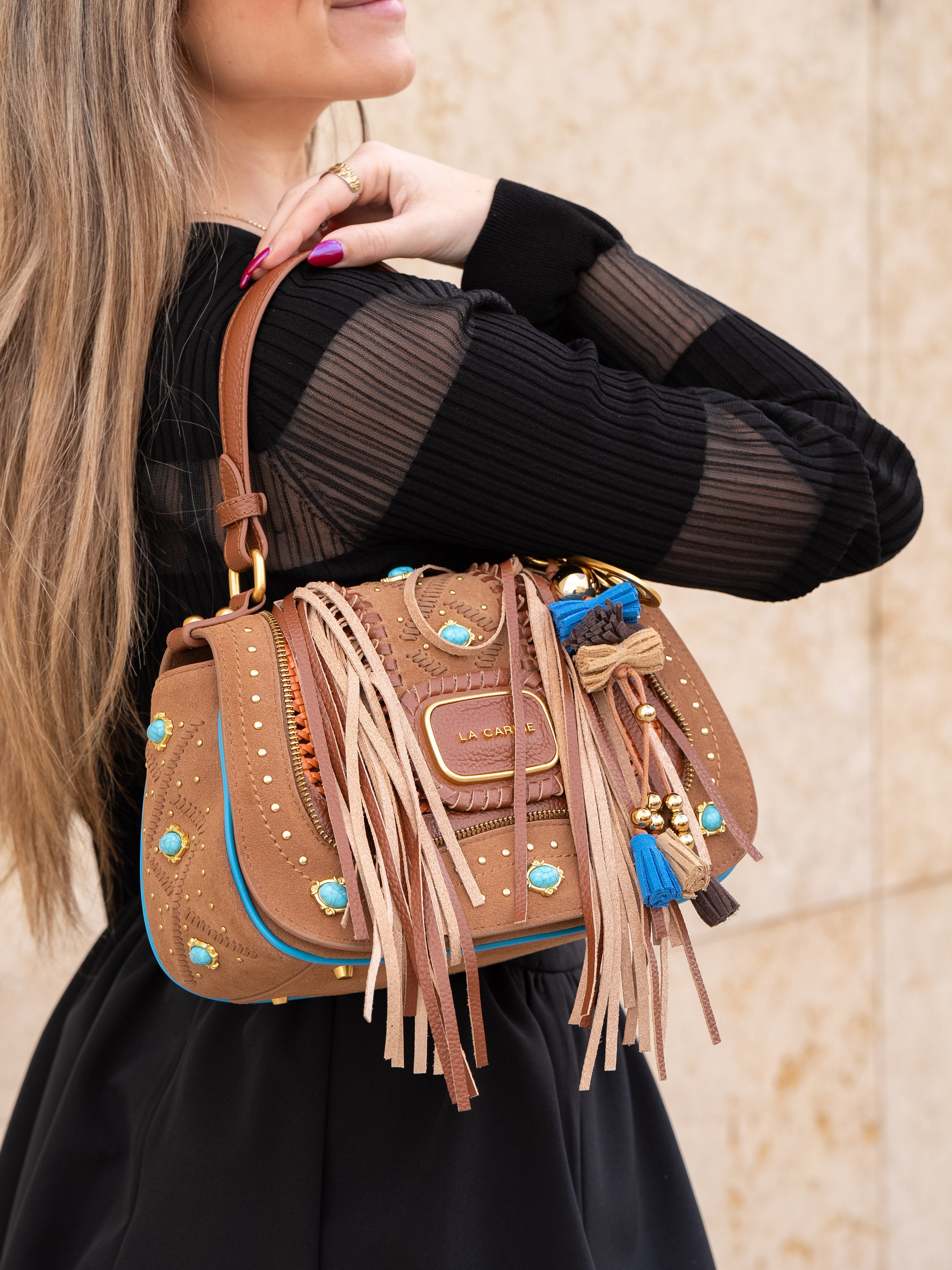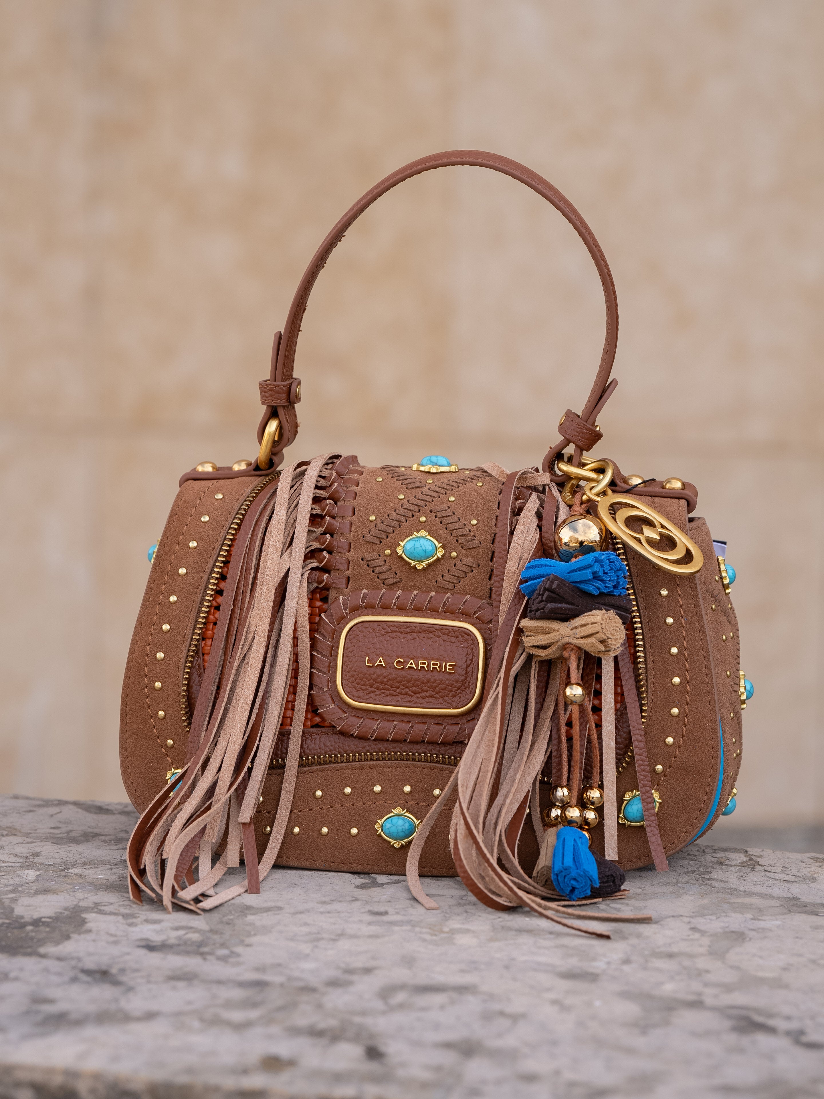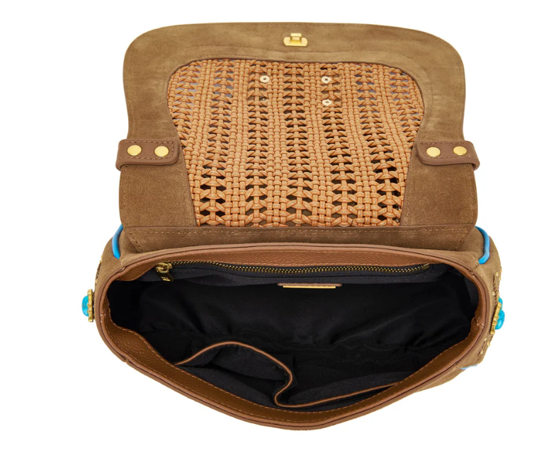 Suede handbag with woven details and applied studs, removable shoulder strap