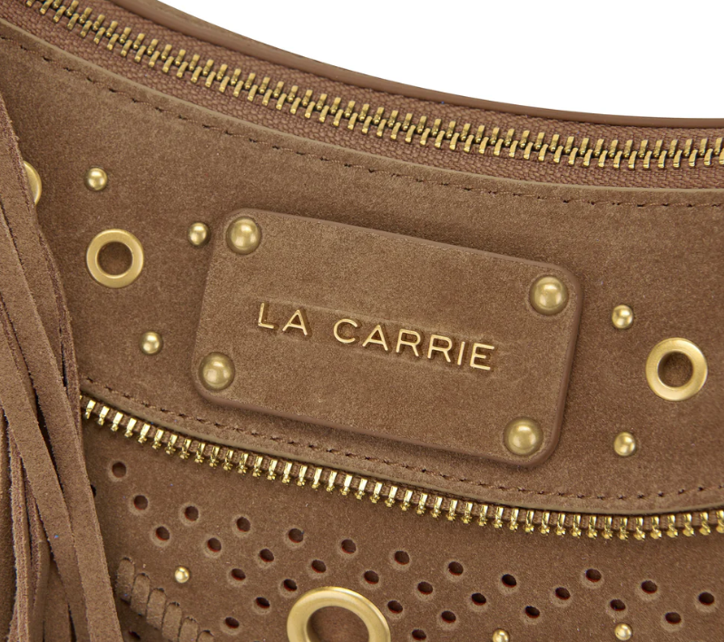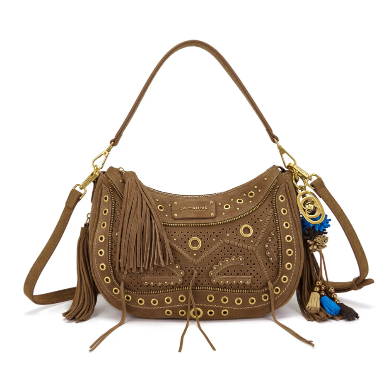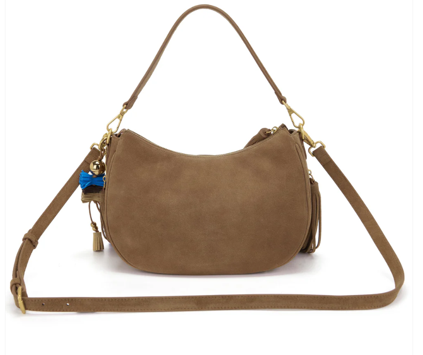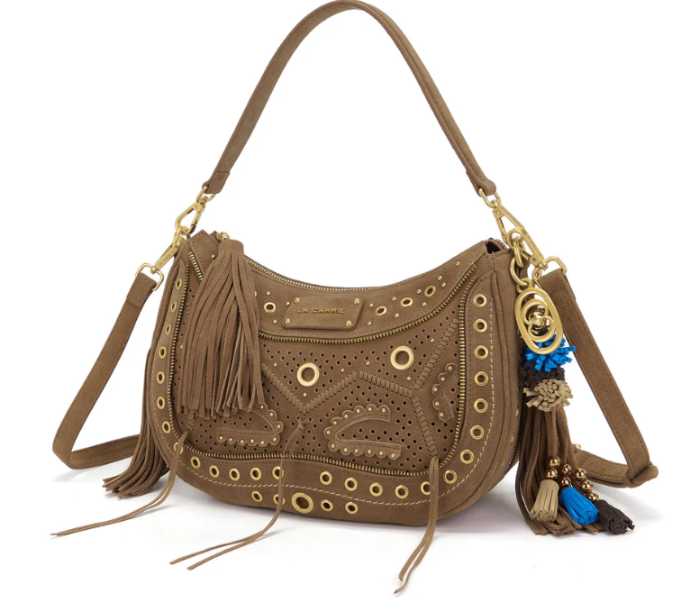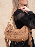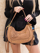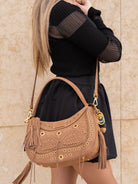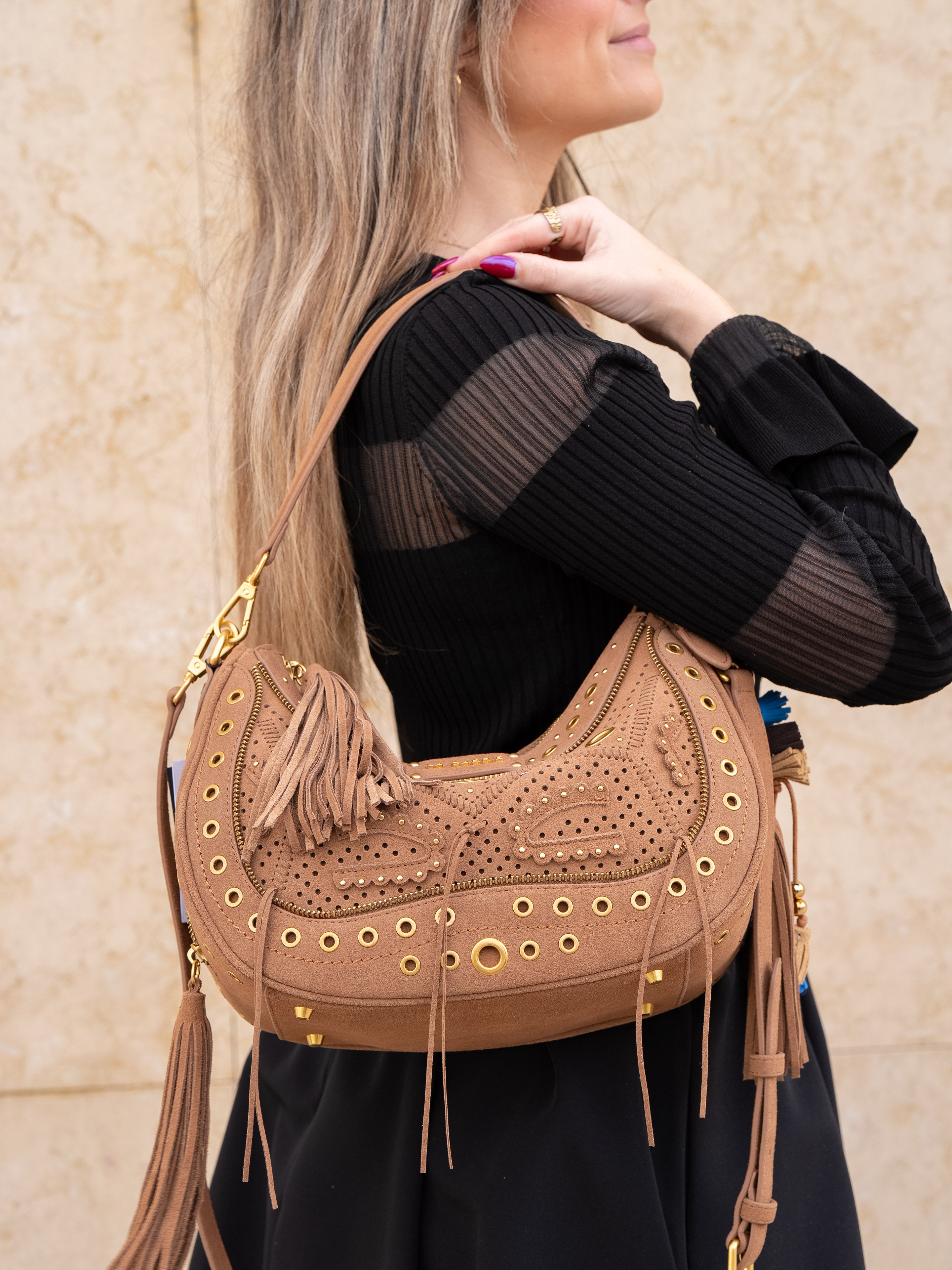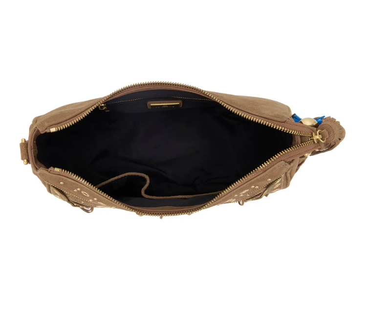 Suede hobo bag with woven detailing and studs, zip closure and removable handle and shoulder strap