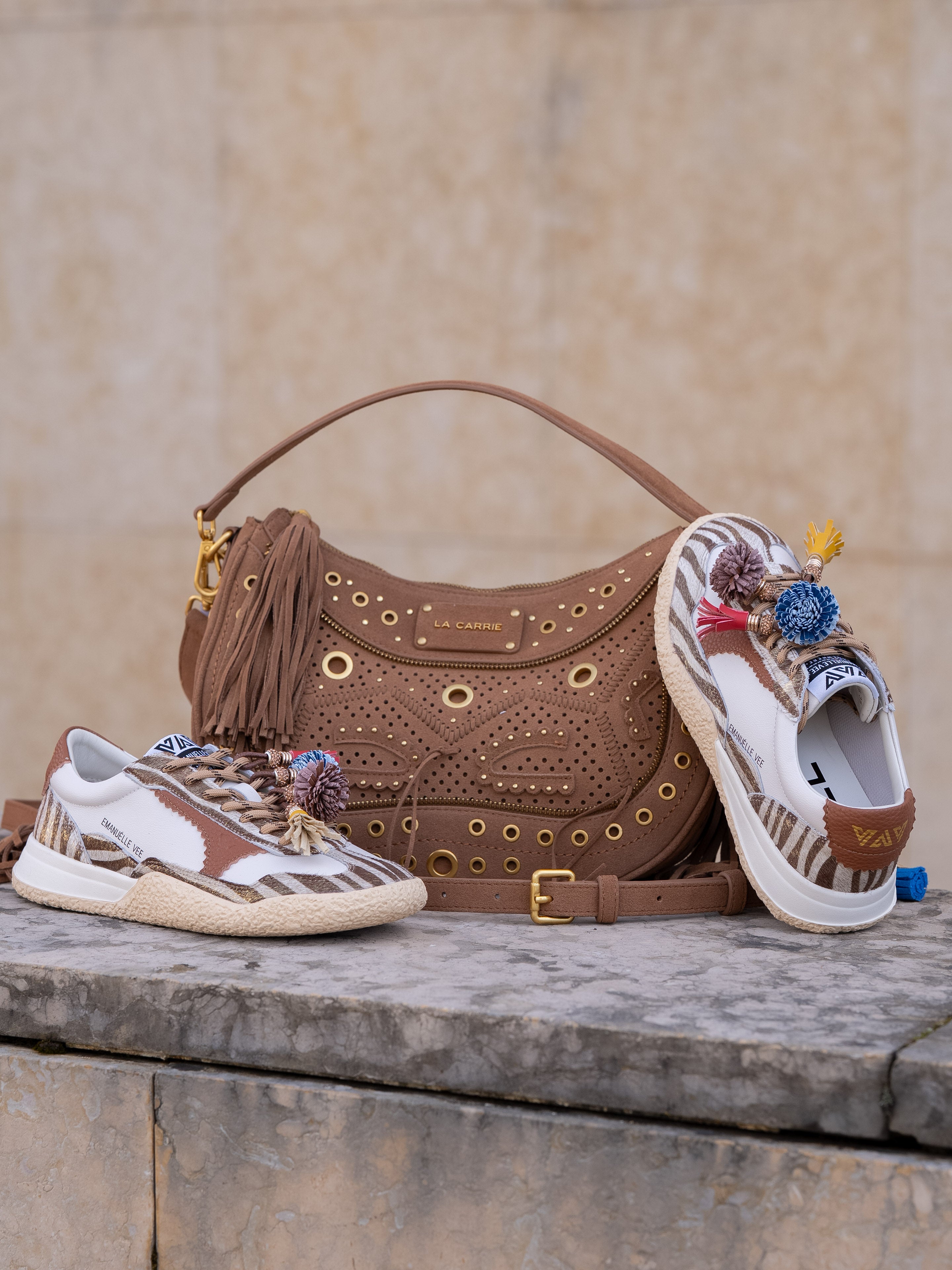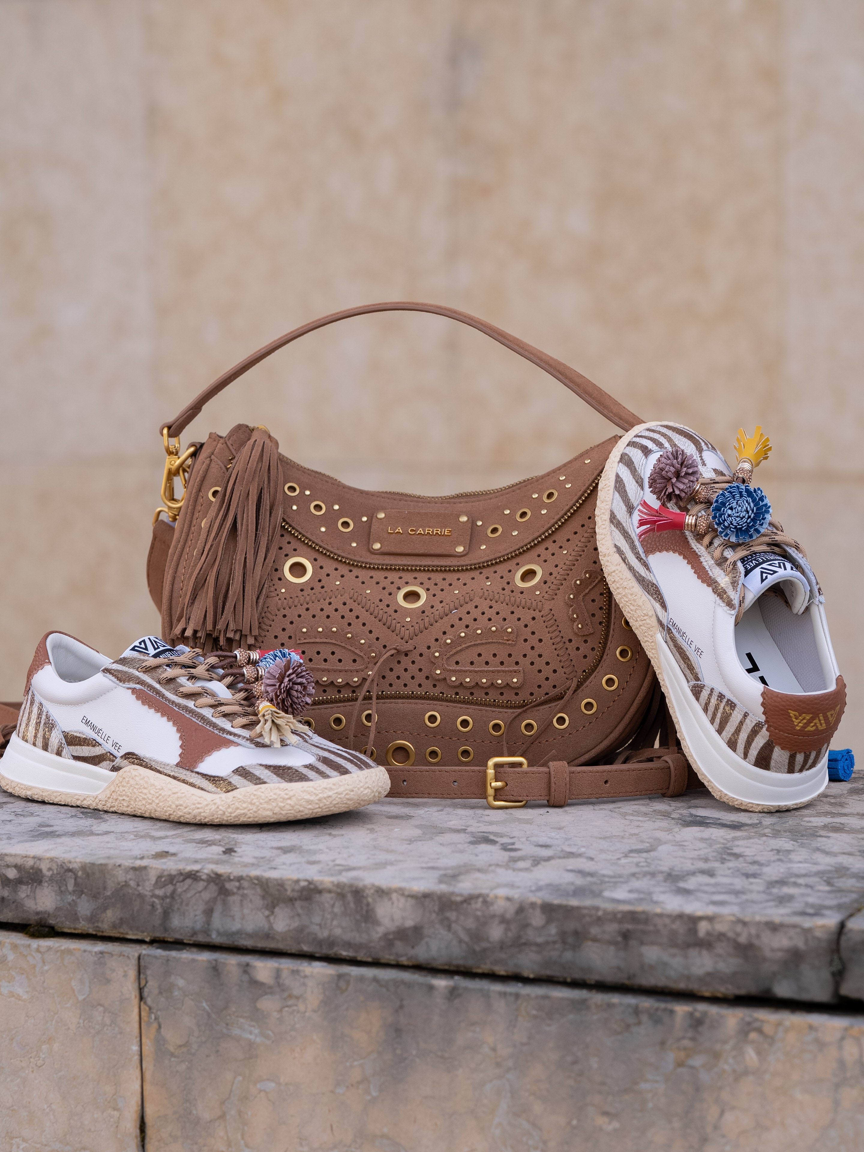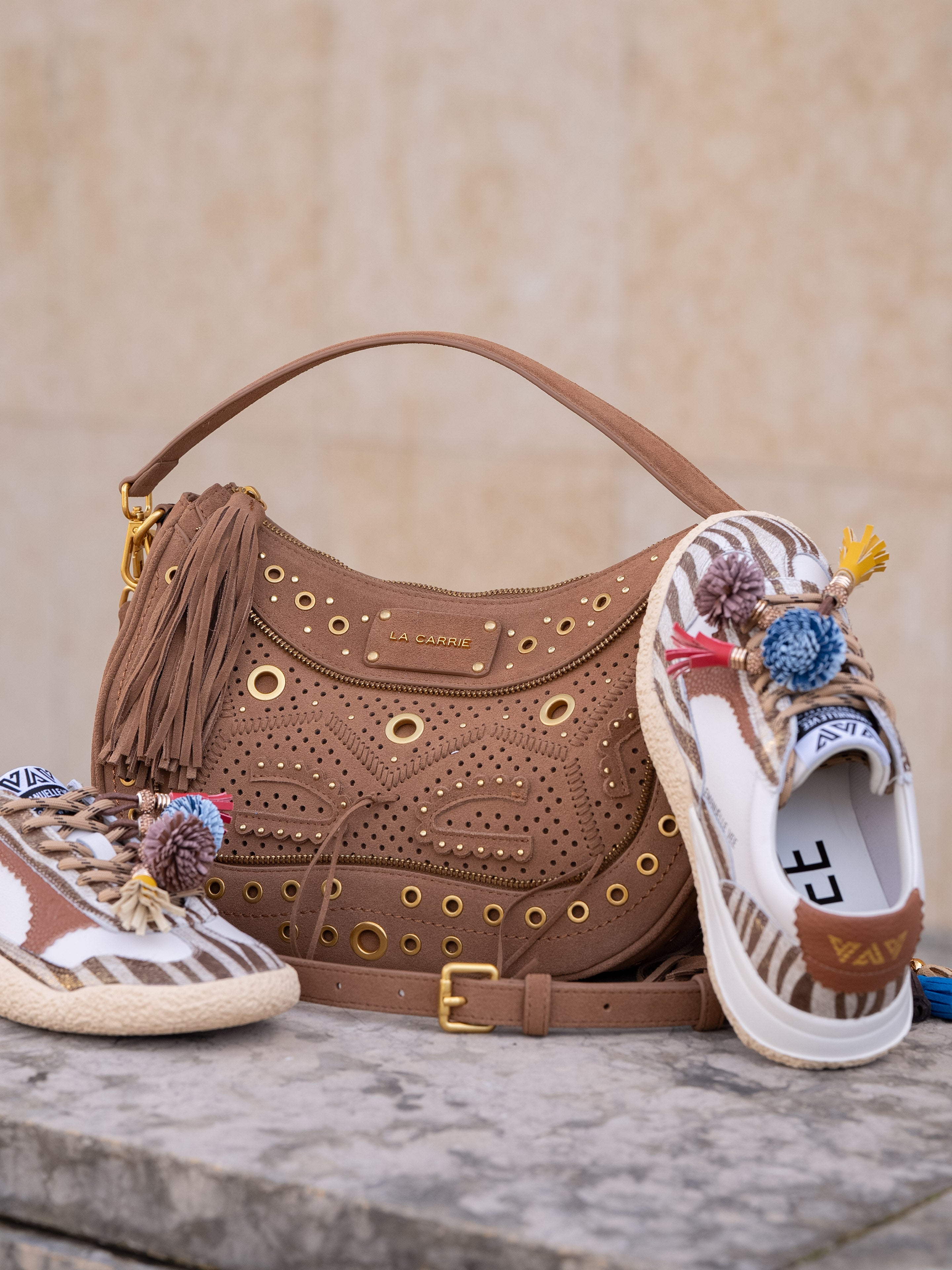 Suede hobo bag with woven detailing and studs, zip closure and removable handle and shoulder strap