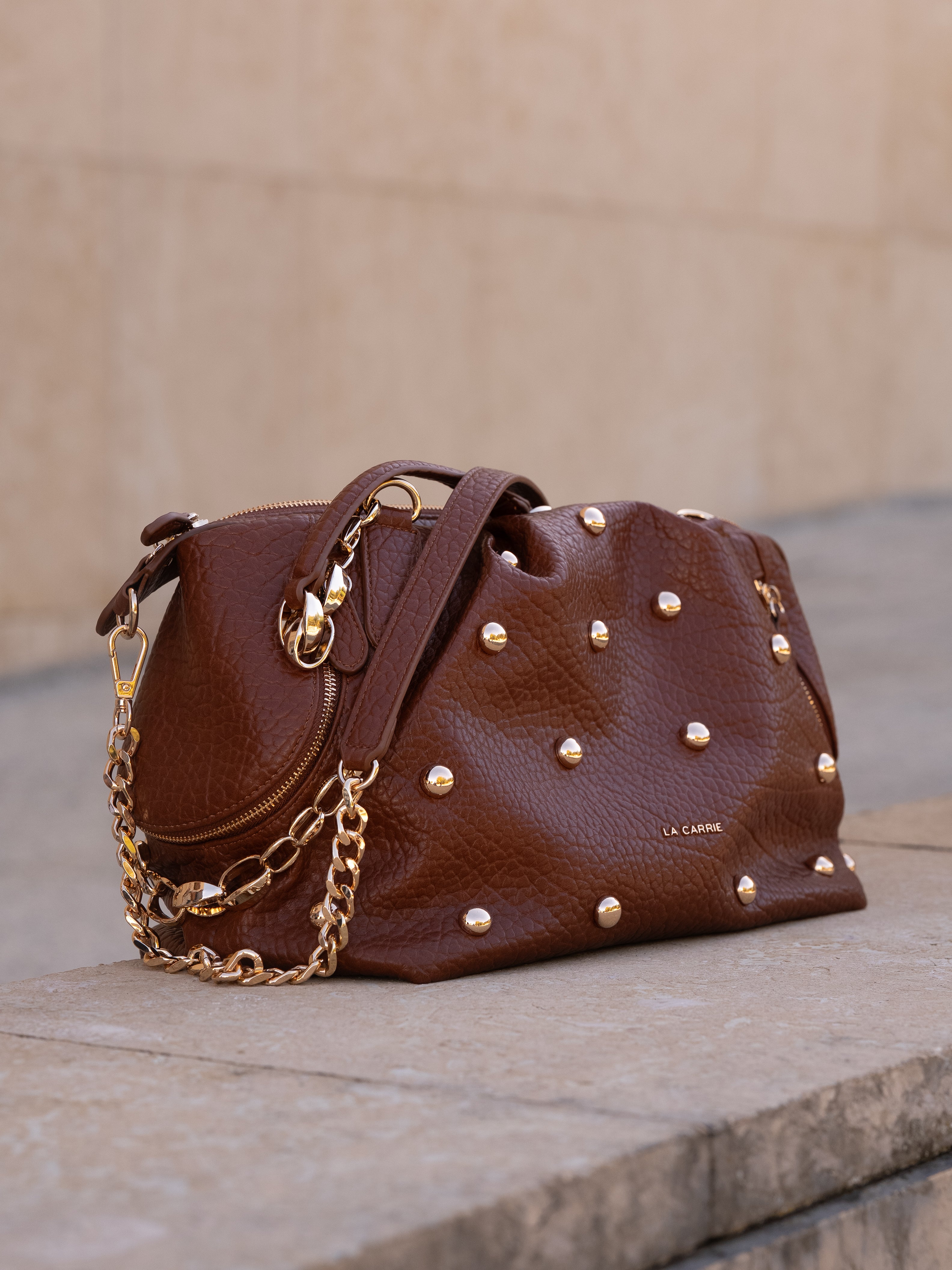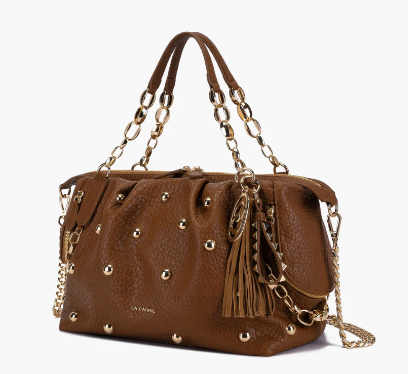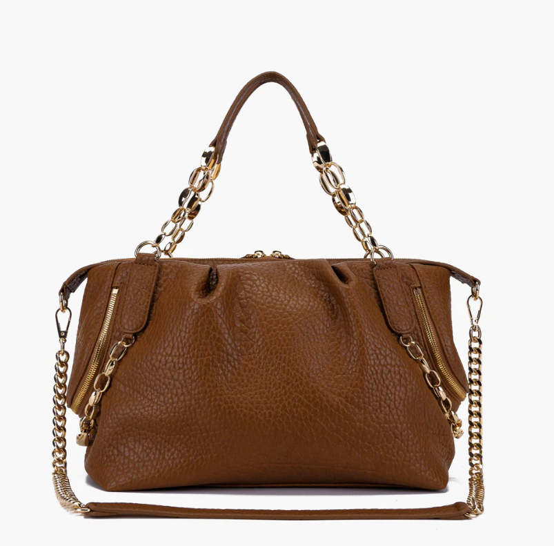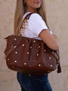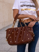 Eco-friendly faux leather shopping bag, chain handles, studs and golden accessories, removable chain shoulder strap