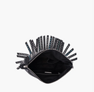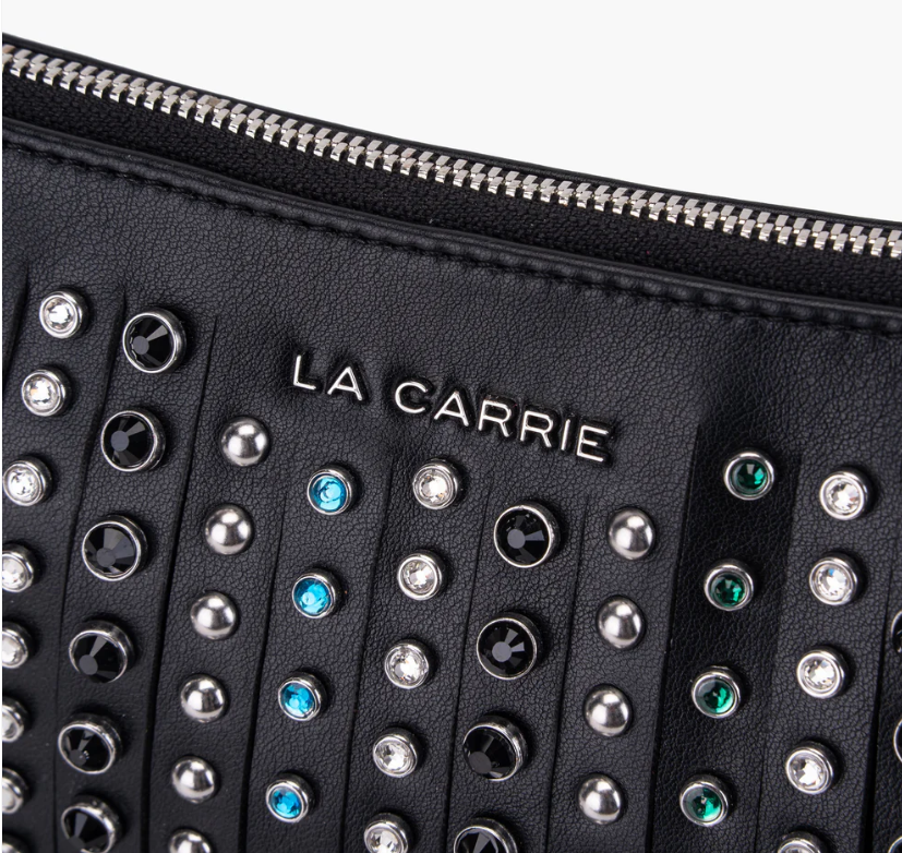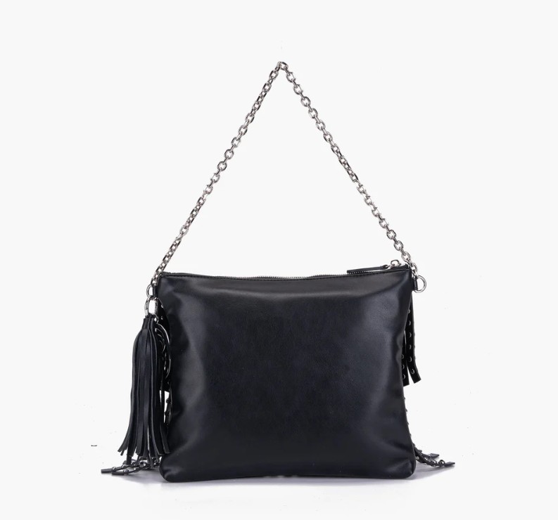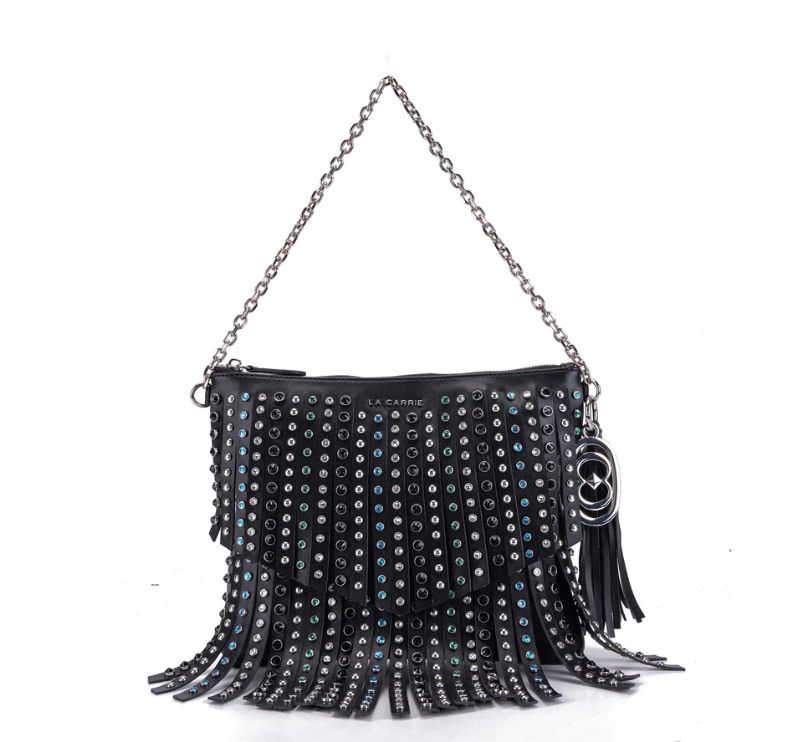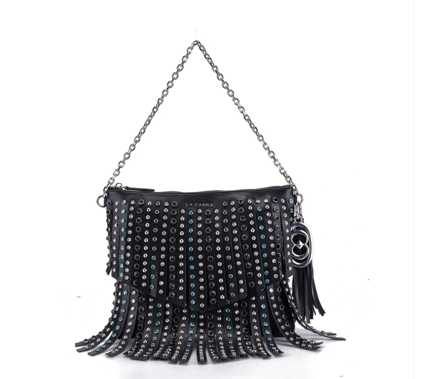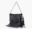 Small fringed eco-leather bag with multicolored rhinestones, zip closure and chain handle