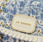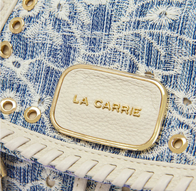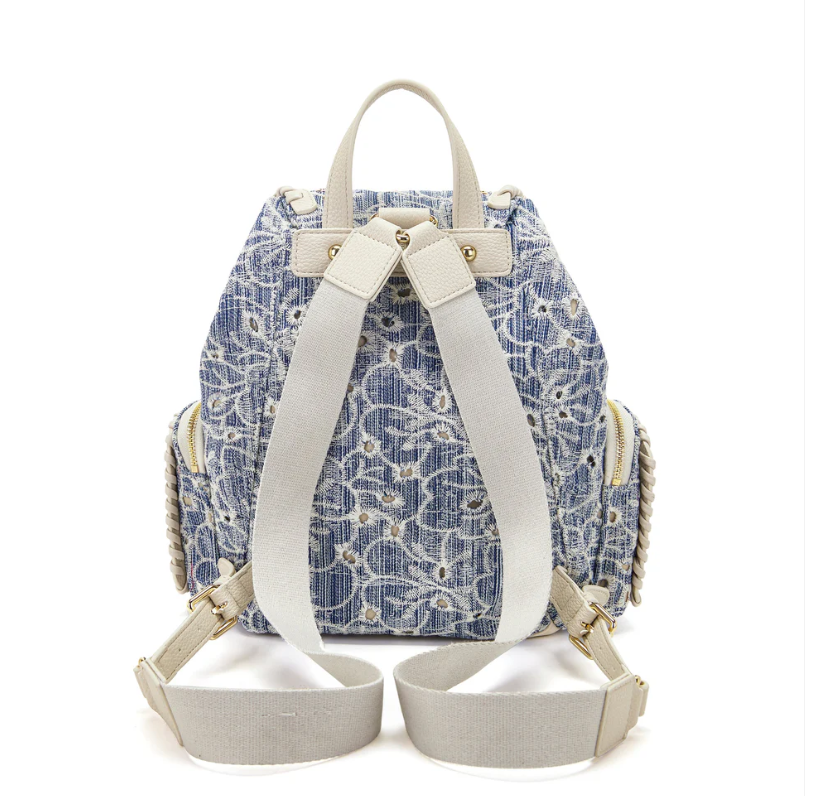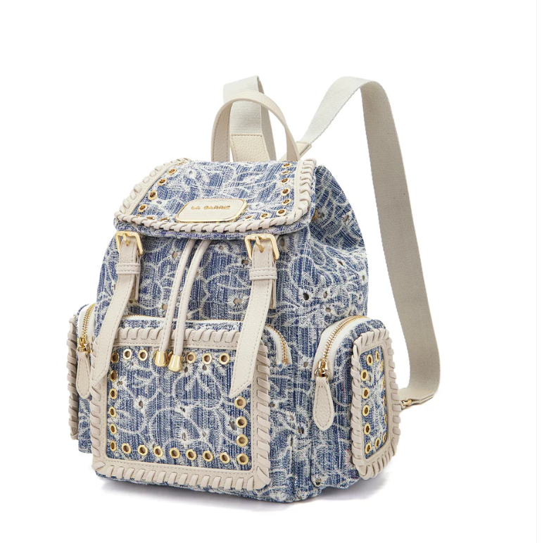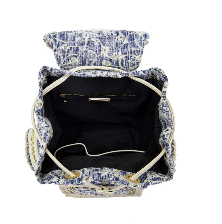 Embroidered denim backpack with applied eyelets