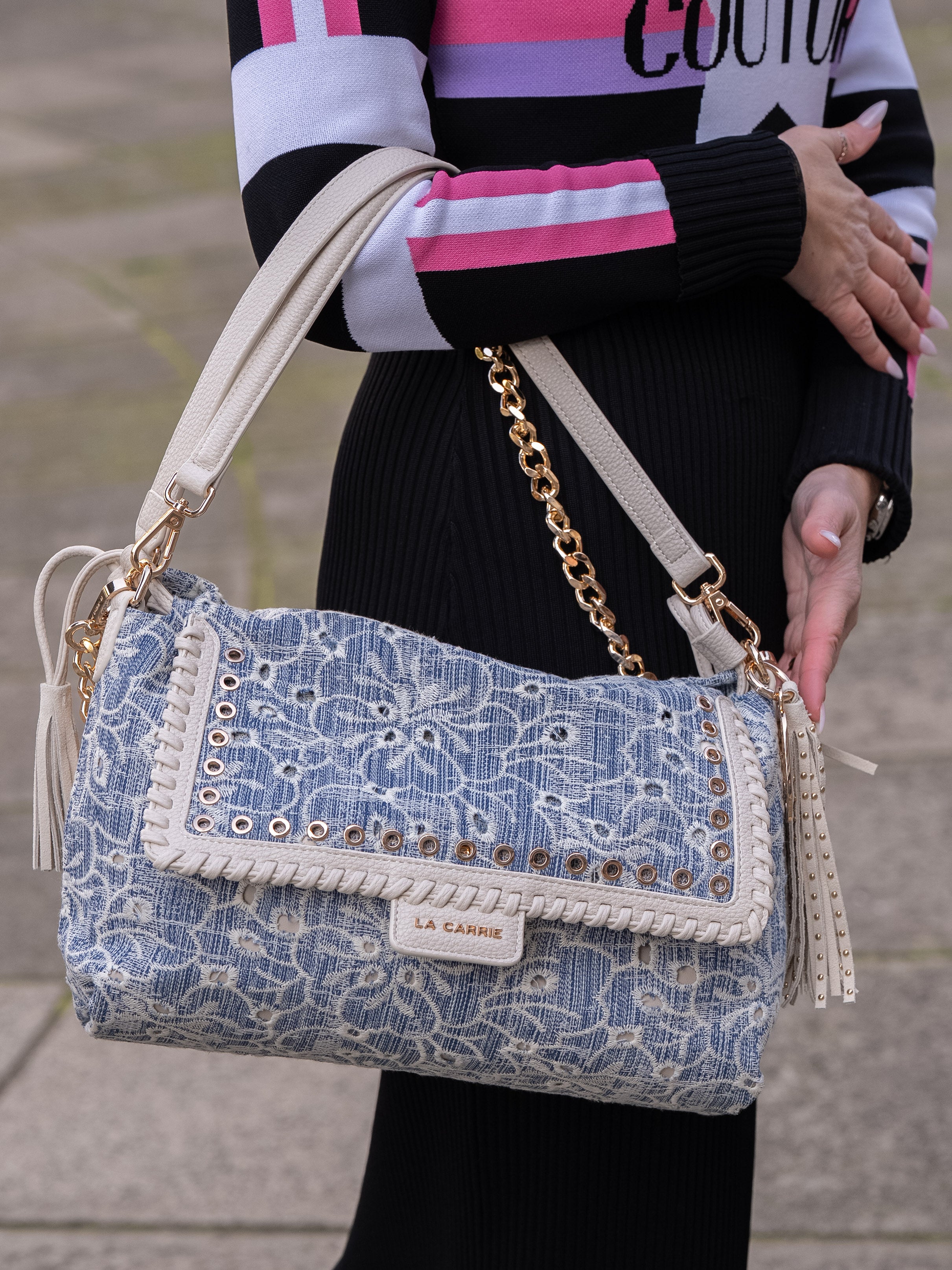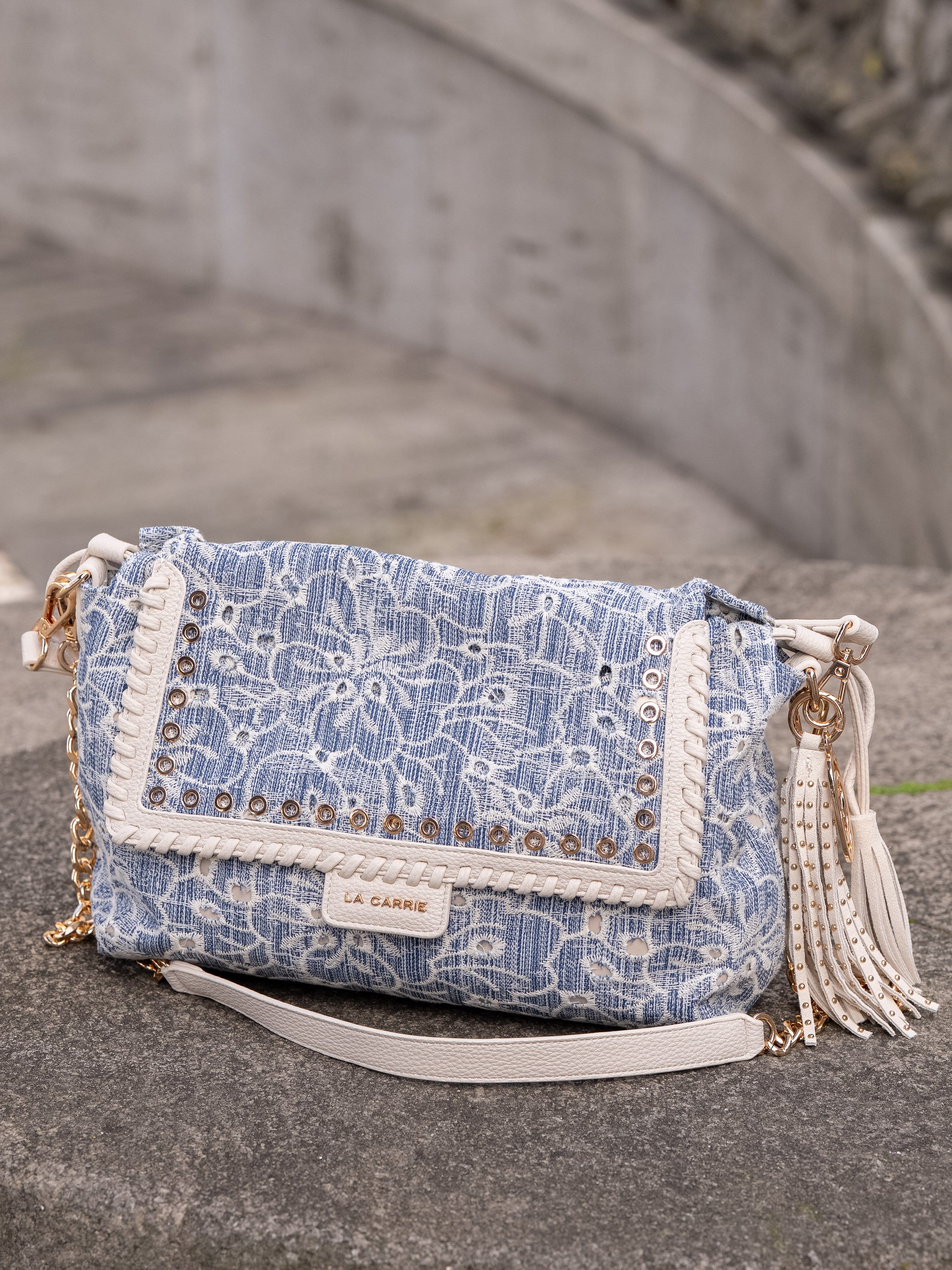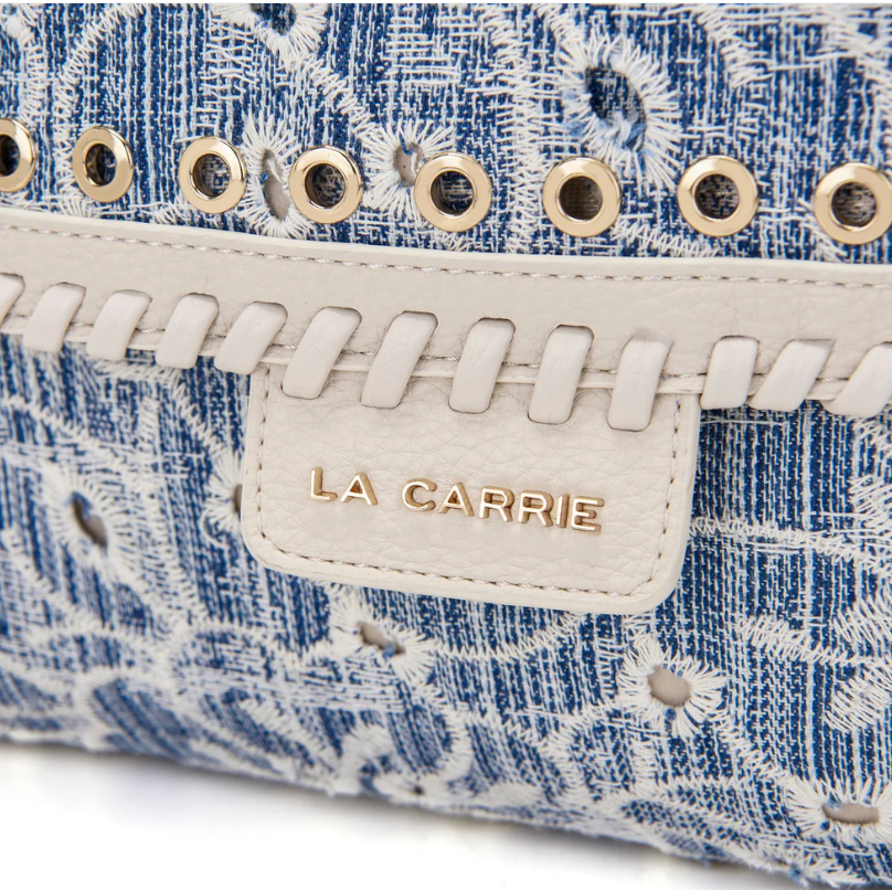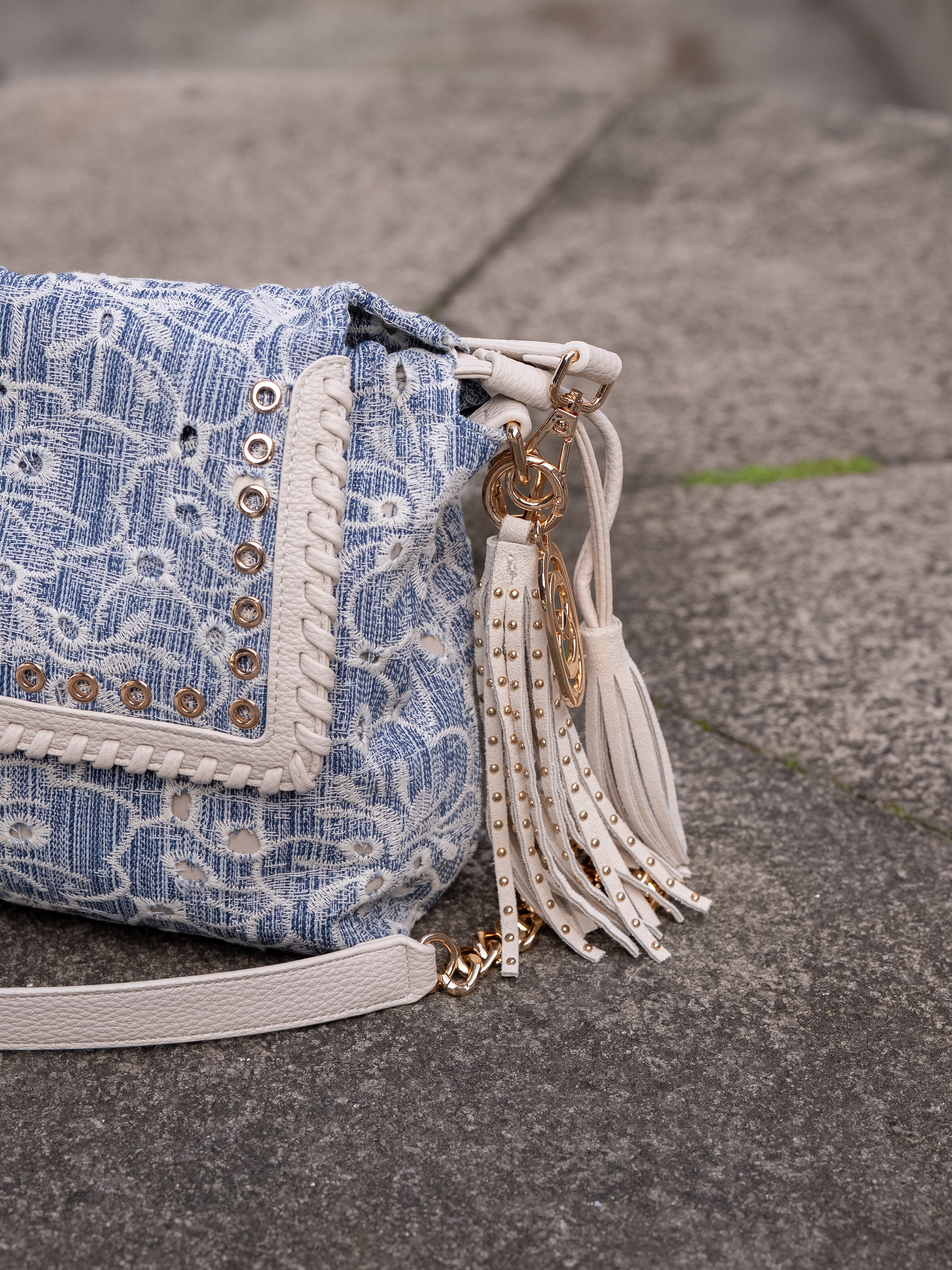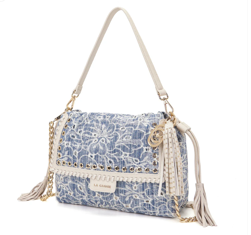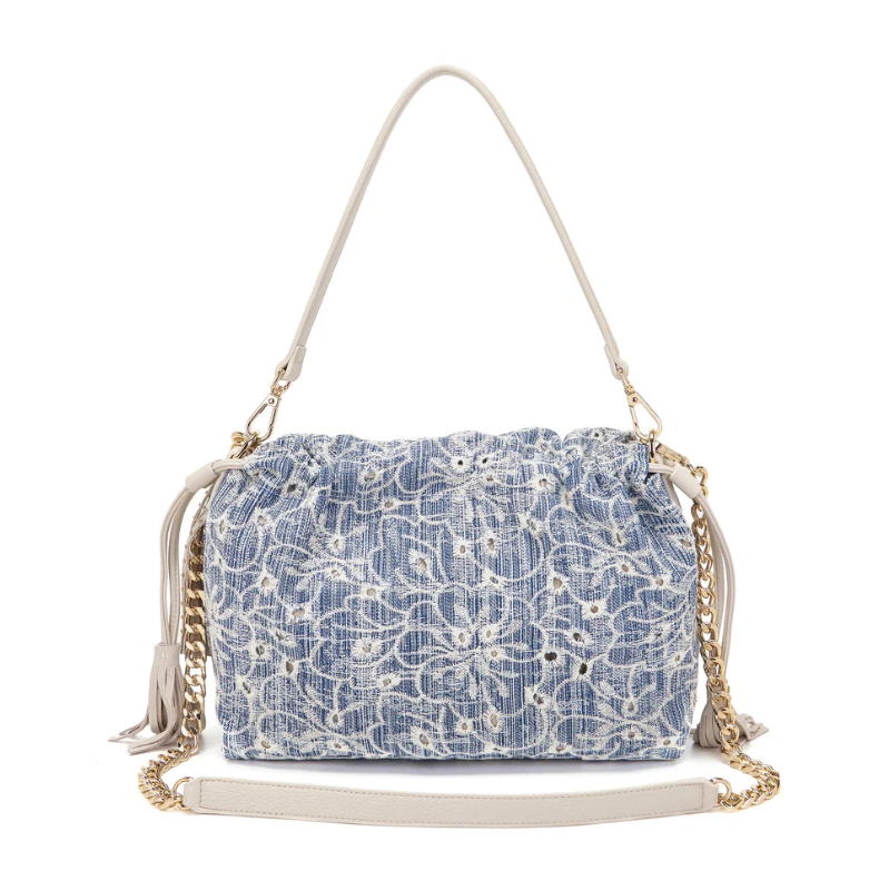 Shoulder bag in embroidered denim fabric, with applied eyelets and PU profiles on the flap, removable handle and shoulder strap