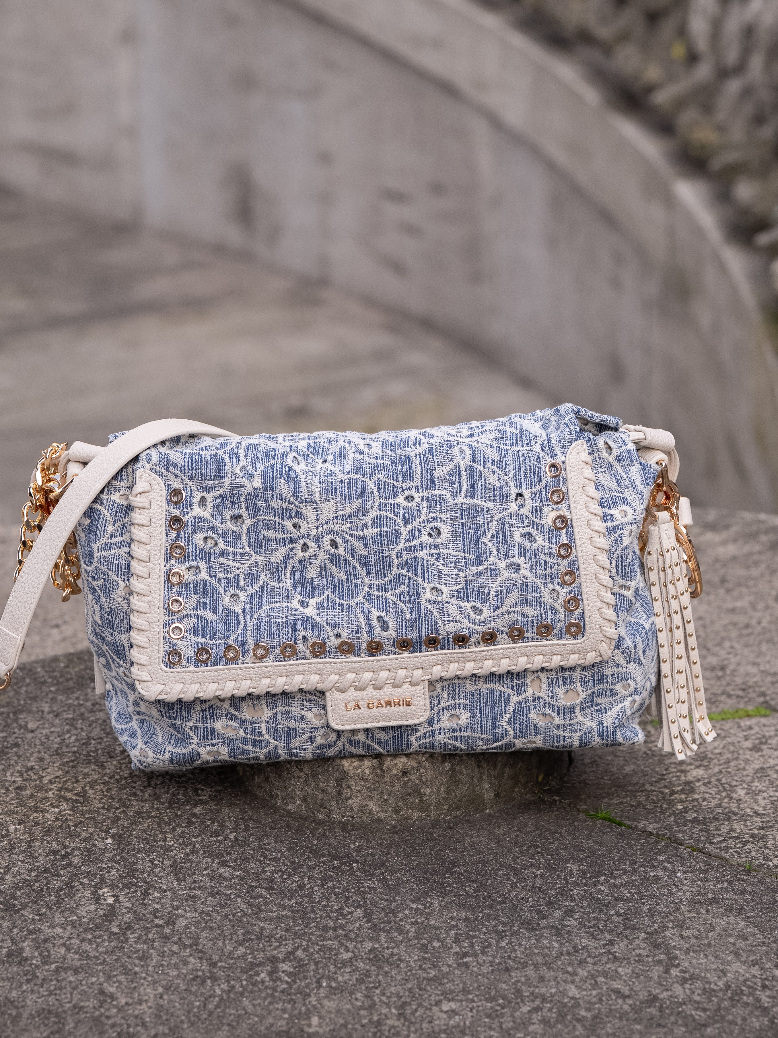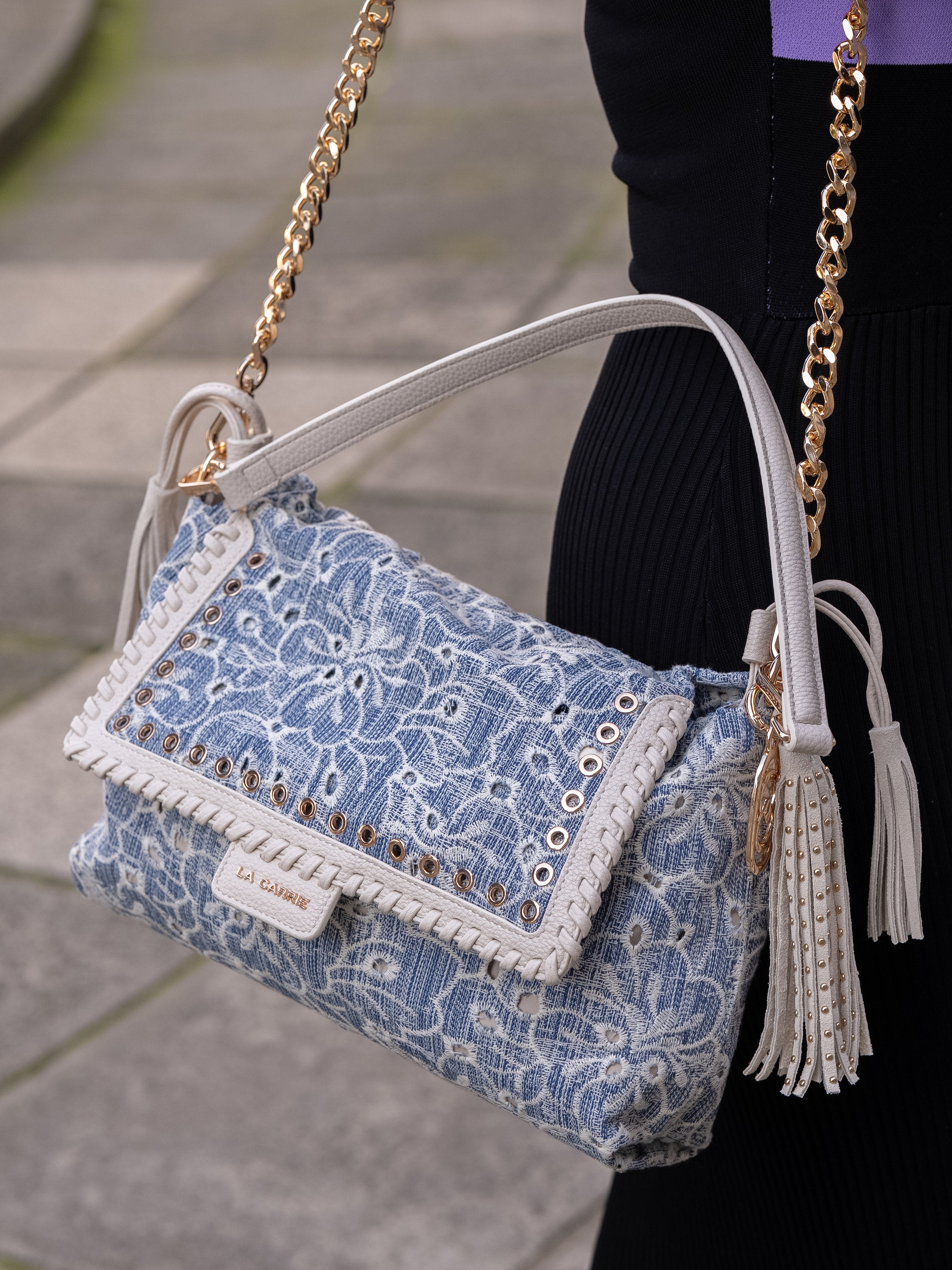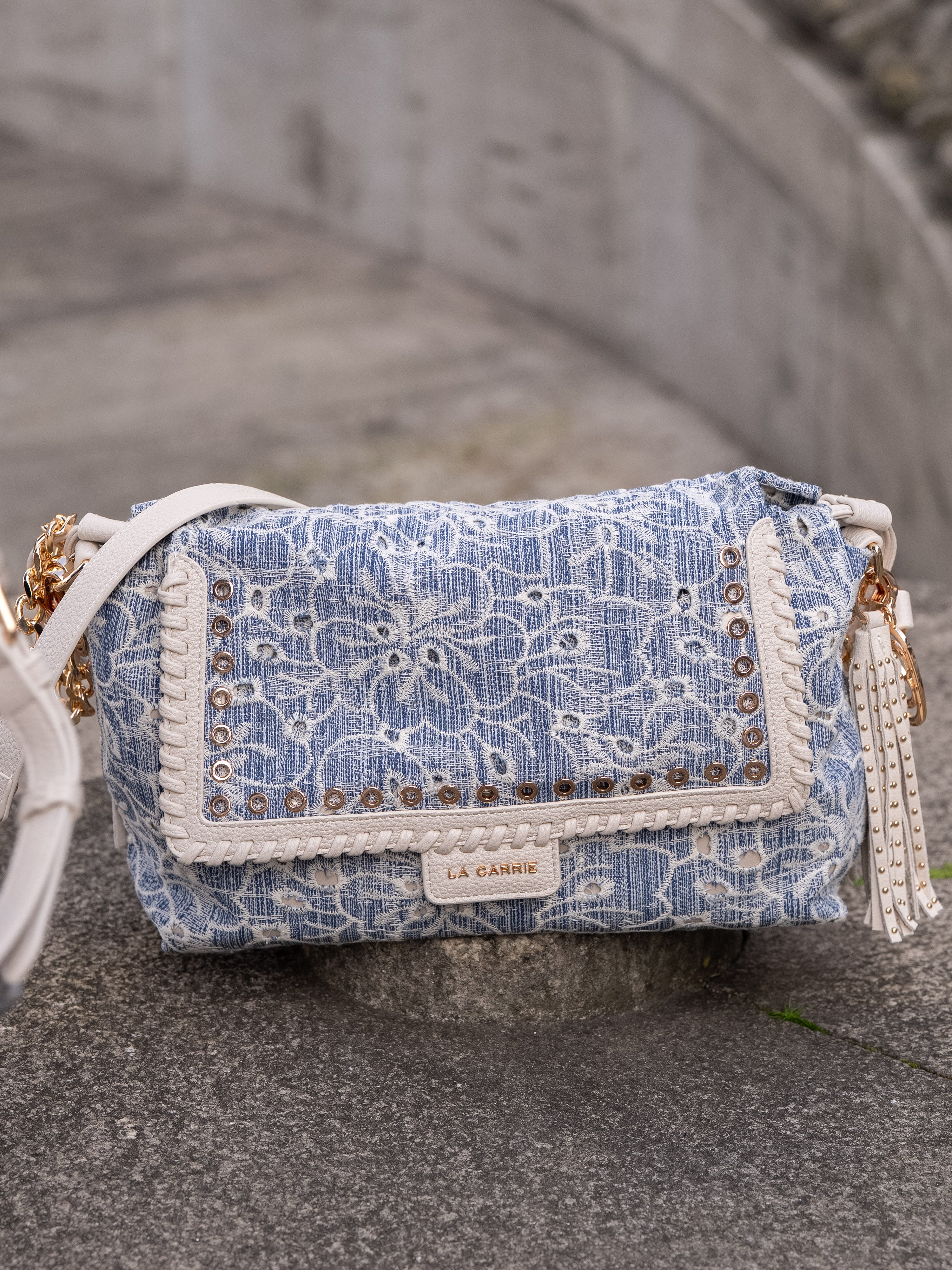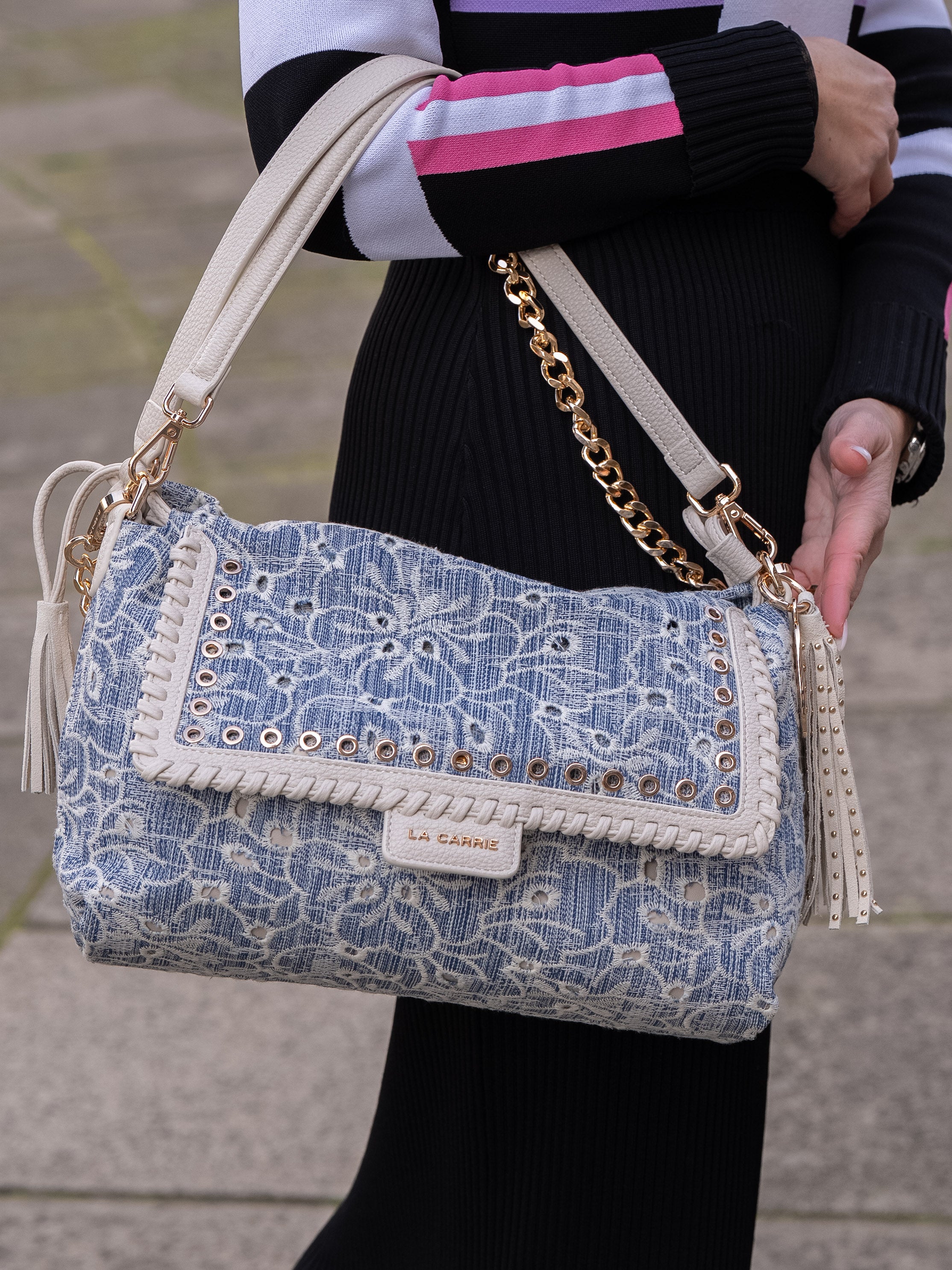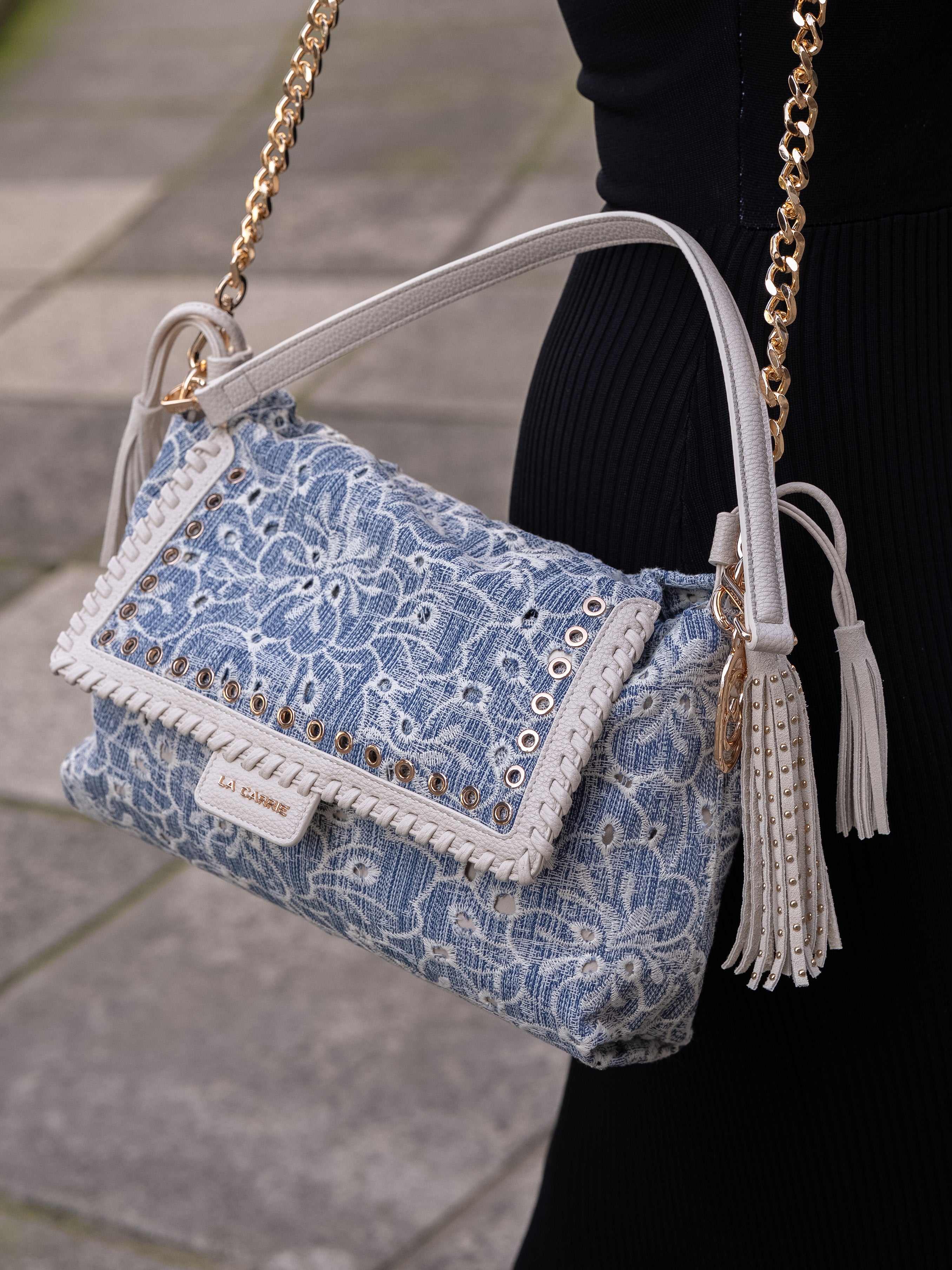 Shoulder bag in embroidered denim fabric, with applied eyelets and PU profiles on the flap, removable handle and shoulder strap