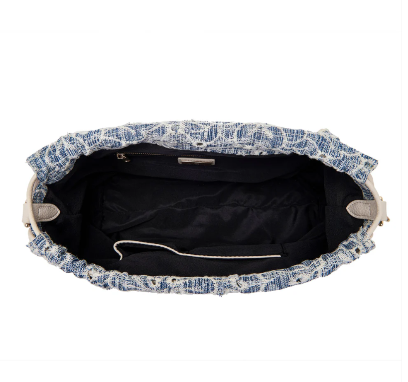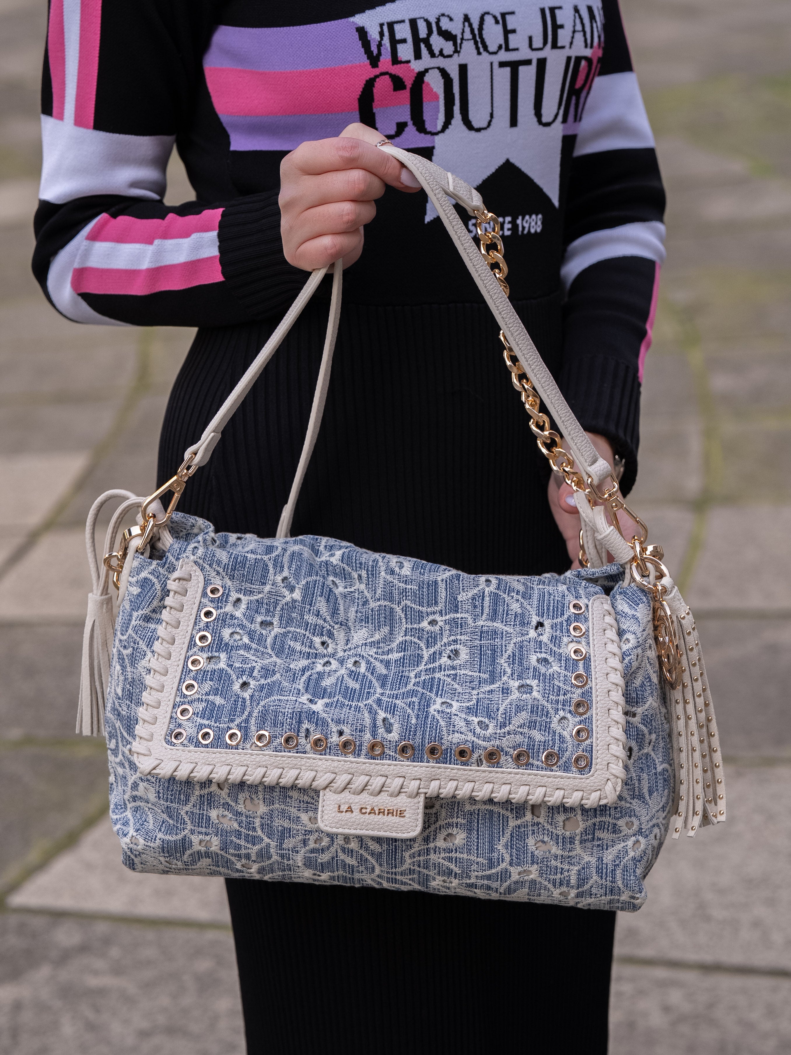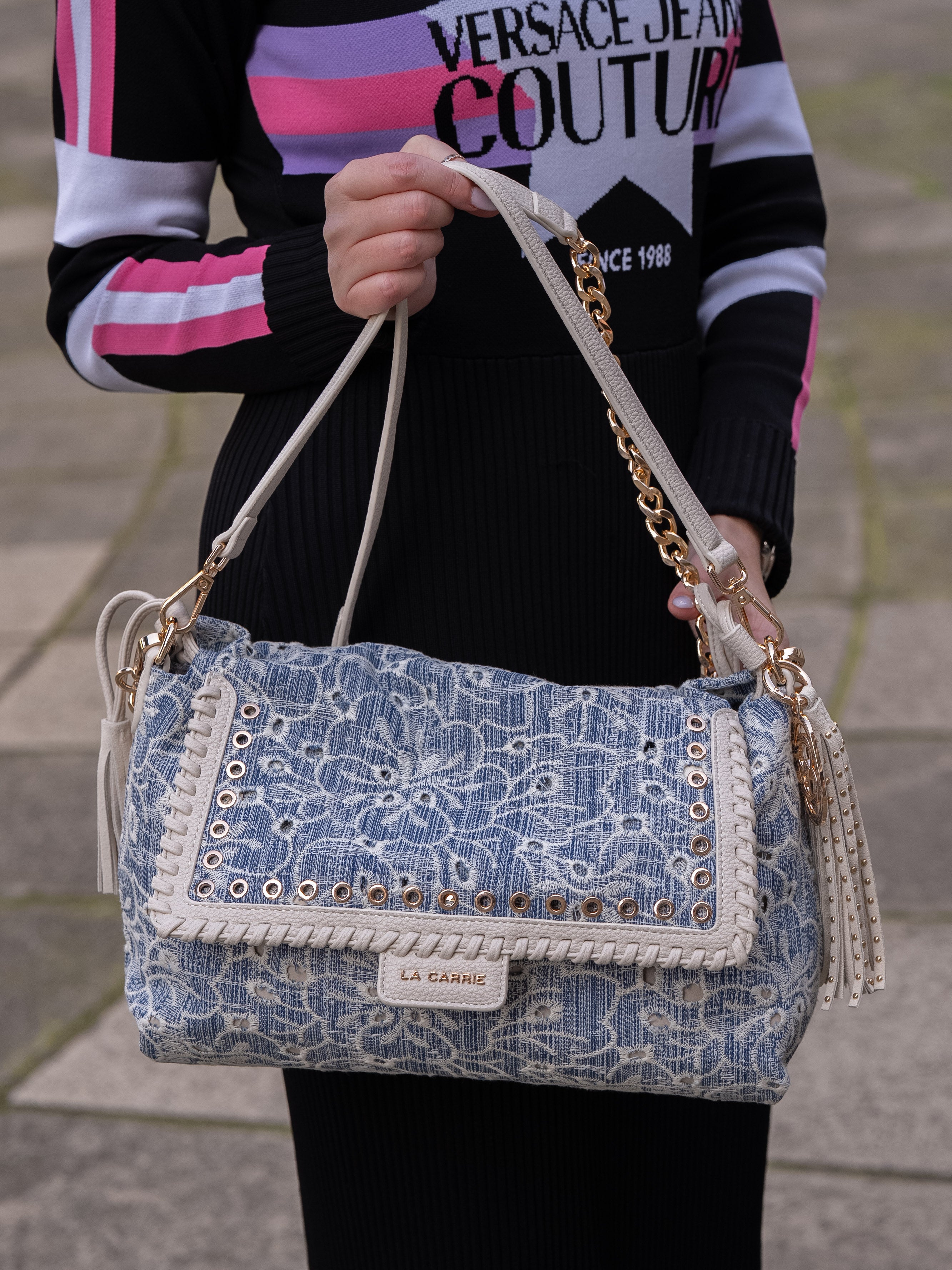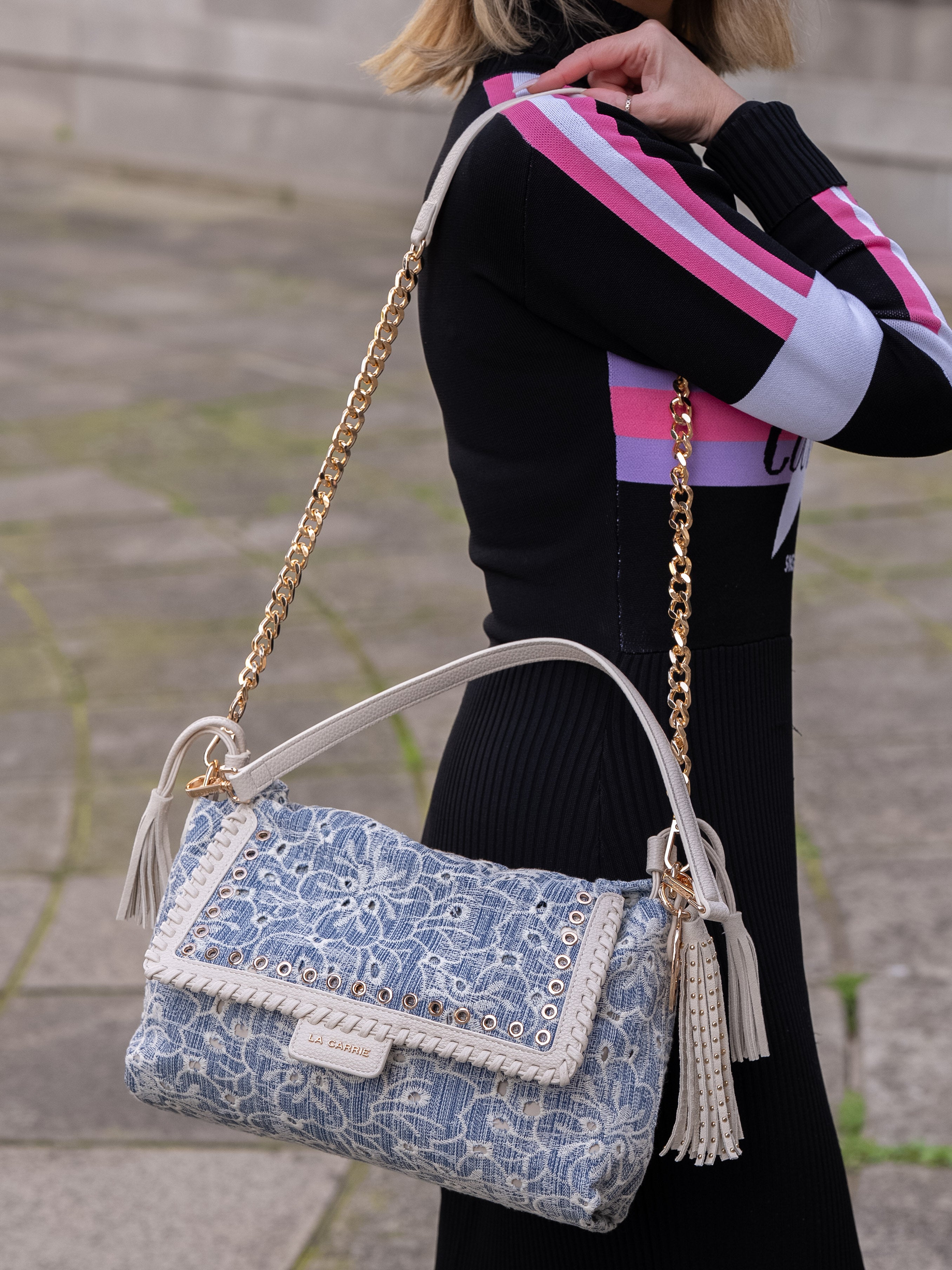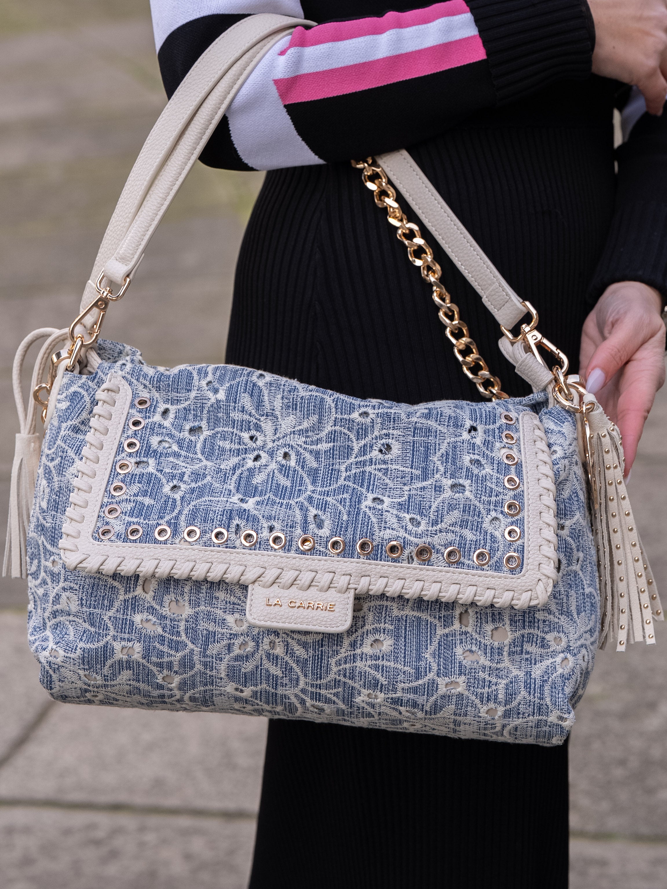 Shoulder bag in embroidered denim fabric, with applied eyelets and PU profiles on the flap, removable handle and shoulder strap