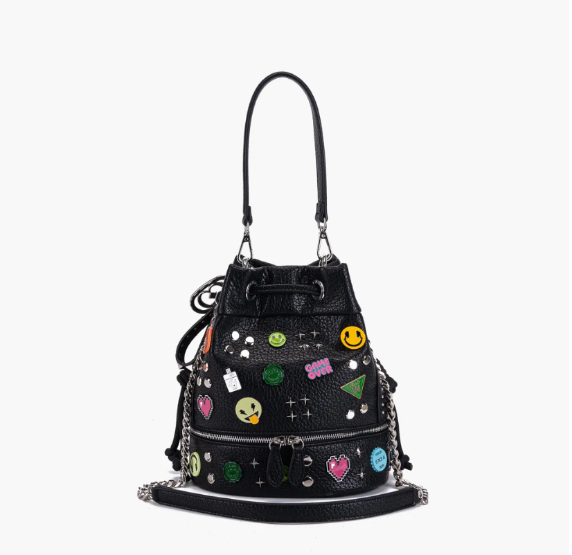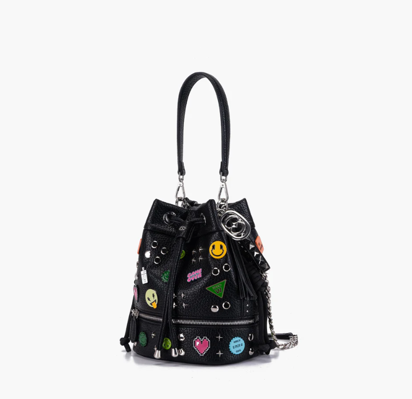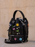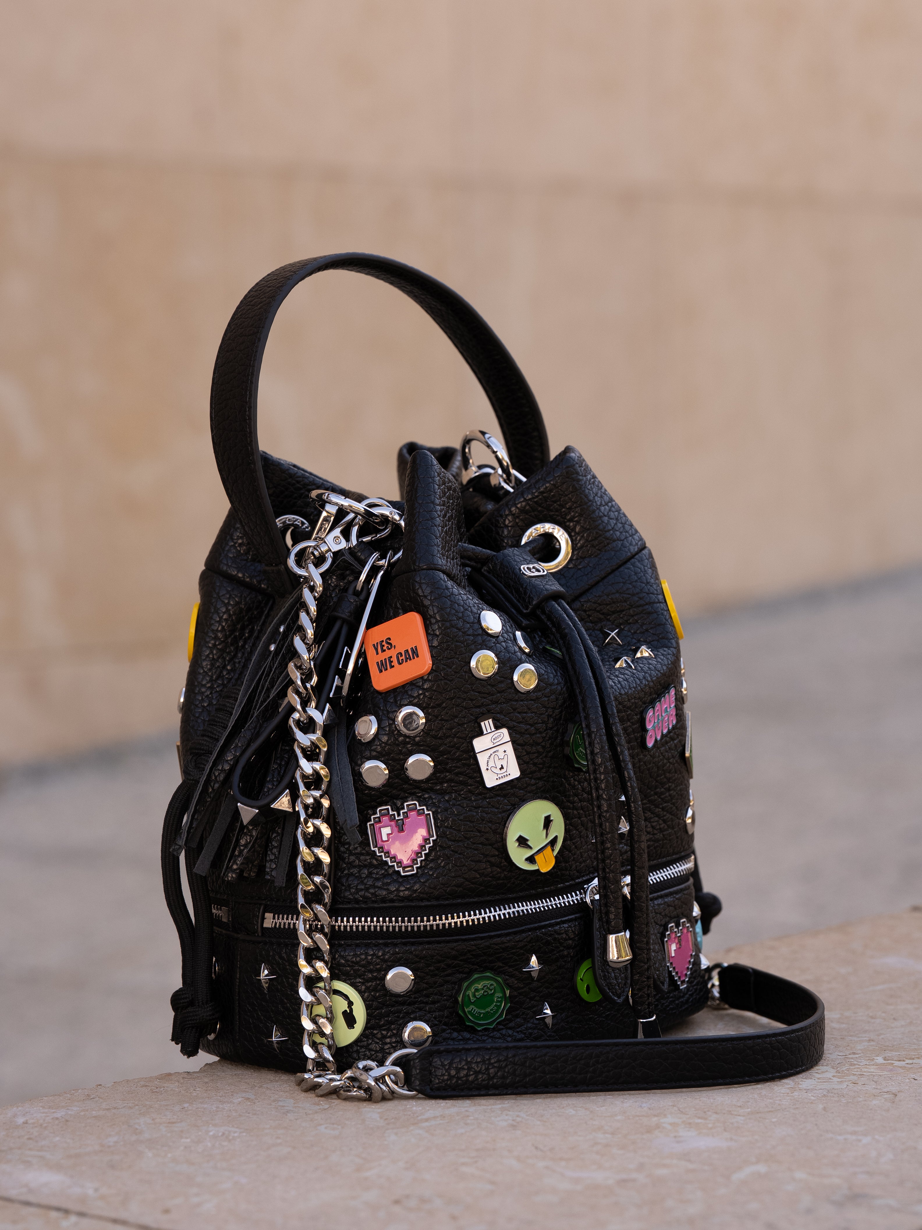Hammered eco-leather bucket with colored pins applied, removable handle and shoulder strap