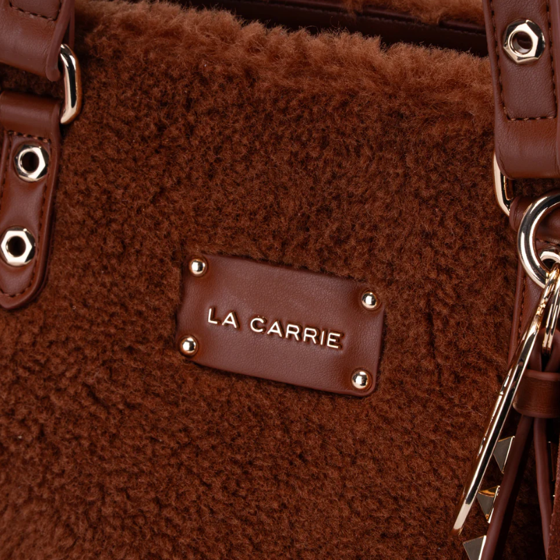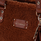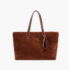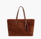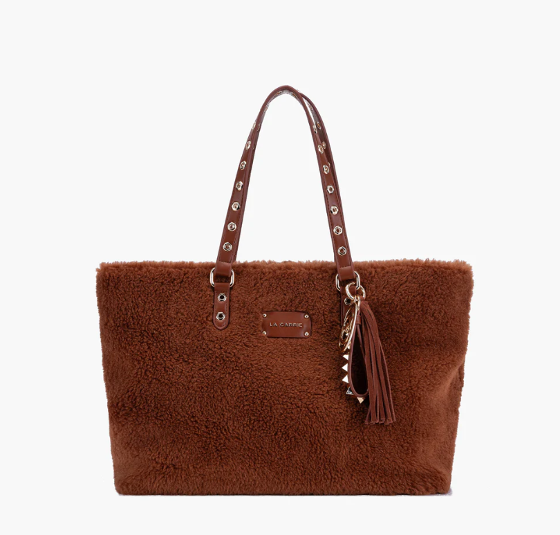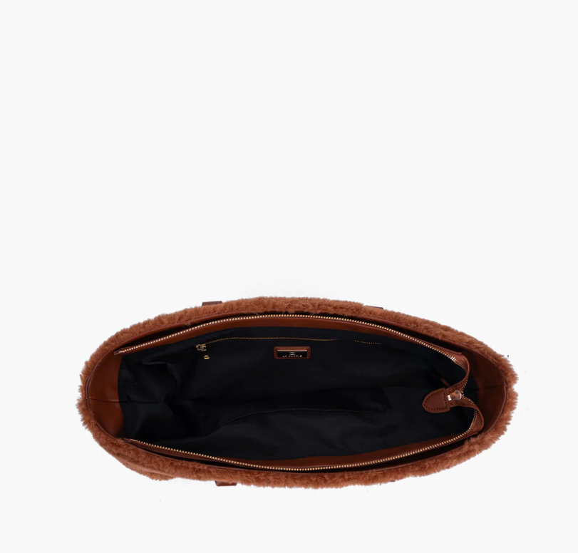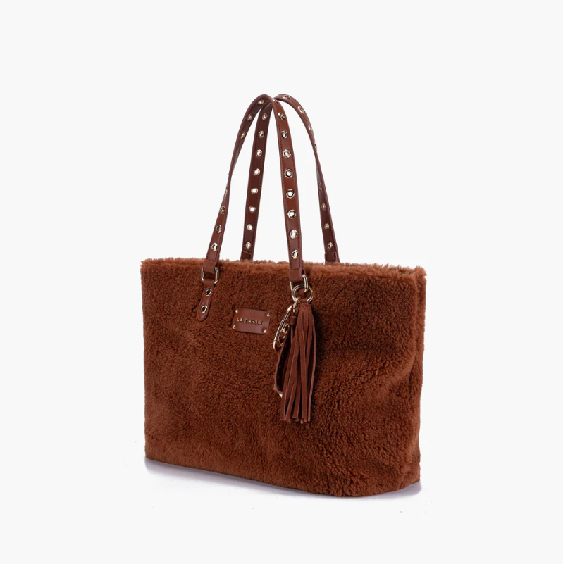 Faux fur shopping bag with double faux leather handles with applied eyelets, removable shoulder strap