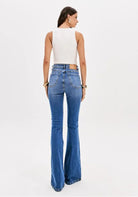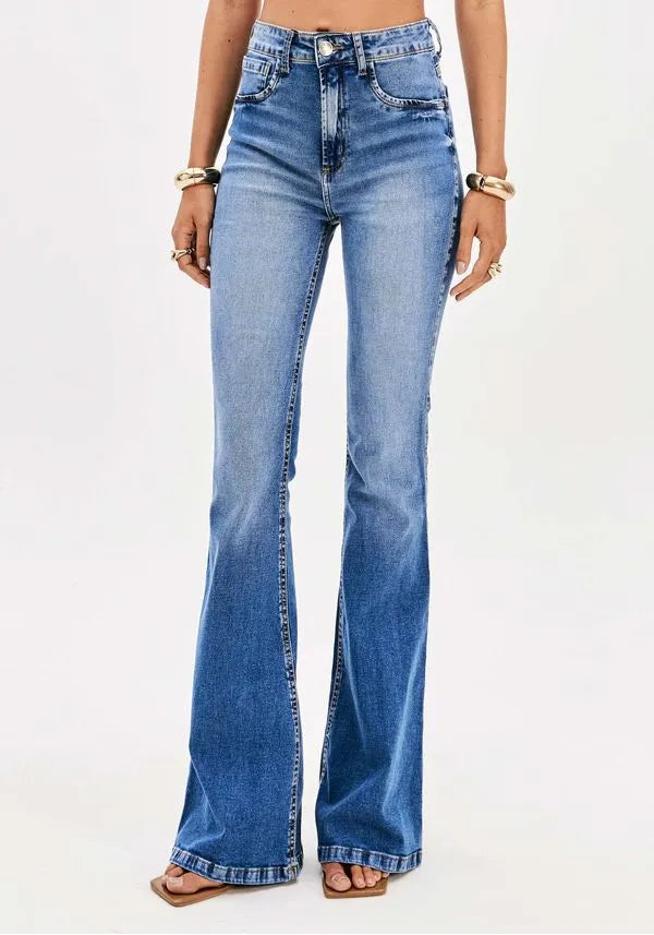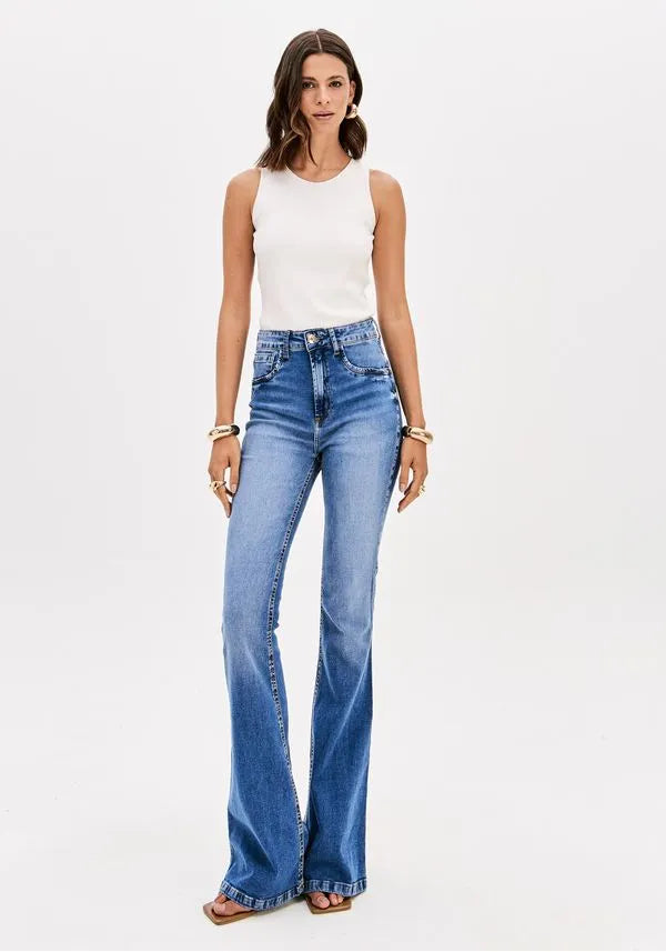 A calça flare confeccionada em jeans com elastano traz cintura super alta e corte justo até os joelhos, abrindo suavemente em direção à barra. Bolsos funcionais e fechamento clássico com botão e zíper completam a peça. Aposte para alongar a silhueta!
