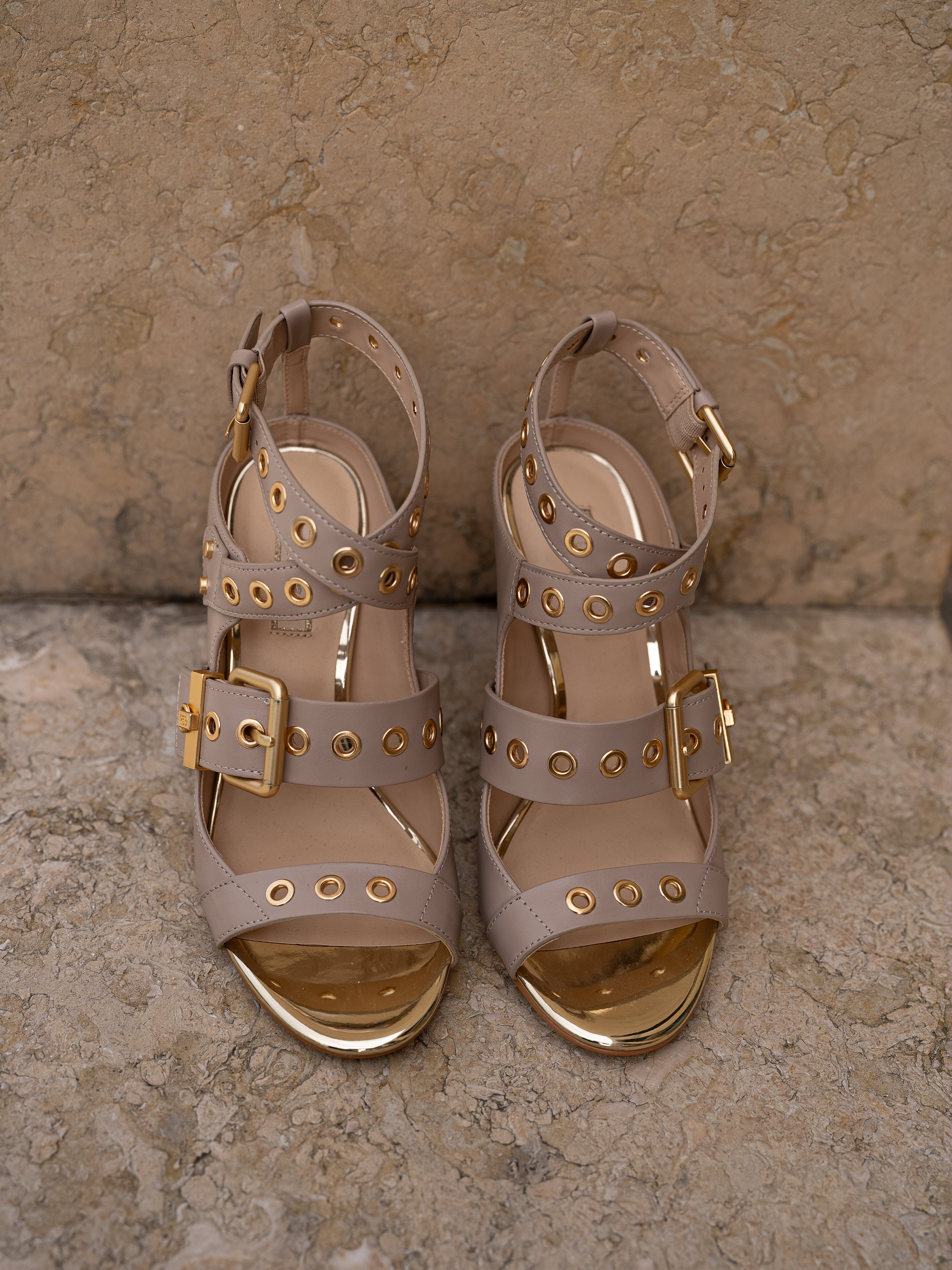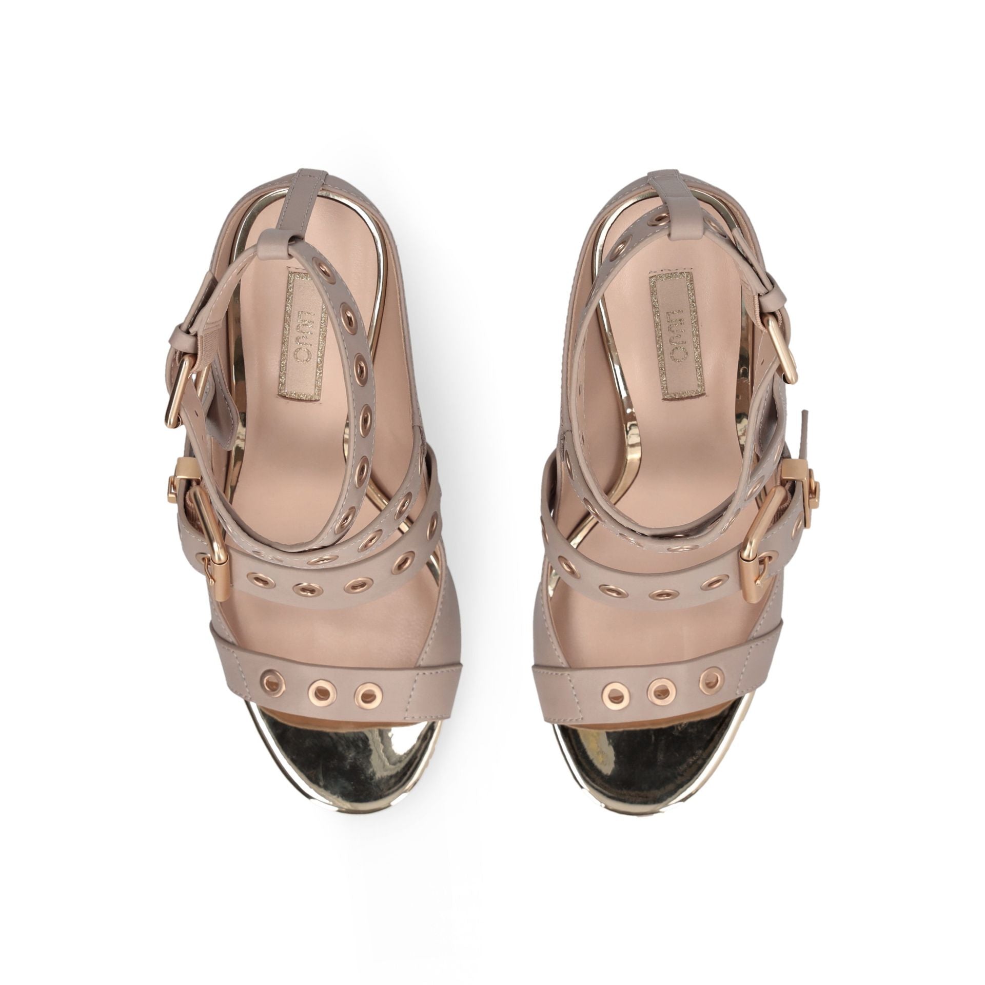 - Straps with decorative eyelets and buckles