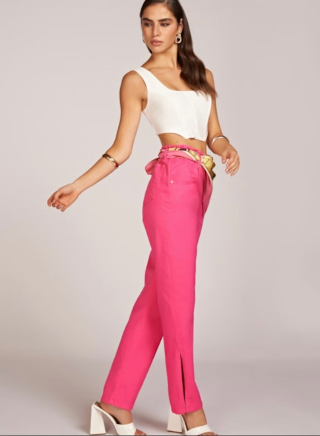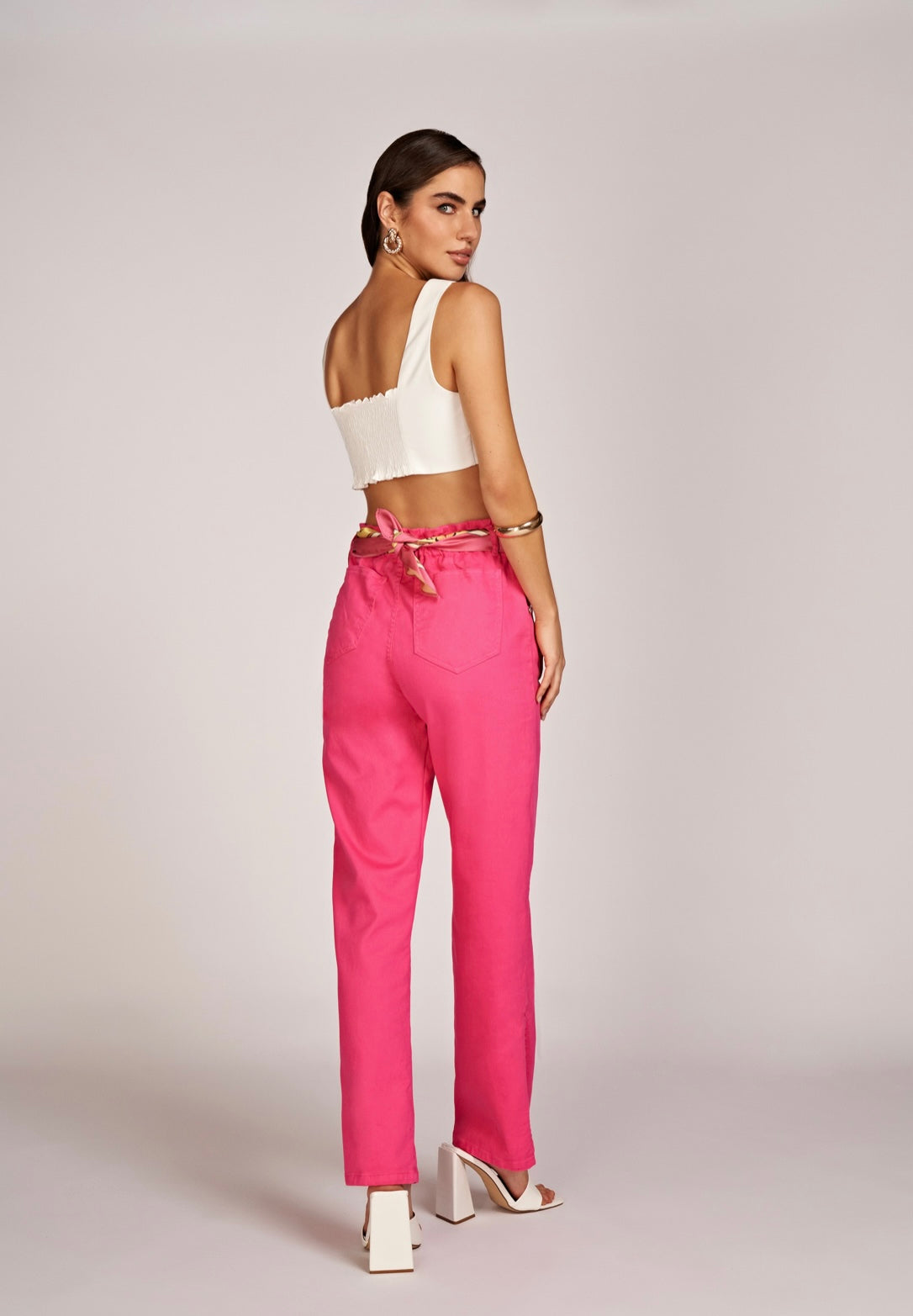 Calças de ganga de cintura subida e elástica. Pormenor de abertura em forma de coração, à frente, numa das pernas e de aberturas laterais. Bolsos laterais à fente e bolsos atrás.