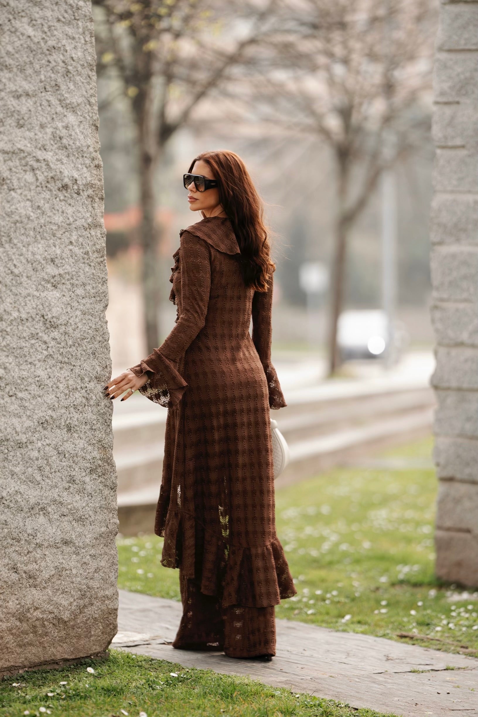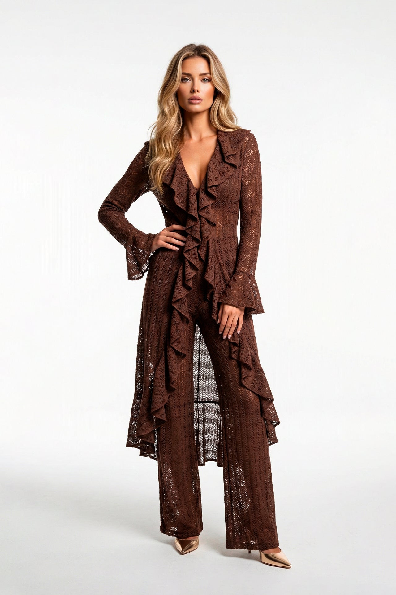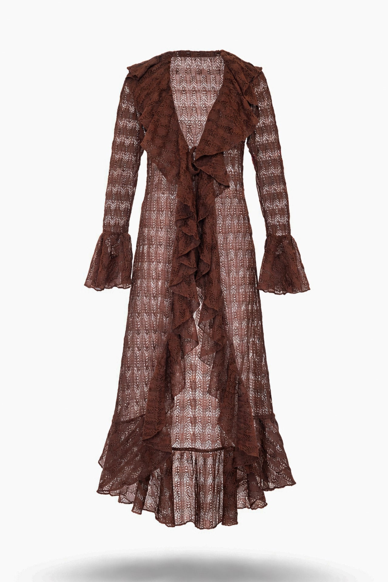 Casaco comprido em renda com transparência subtil. Design de frente aberta com folhos ao longo do decote e acabamento inferior, e mangas compridas com punhos em folho. Ideal para sobreposição, do dia à noite.