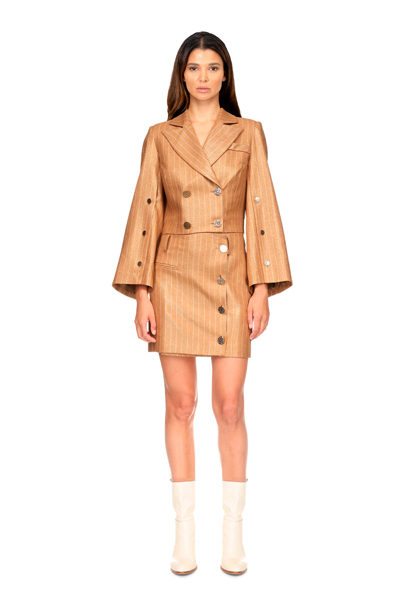 O tecido traz profundidade ao design, enquanto os botões dourados frontais adicionam um charme intemporal e exclusivo. Com um bolso embutido lateralmente, a peça combina funcionalidade e estilo. A saia tem cintura alta e um corte que valoriza a silhueta, ideal para ocasiões formais ou um look casual-chique.