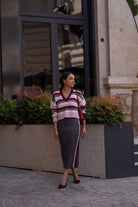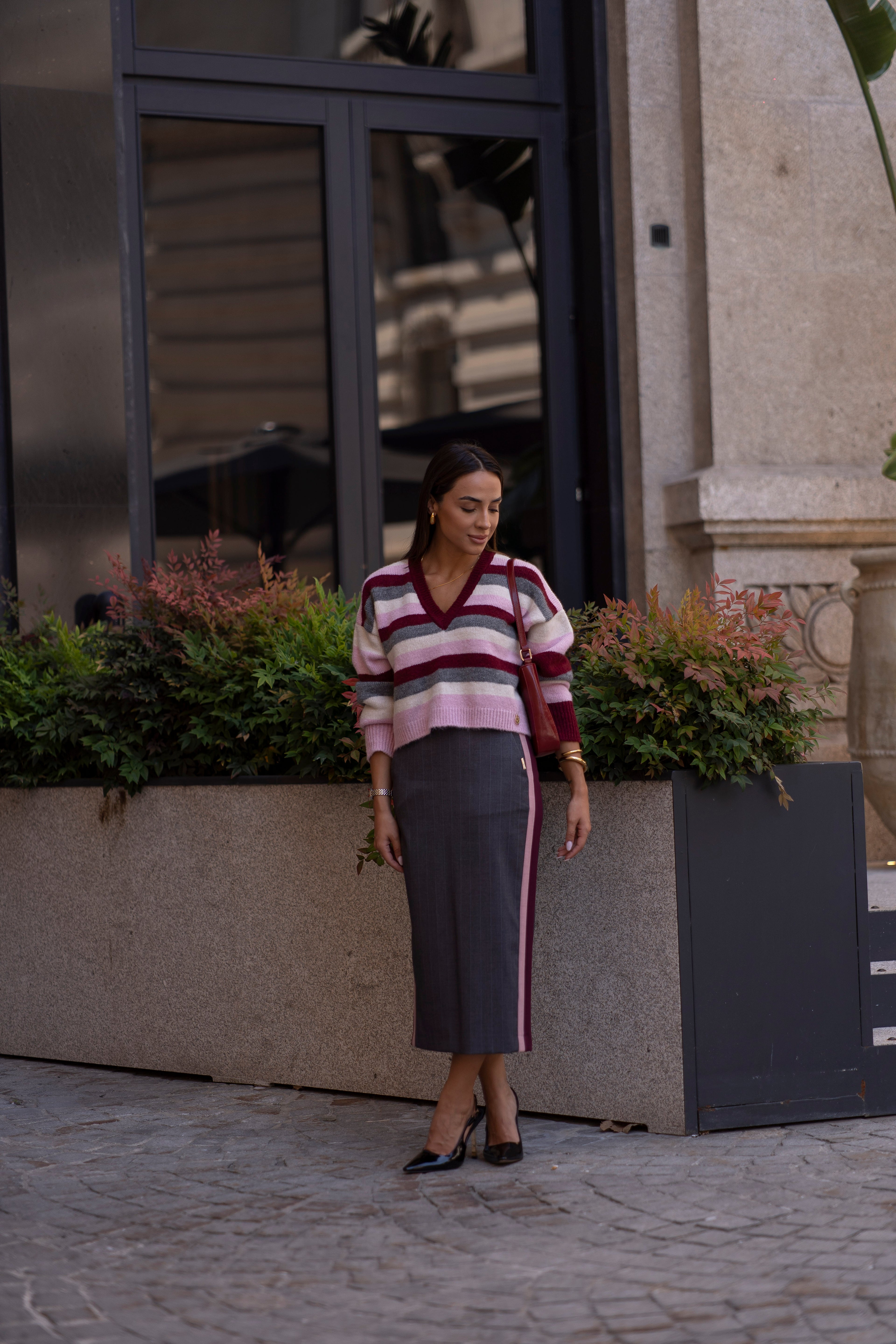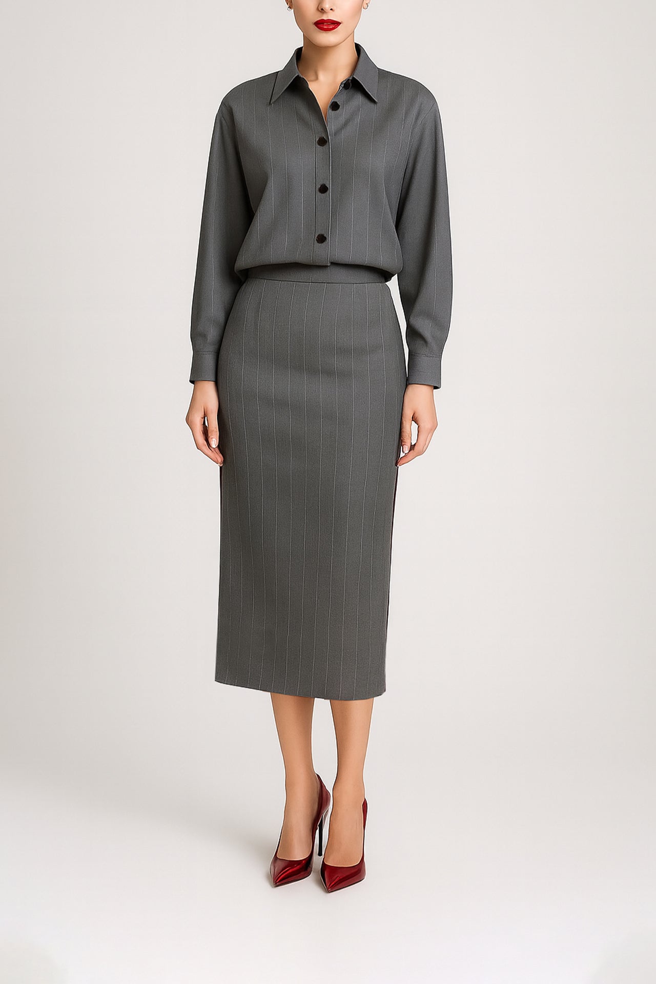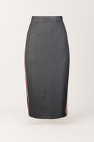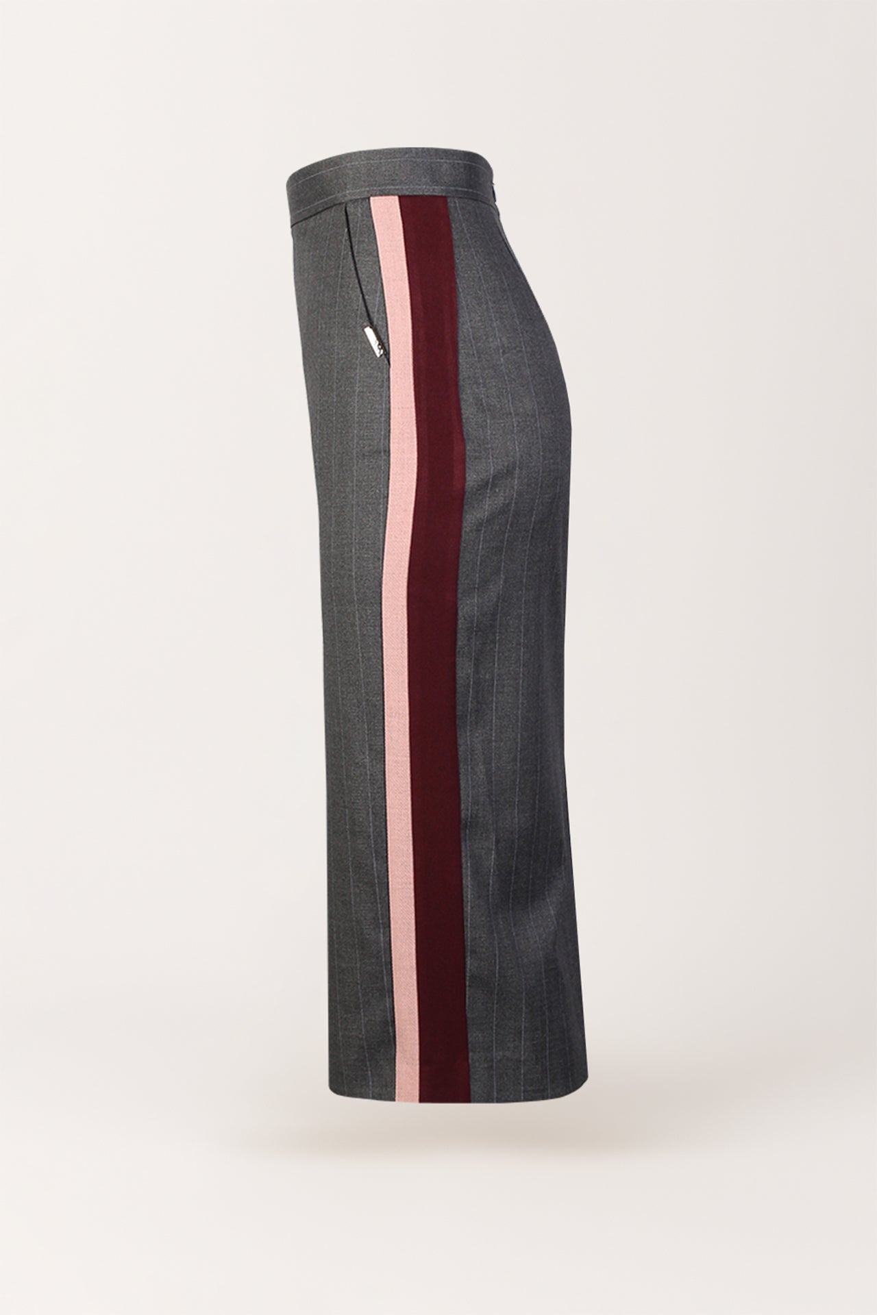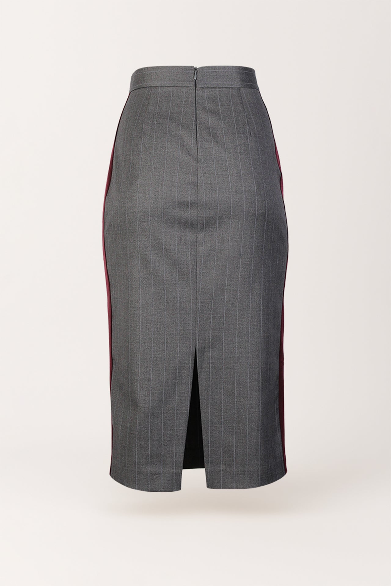 Saia lápis em tecido de alfaiataria com padrão risca de giz. O corte ajustado realça a silhueta, enquanto as faixas laterais em contraste acrescentam verticalidade e modernidade. Fecho traseiro e racha discreta garantem conforto e movimento.