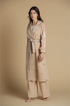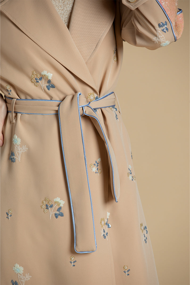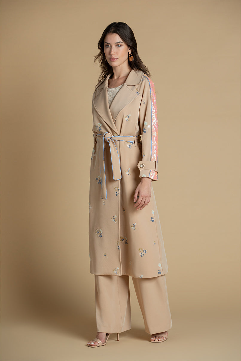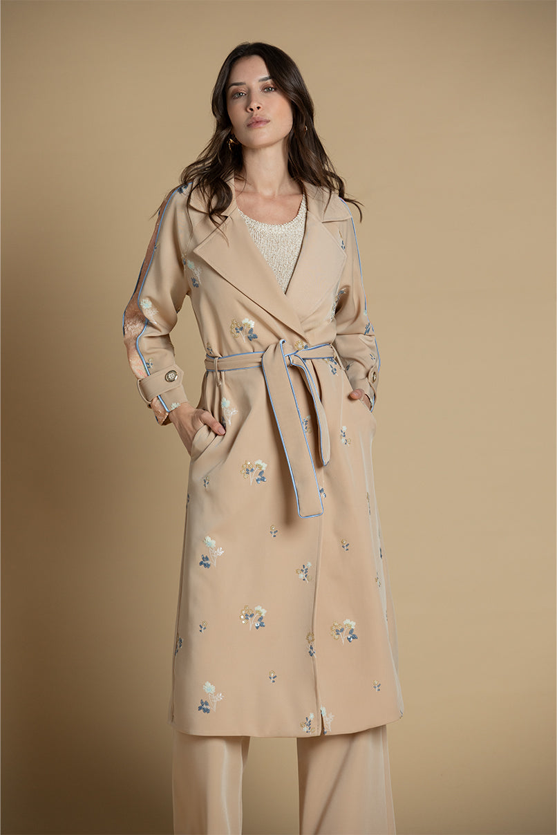 Gabardine Trench com bordados em lantejoulas.Cinto laço no mesmo tecido. A modelo mede 1,80m e veste o tamanho S.