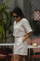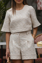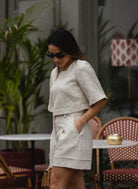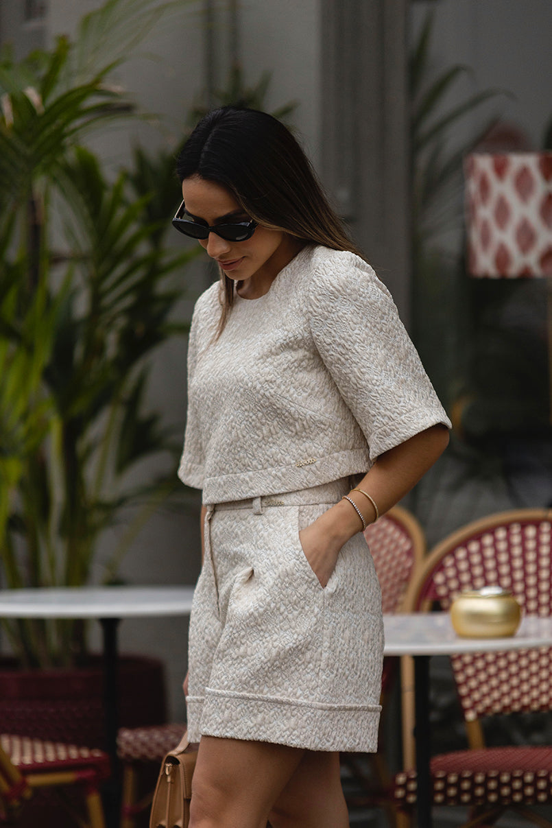 Calções bermuda confecionados em tecido jacquard. Cintura subida com pinças à frente. Bolsos laterais. Bainha em dobra Fecho de correr e botão.