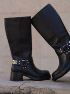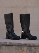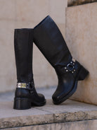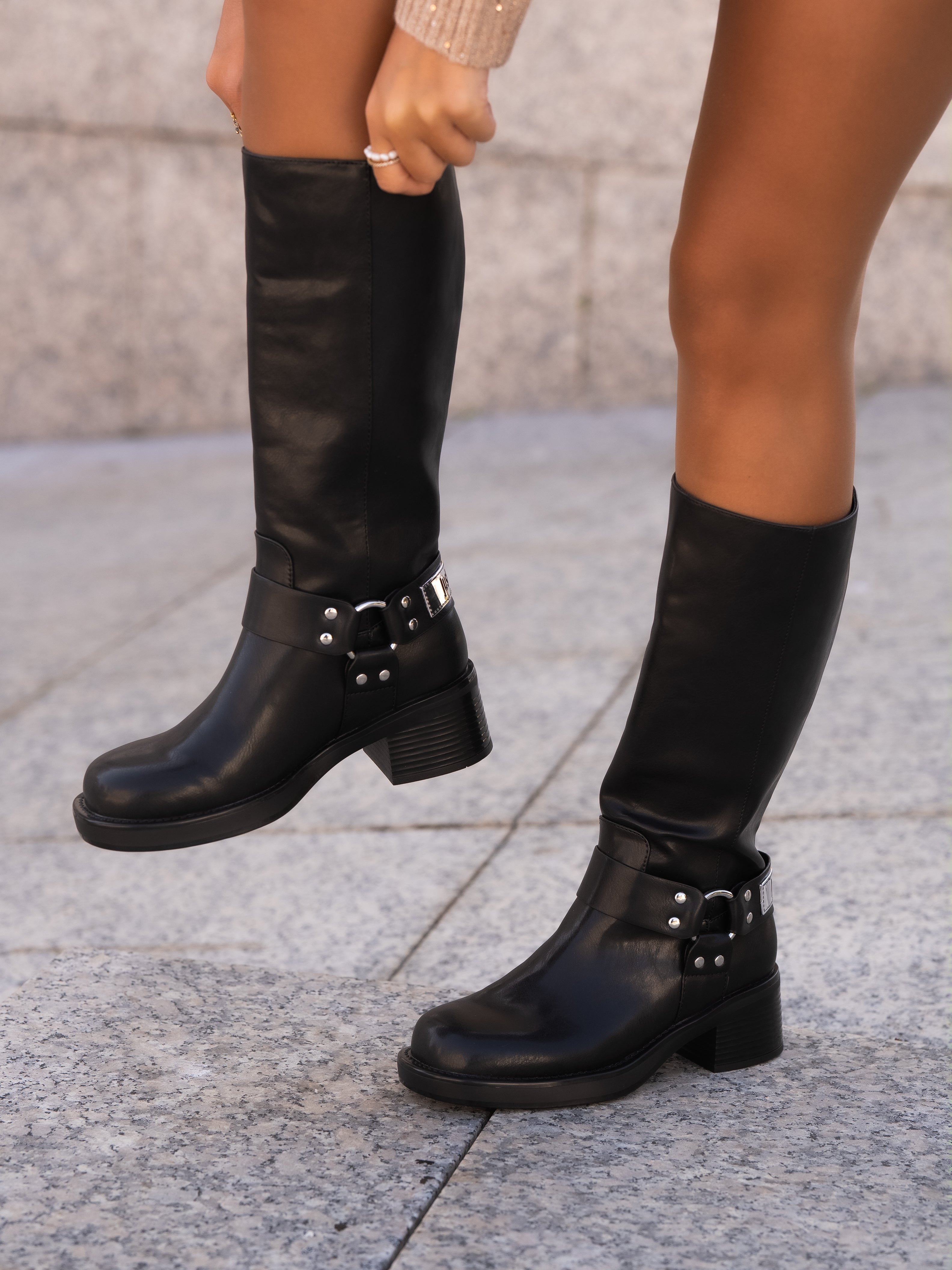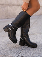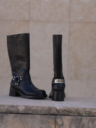 Black PU and Suede Mid-Calf Boot with Metal Harness Detail