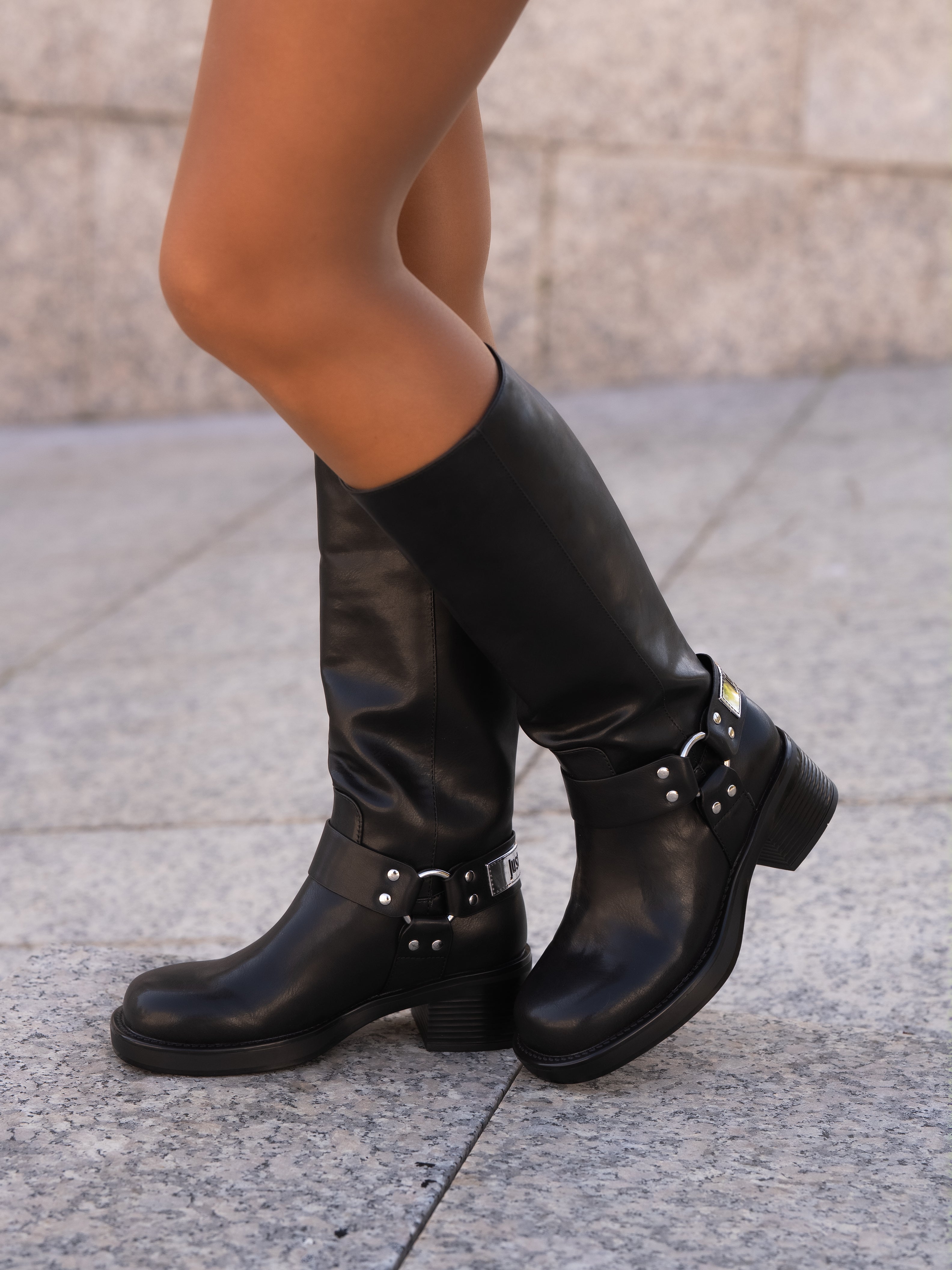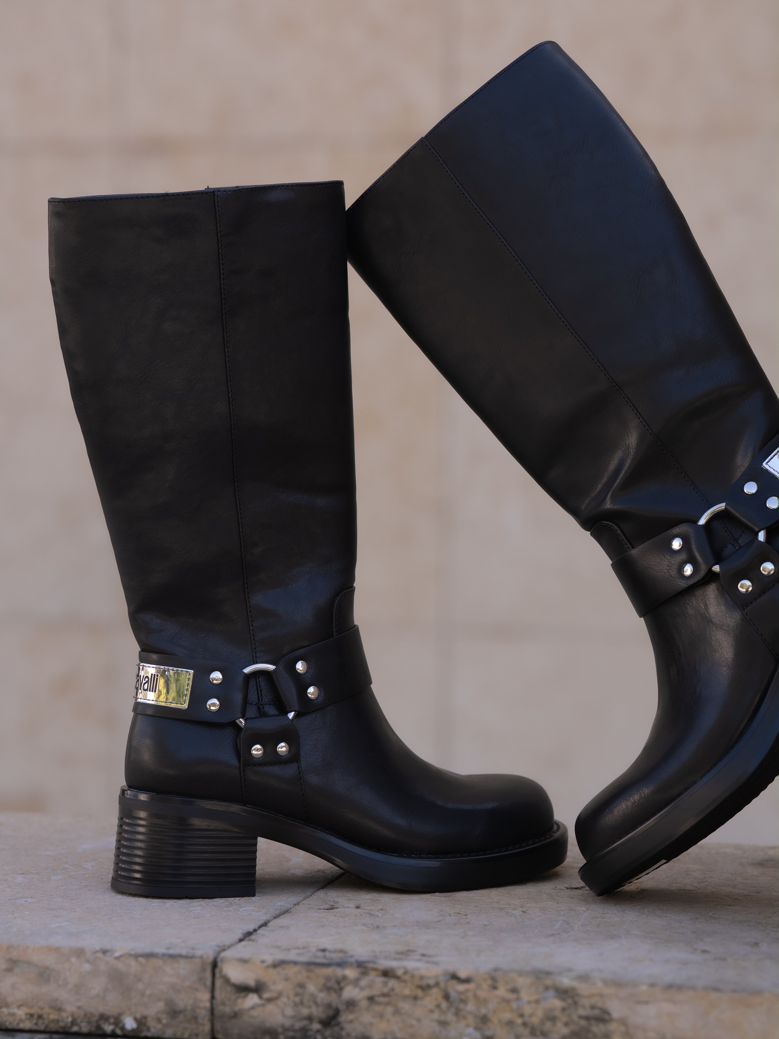 Make a bold statement with this black mid-calf boot from Just Cavalli, blending edgy style with everyday wearability. Crafted from a combination of smooth leather and soft suede, the boot features a chunky block heel and rounded toe for added comfort. The standout element is the metallic harness detail at the ankle, bringing a touch of rock-inspired glamour to this versatile piece. Perfect for adding attitude to both casual and dressed-up looks.