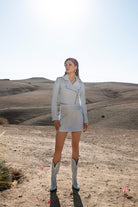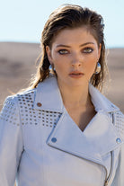 Blusão de gola de abas. Manga comprida com fecho. Fecho frontal cruzado com fecho de correr. Pormenores de aplicações em tachas metálicas