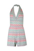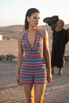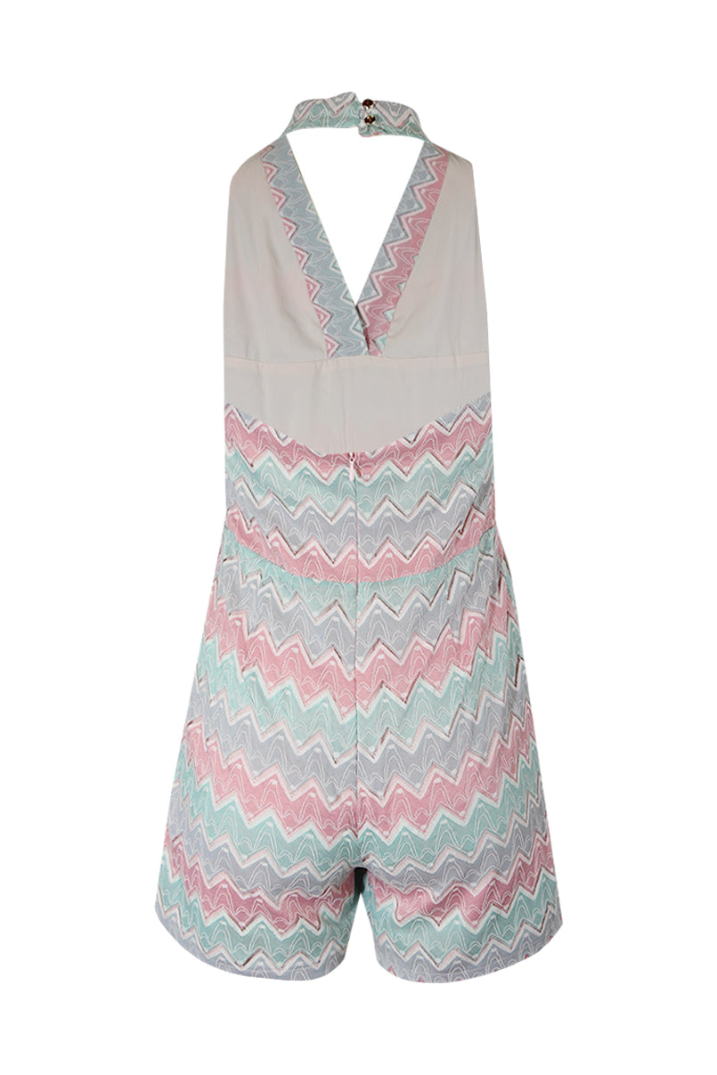 Jumpsuit curto confecionado em tecido jacquard. Bolsos laterais. Costas abertas. Fecho atrás com botão e fecho de correr. Com forro.