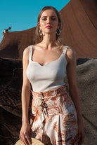 Top em malha canelada com fio metalizado. Decote coração e alça.
