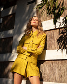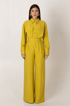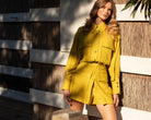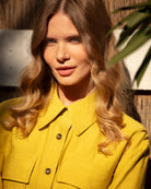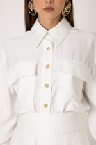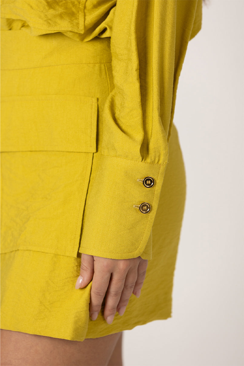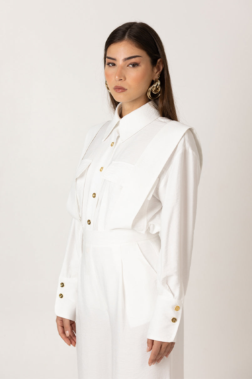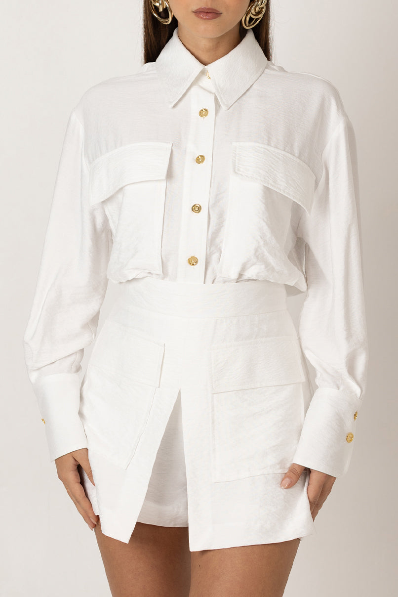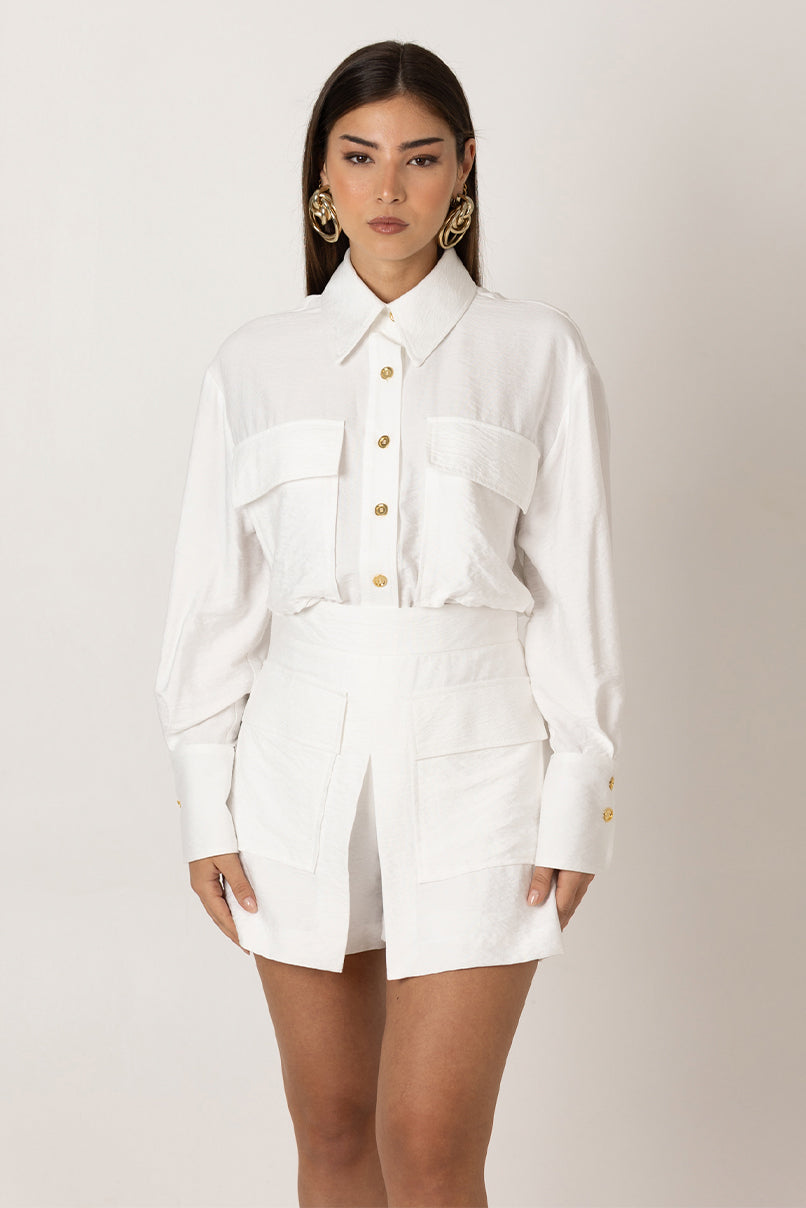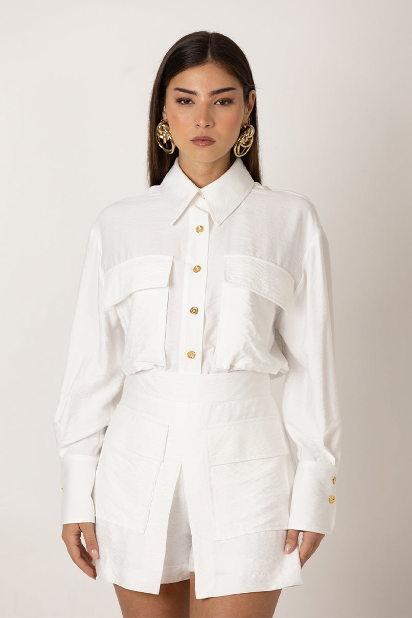 Camisa de gola de lapela e manga comprida acabada em punho. Bolsos frontais de chapa com lapela.