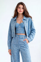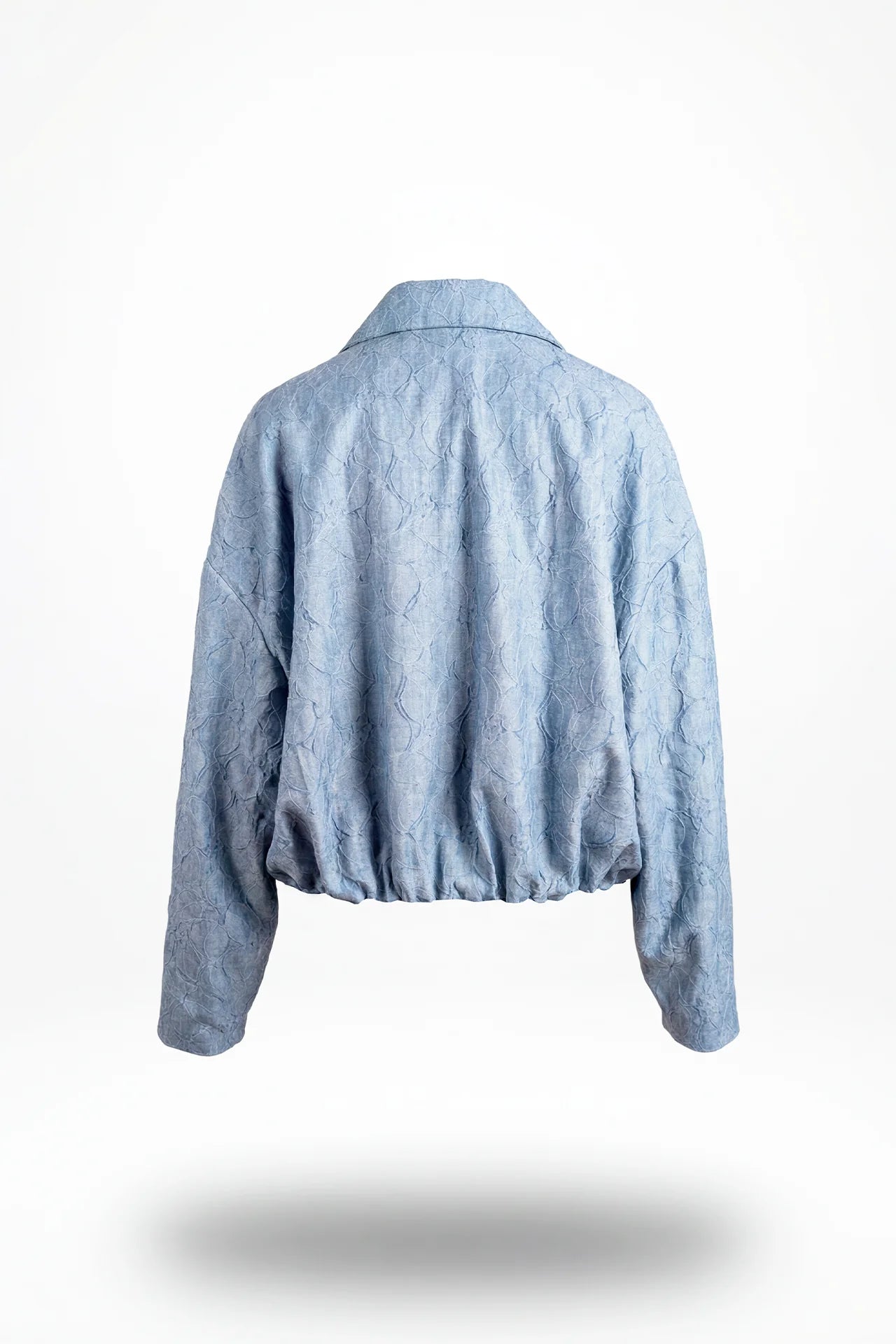 Casaco curto em tecido jacquard com gola e fecho frontal de correr. Modelo de linhas soltas com bainha elástica para um volume subtil.