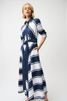 Introducing the Joseph Ribkoff shirt dress, a perfect blend of style and practicality. This belted maxi dress features buttons and pockets for added convenience, while the collar neckline and 3/4 straight sleeves offer a sophisticated touch. Ideal for casual summer occasions, the striped pattern and feminine, casual design make it a versatile wardrobe staple.