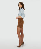 The JOSH V Fenella women’s shorts in Brown are made from 100% certified leather. The dark brown suede shorts have a high-waisted fit. The back of the waistband features elastic. In addition, the shorts also have elastic on the inside, allowing you to tighten the waist. To keep the suede looking its best, we recommend treating the shorts once per season with a suede protective spray. Style tip: pair the shorts with the matching Emsy jacket for a complete co-ord set and finish the look with the matching Telma bag or Lilian boots.