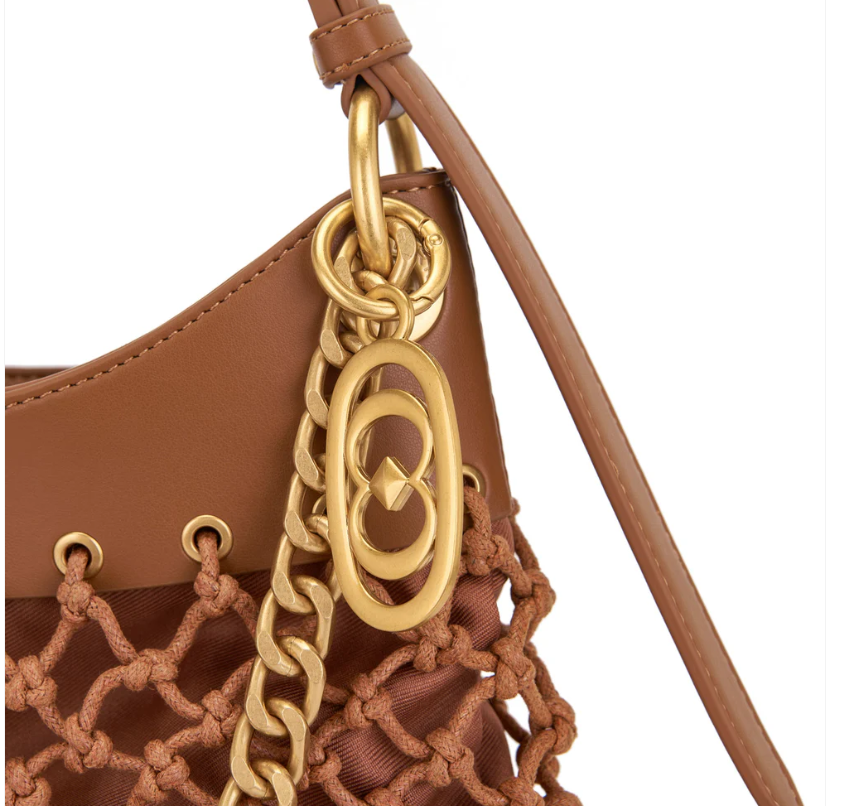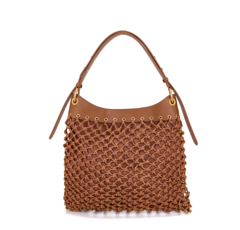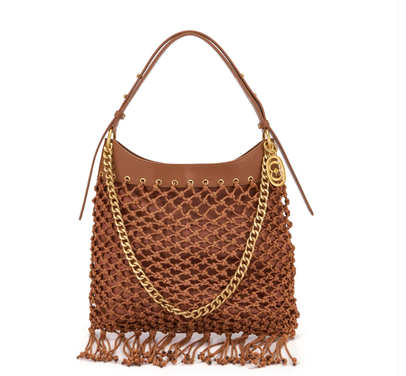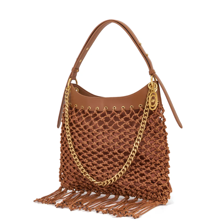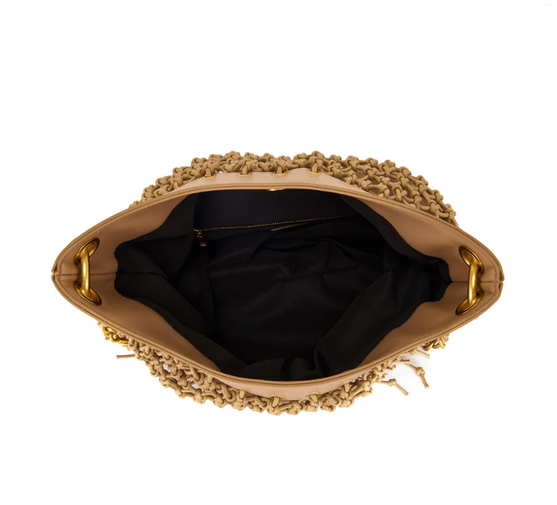 Woven rope shoulder bag with fringes, handle and removable shoulder strap