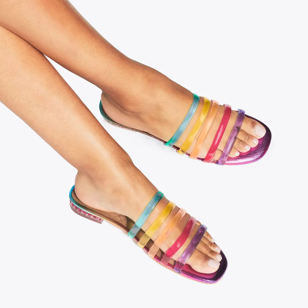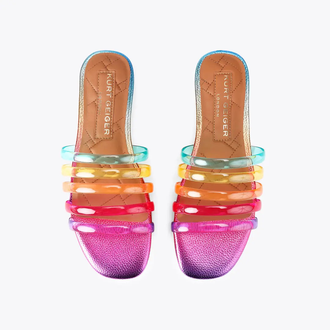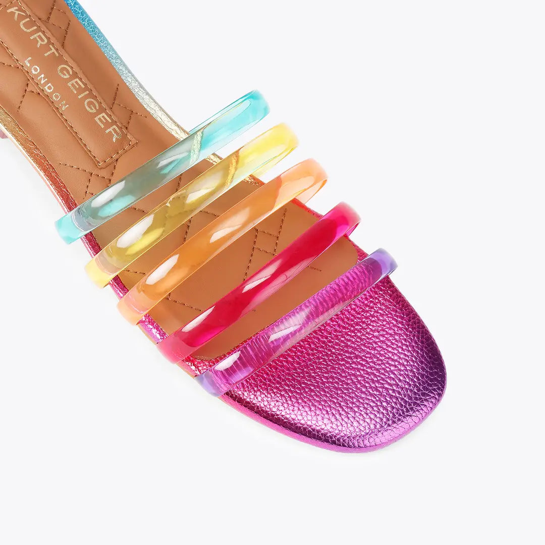 This Jelly Strap Mule is a slip-on sandal with five semi-transparent rainbow straps across the foot. The footbed is in an ombre pebble grained fabric and the heel is embellished with pink crystals.
