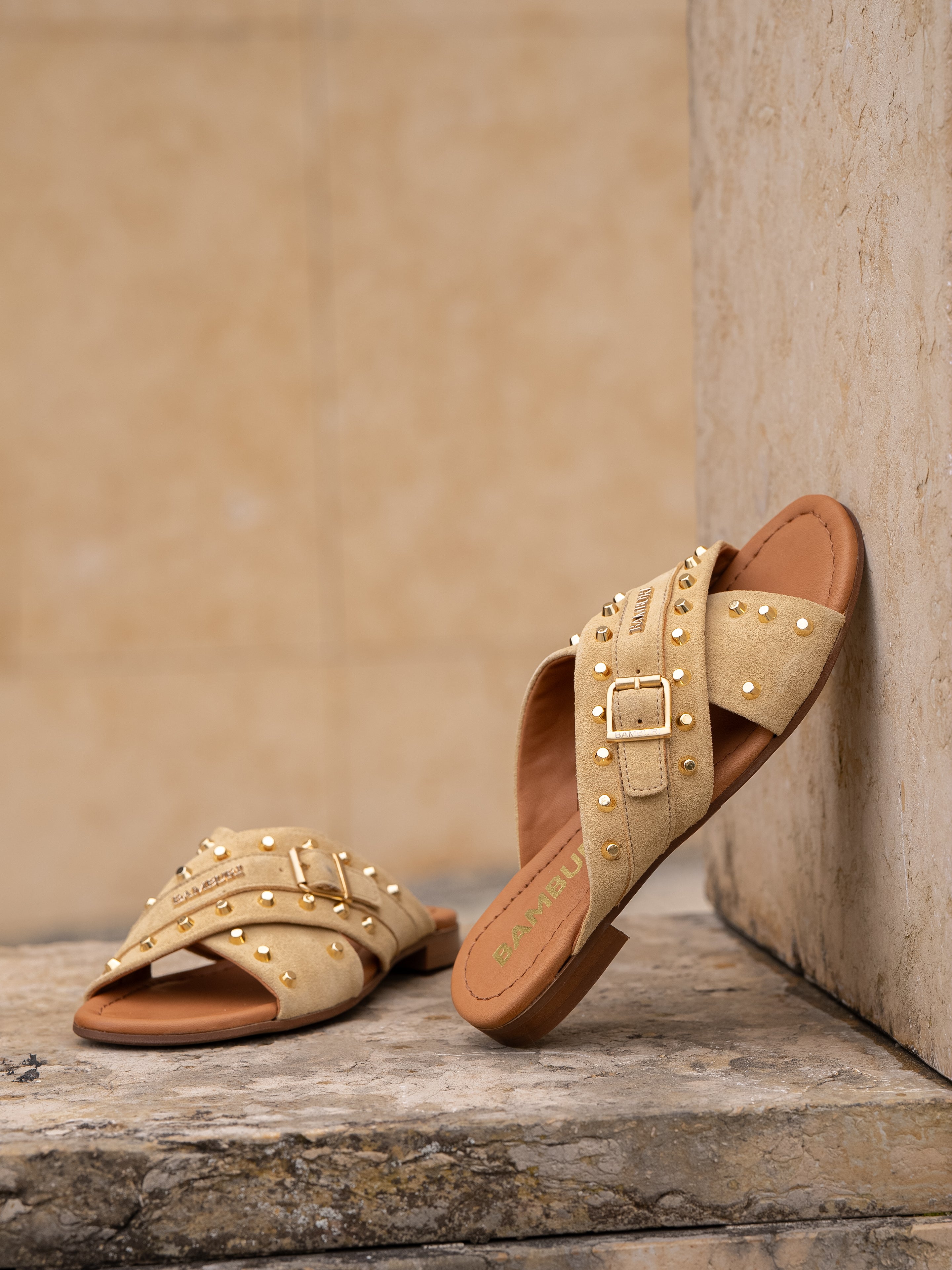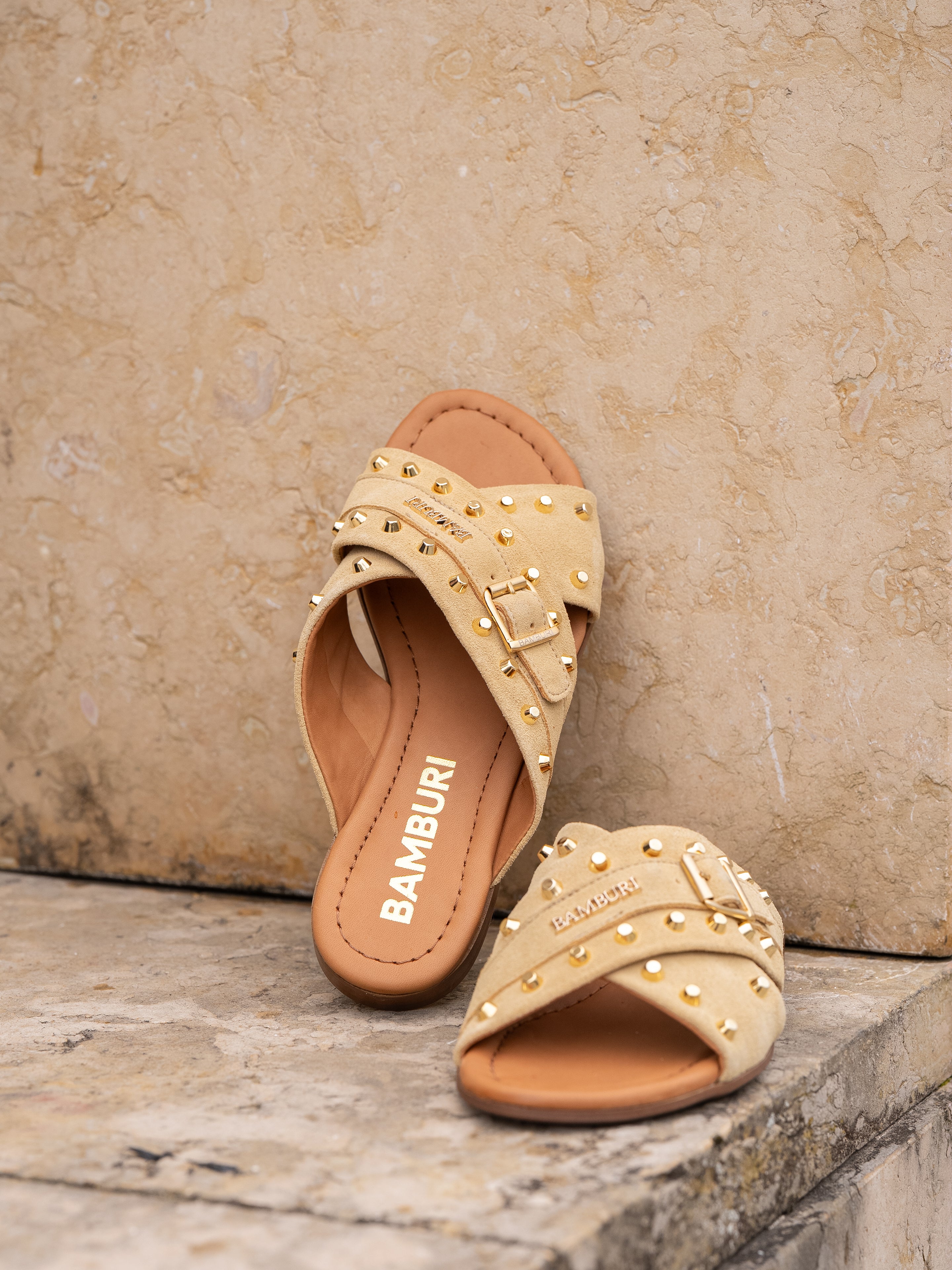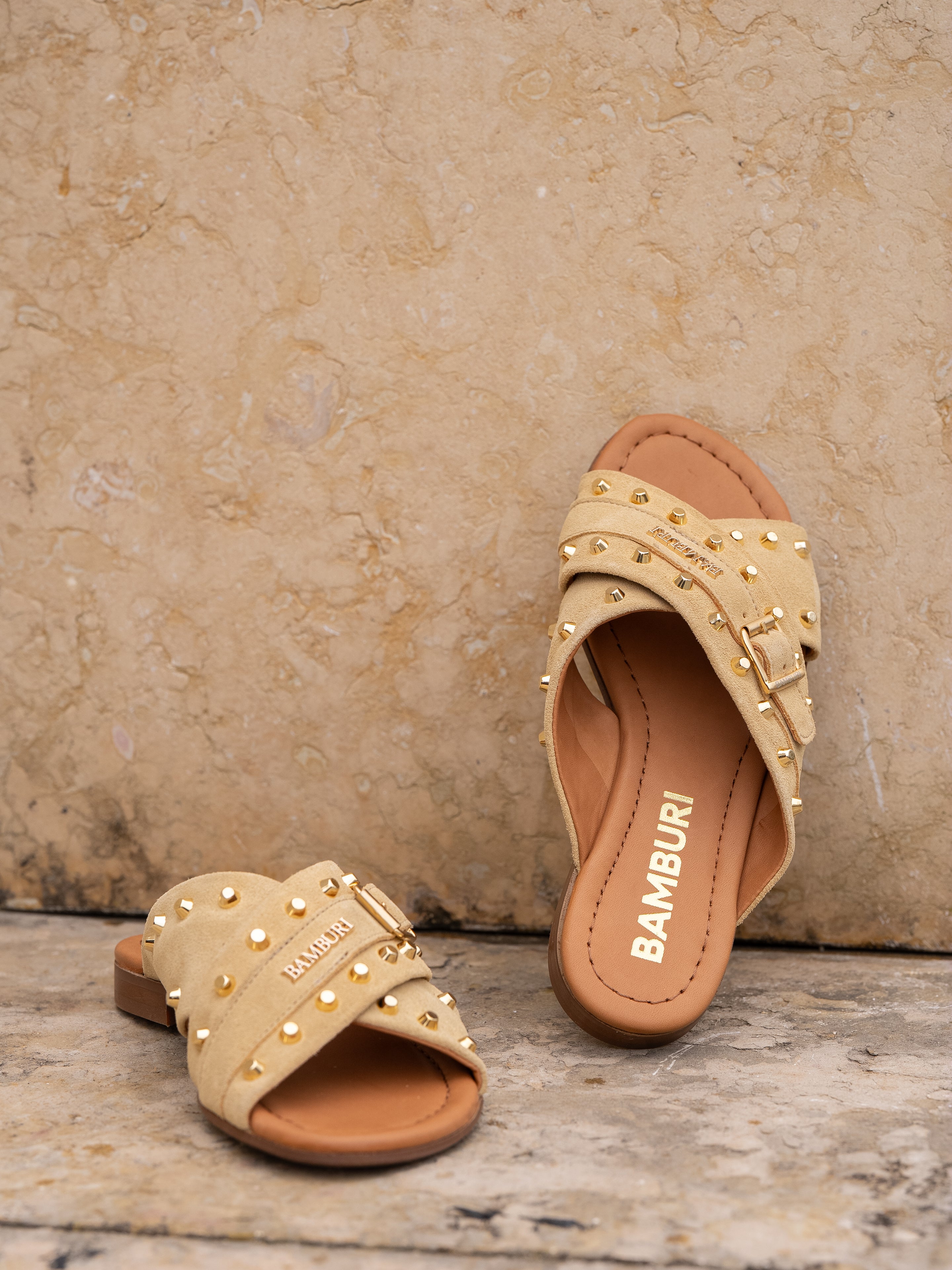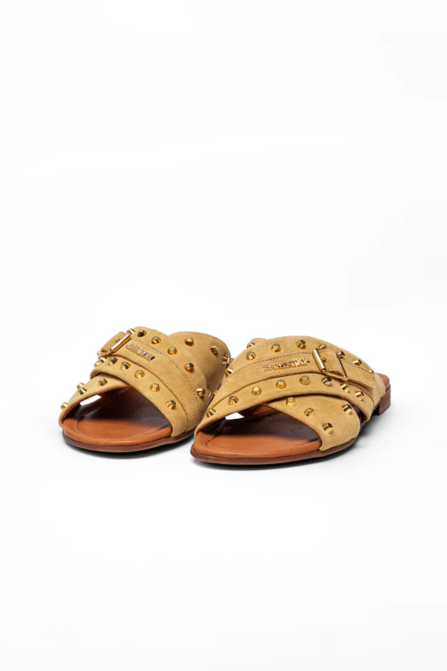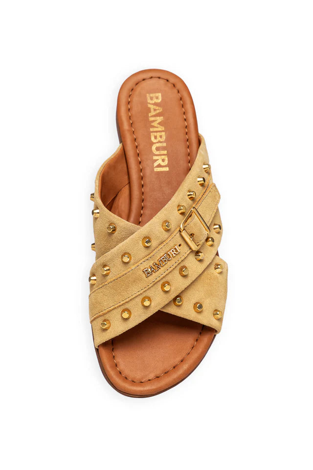 Uma sandália slide marcante que combina o saber-fazer artesanal com um toque contemporâneo. Estas sandálias de tiras cruzadas são confeccionadas em camurça macia e enriquecidas com tachas em tom dourado, criando um visual texturado distinto sem perder uma silhueta elegante.