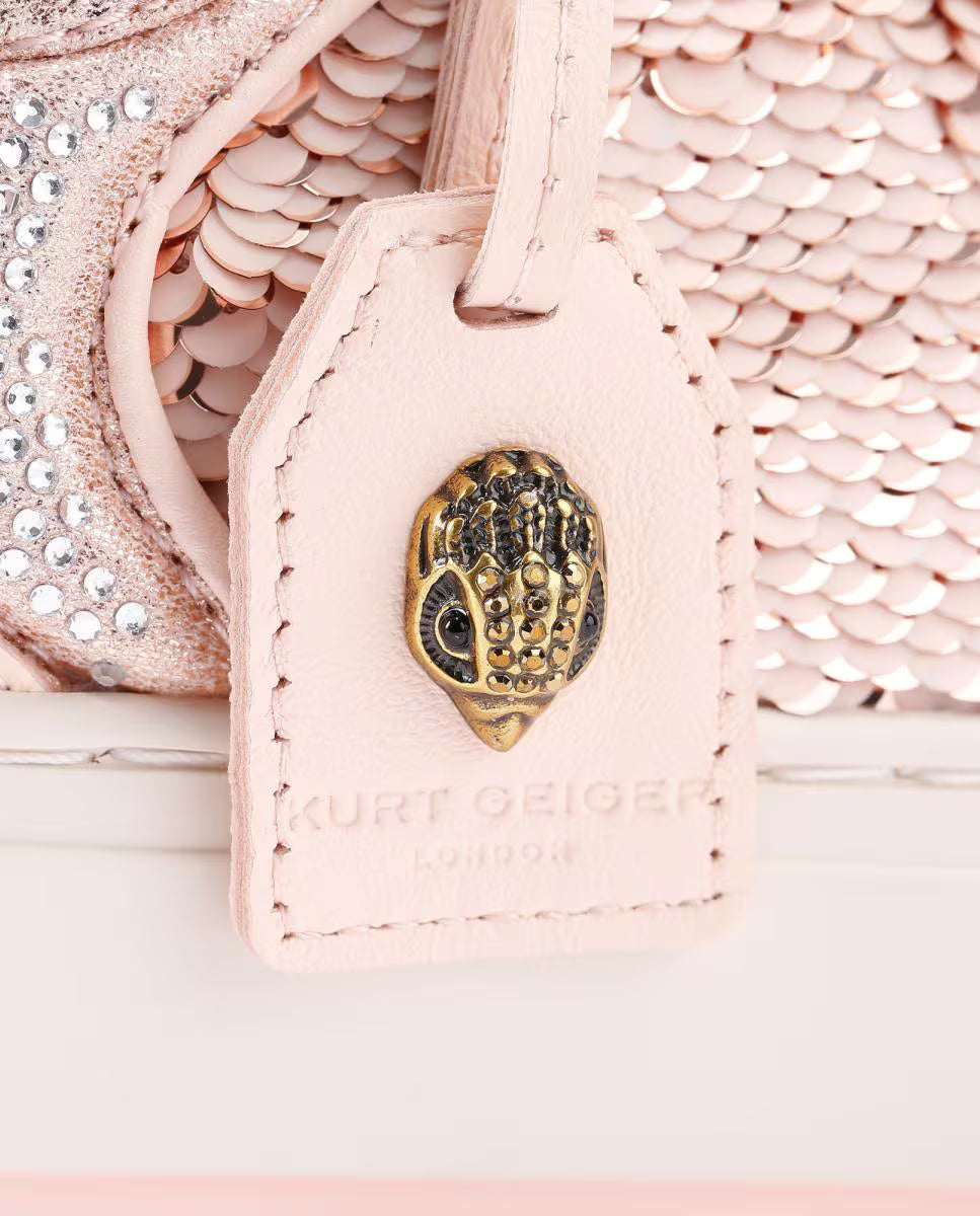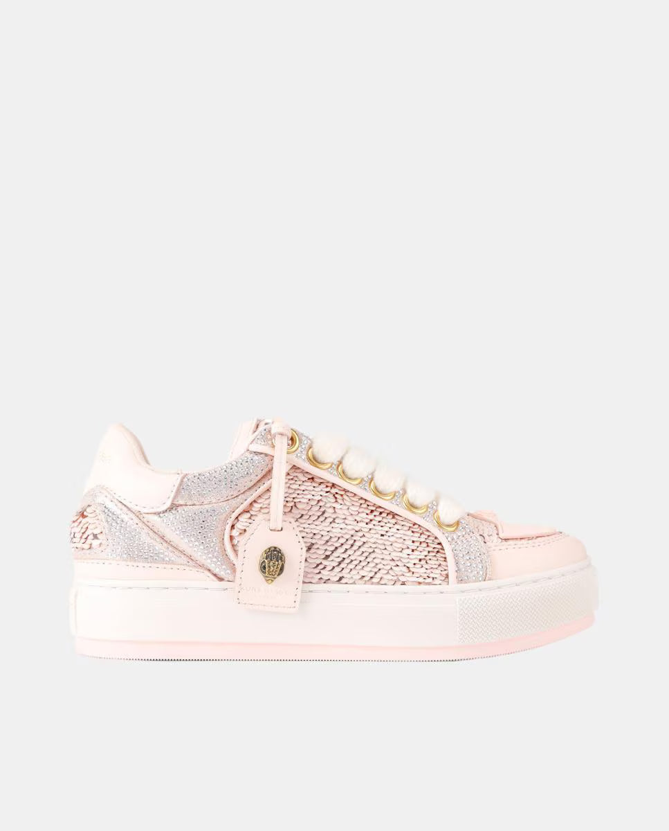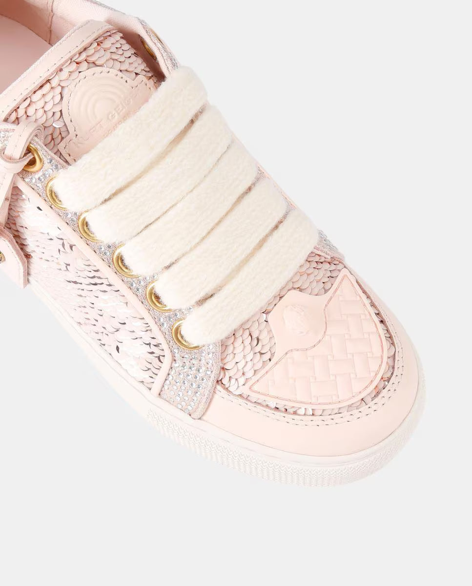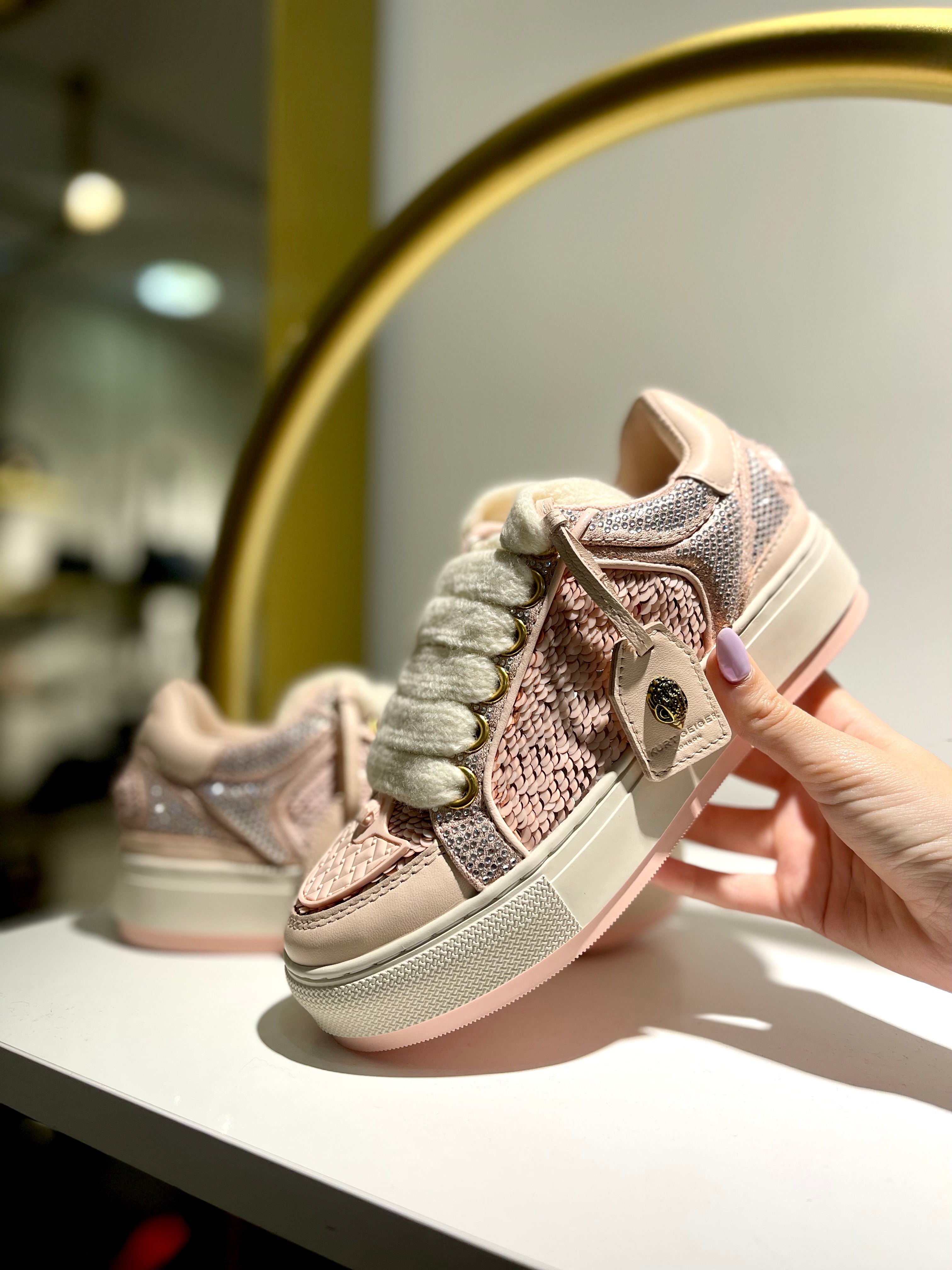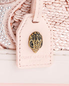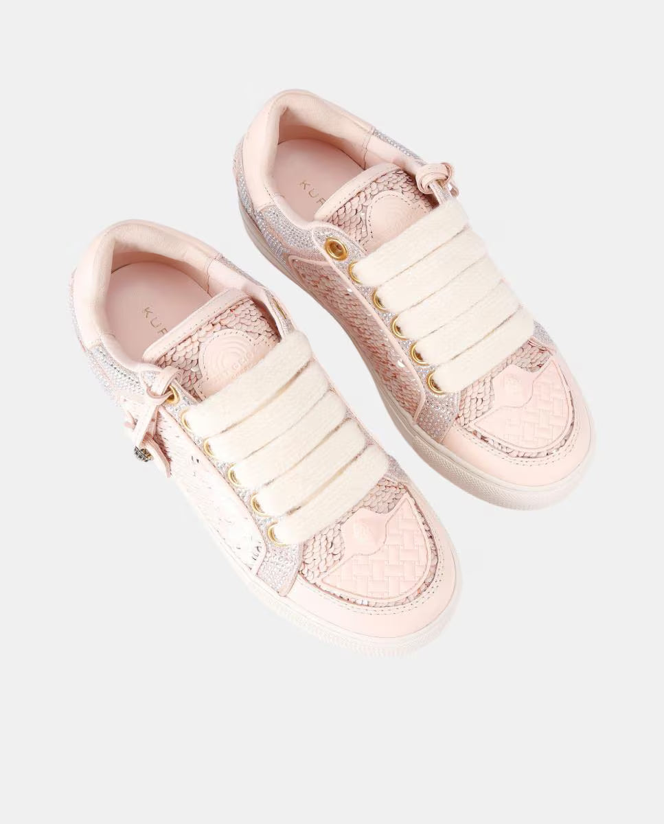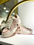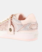 The Southbank Tag sneaker features a pink distressed upper with gold metallic brush. There is an antiqued brass eagle head on the gold tag. The laces are woven with iridescent crystal embellishment.