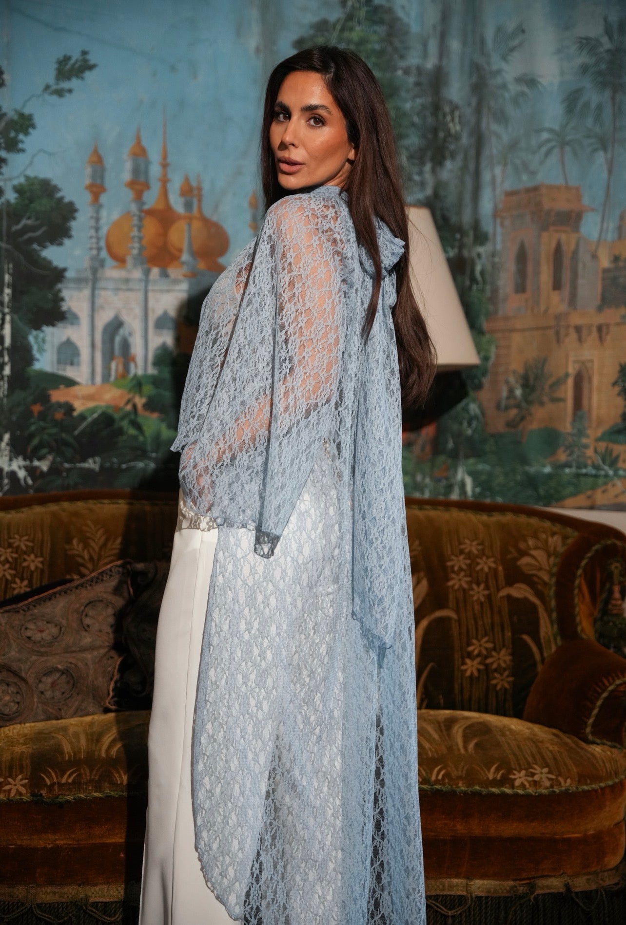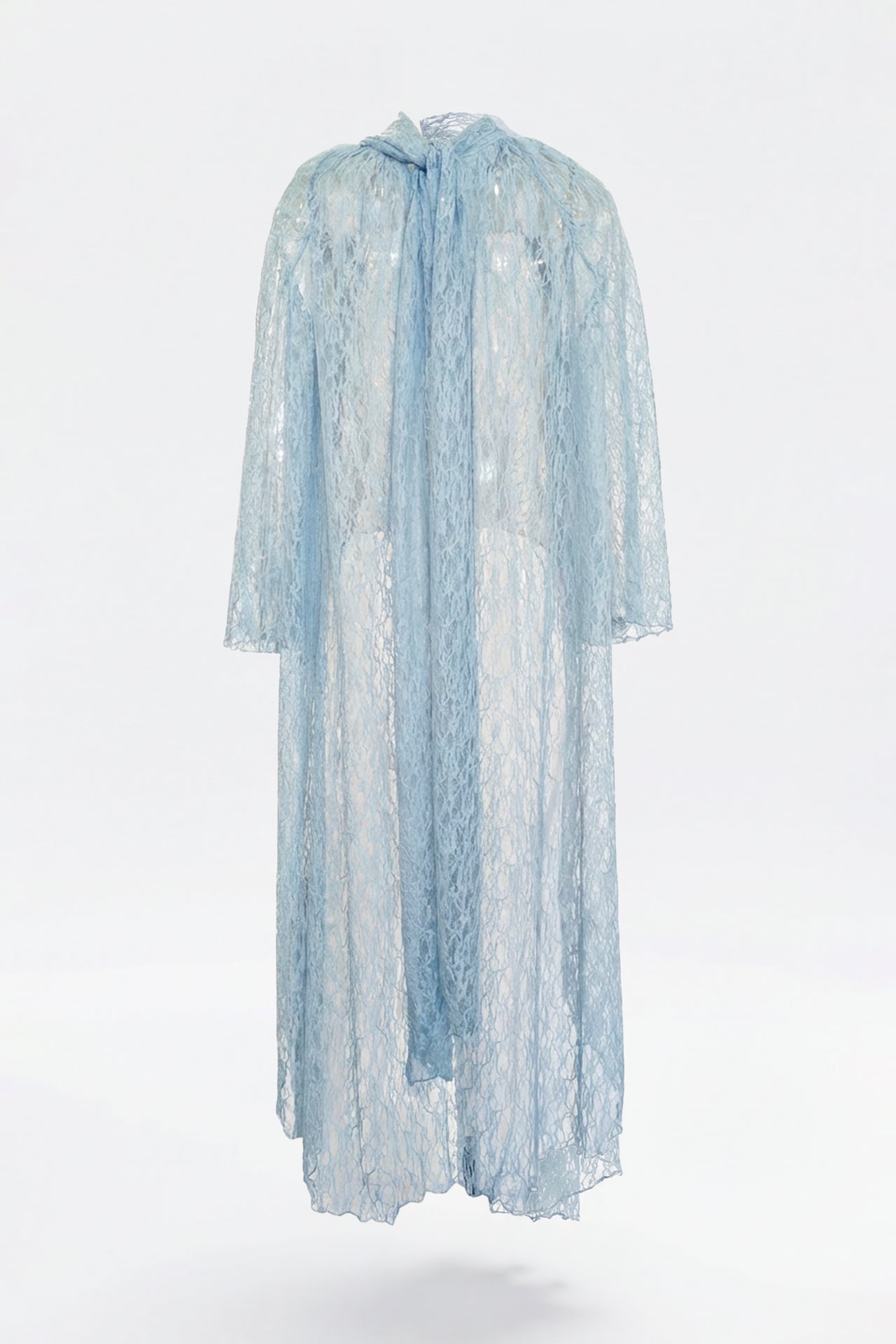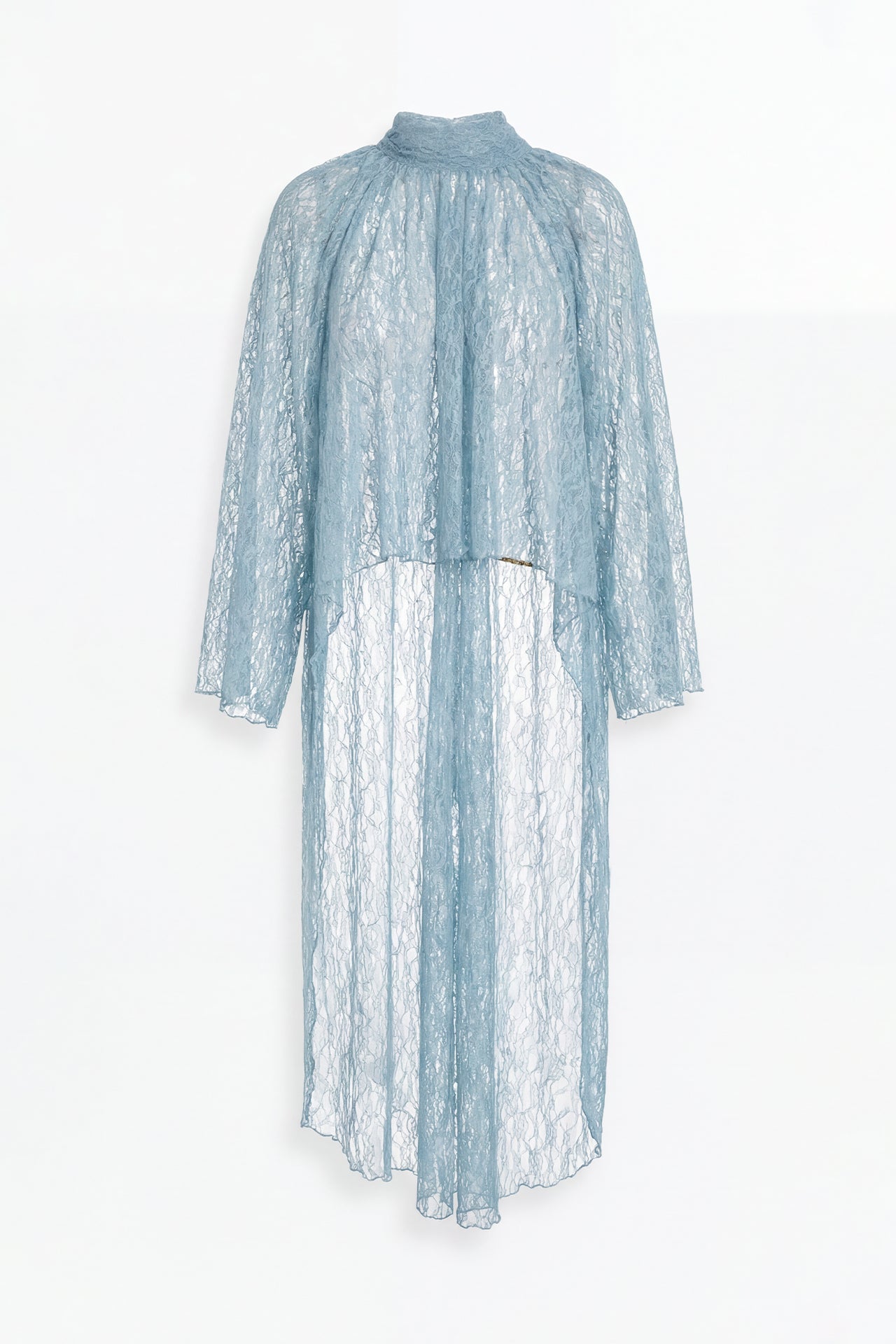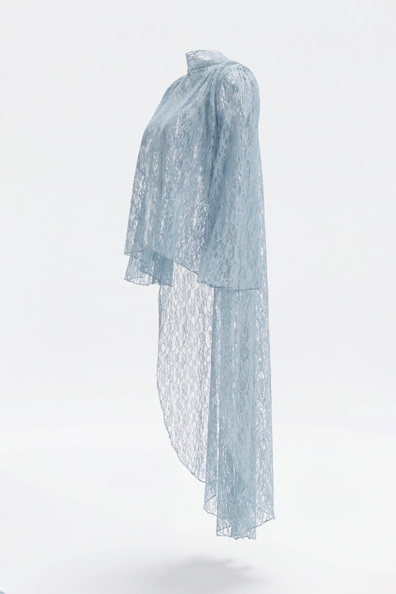 Túnica Semitransparente de Renda que envolve a silhueta com movimento e transparência. O corte fluido e assimétrico cria um efeito dramático a cada passo, enquanto a gola subida acrescenta um toque sofisticado e contemporâneo.