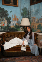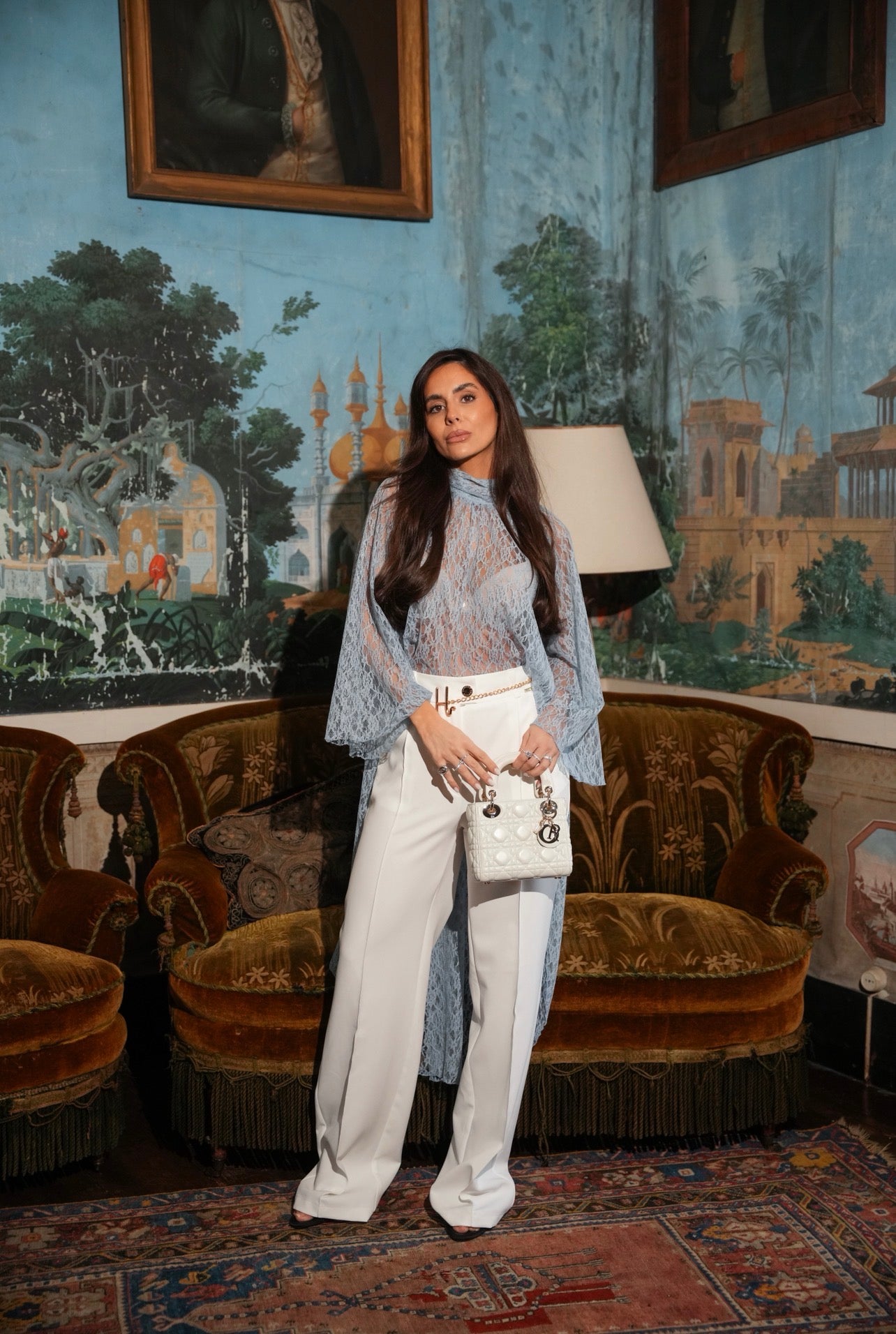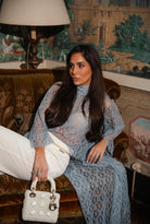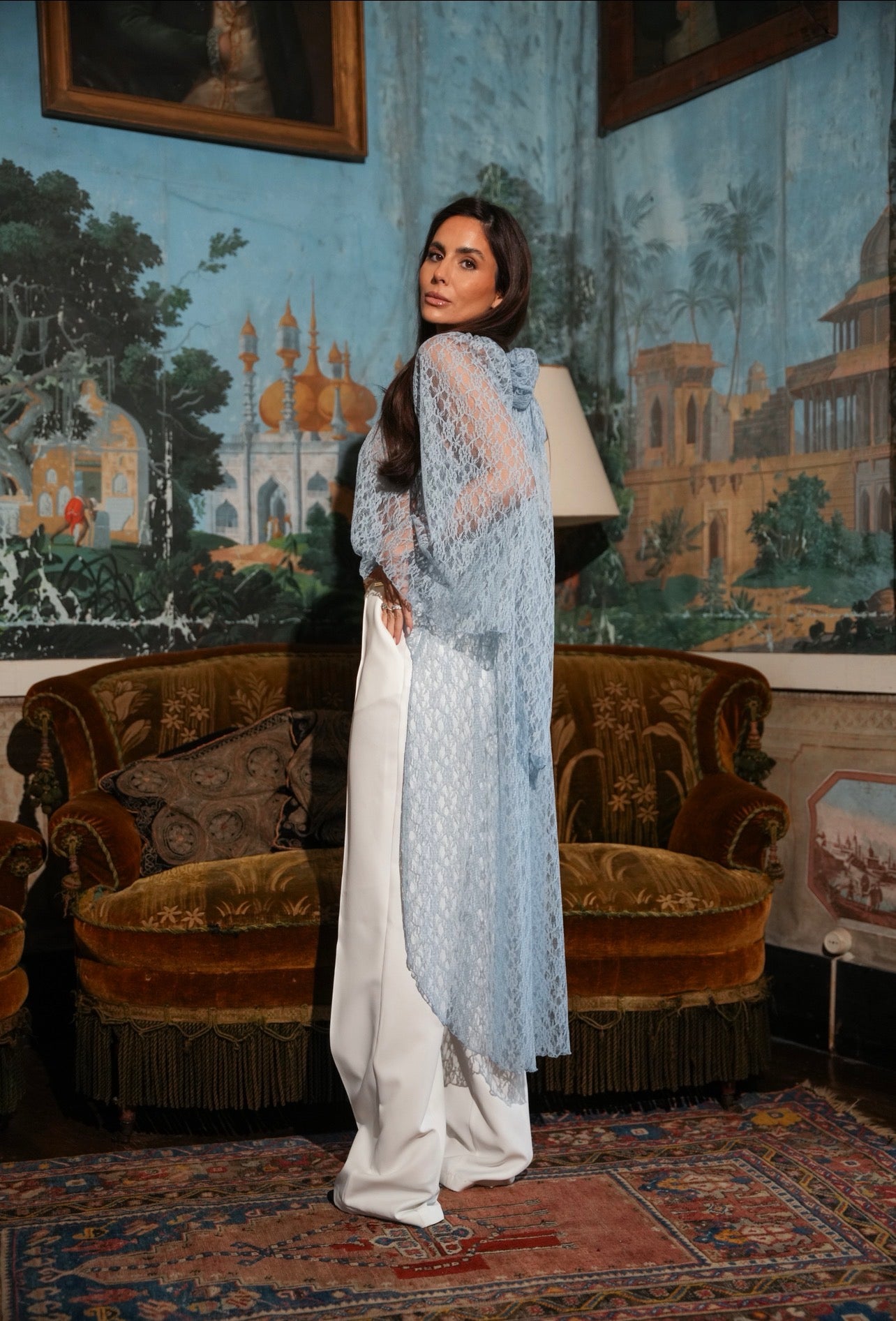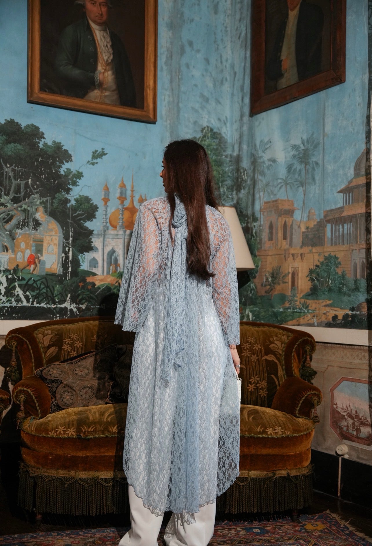 Túnica Semitransparente de Renda que envolve a silhueta com movimento e transparência. O corte fluido e assimétrico cria um efeito dramático a cada passo, enquanto a gola subida acrescenta um toque sofisticado e contemporâneo.