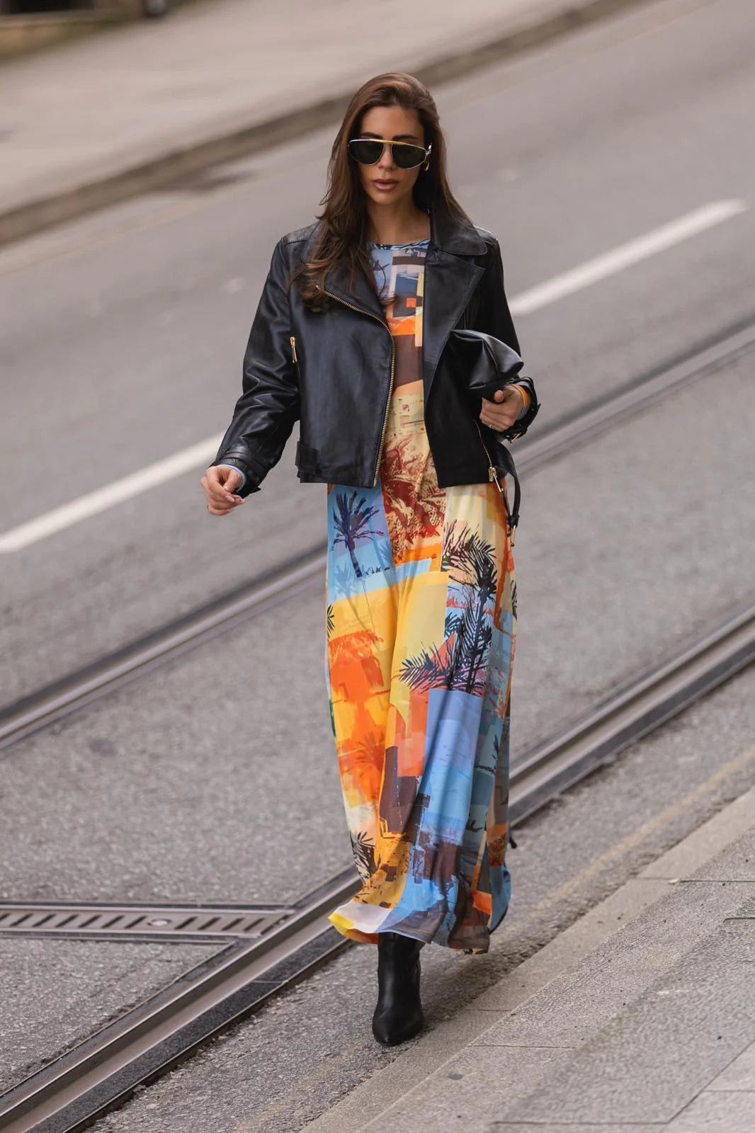 Vestido comprido de decote redondo e manga comprida. Modelo com corte evasé e acabamento fluido, com estampado posicionado em toda a peça.