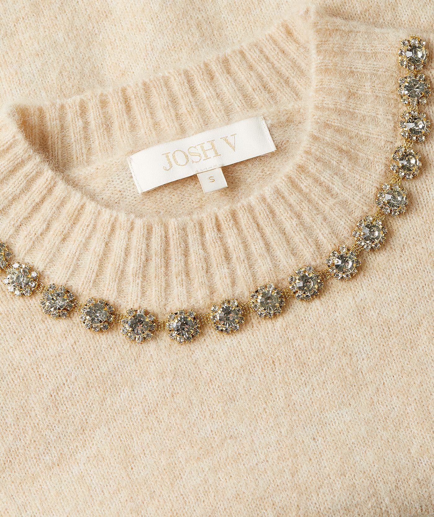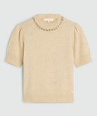 The JOSH V Franka women’s top in Light Beige Melange combines comfort and style. This fine-knit, short-sleeve top has a slim-fit silhouette and is made from a soft wool blend with stretch that doesn’t itch. The decorative gemstones at the collar add a unique touch, making it perfect for a party look as well. Style tip: wear the top with wide-leg jeans and add a statement belt, like the Perri belt, for an eye-catching everyday look