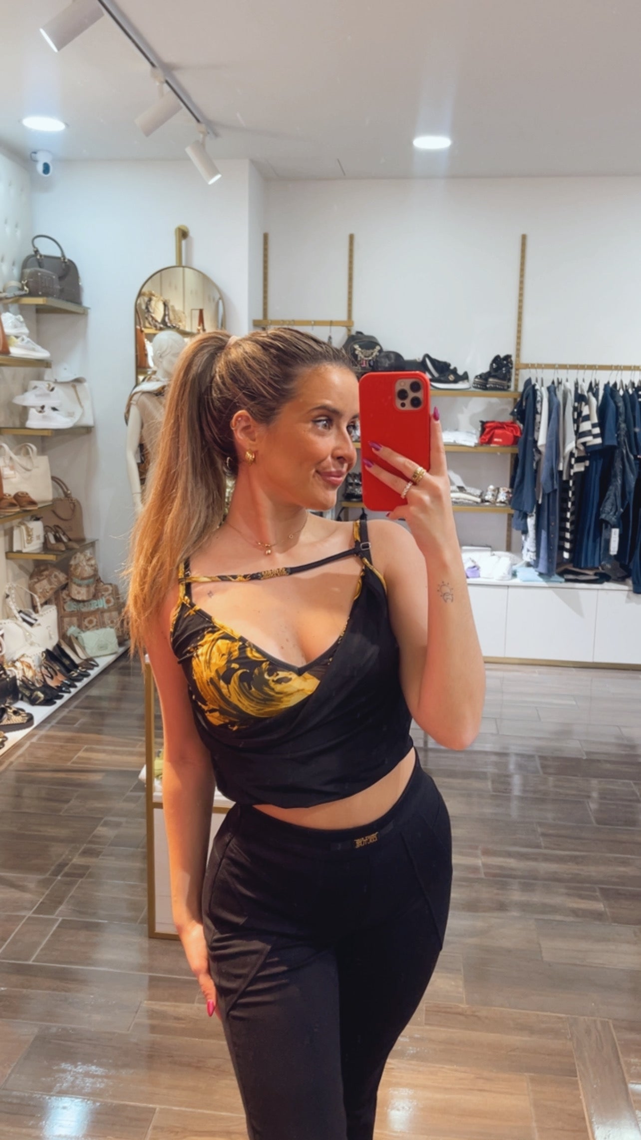 A sleeveless top crafted from stretch viscose with draped detailing, featuring a Wave Couture print and an Institutional Logo hardware on the back strap.