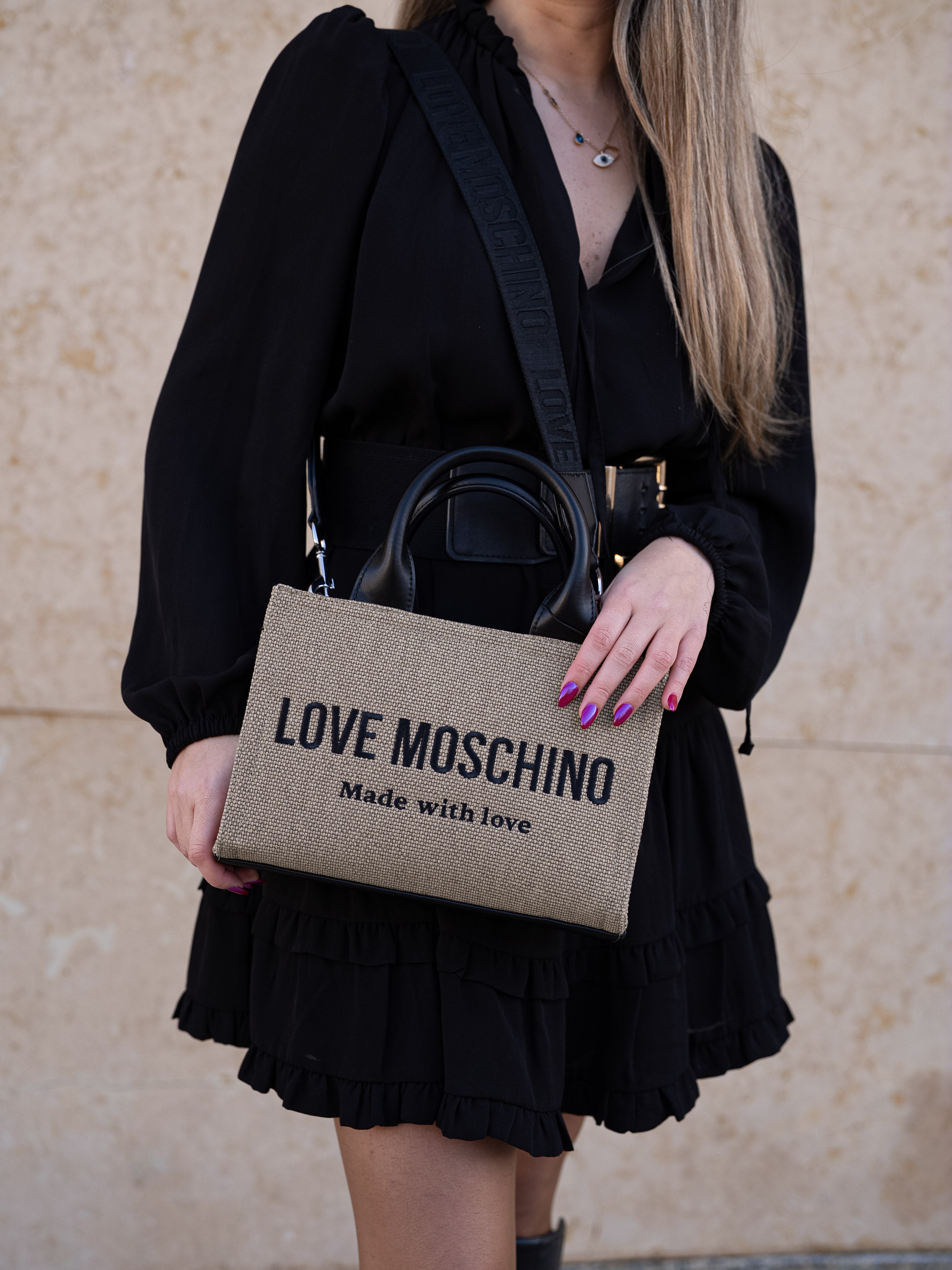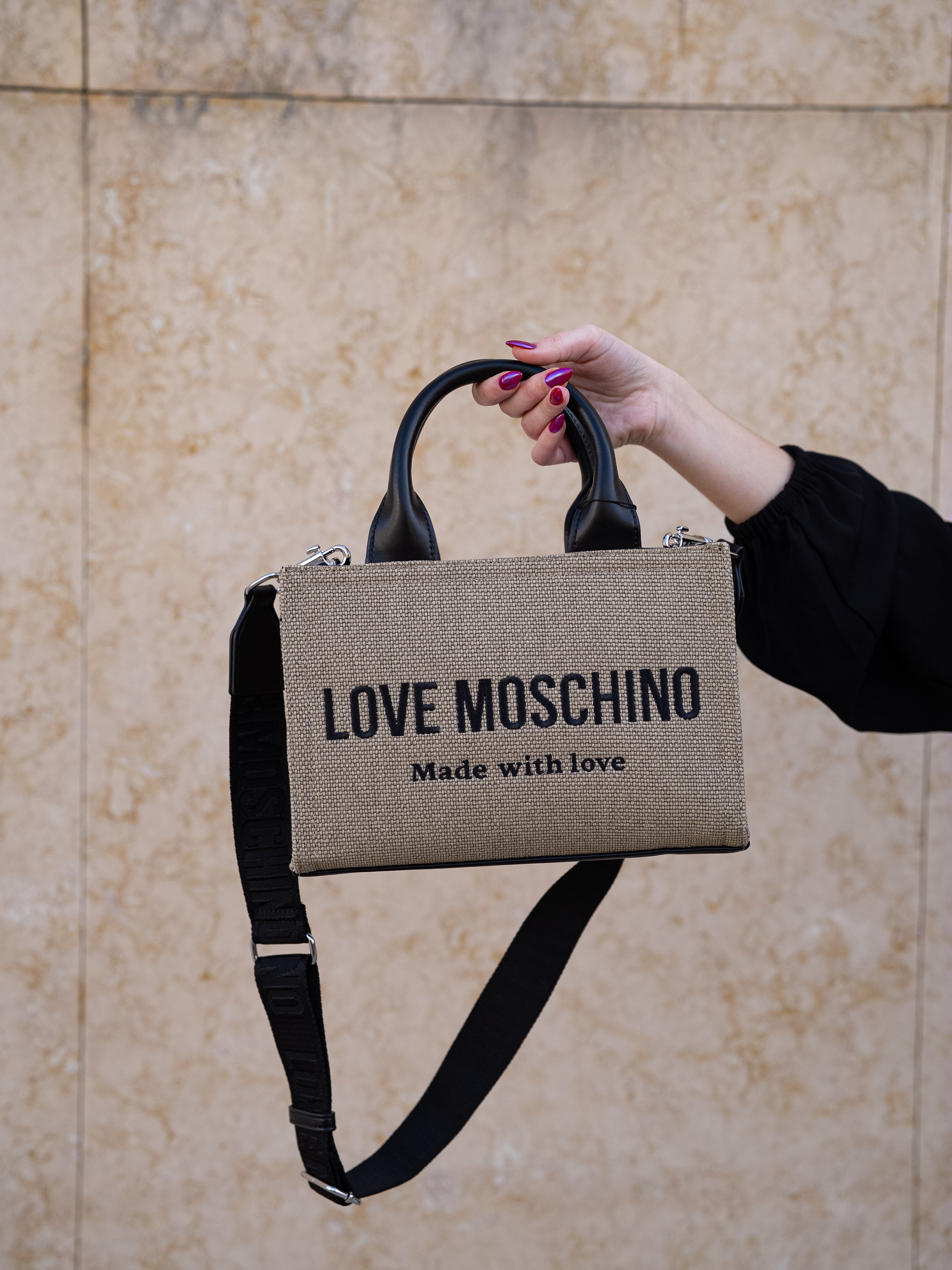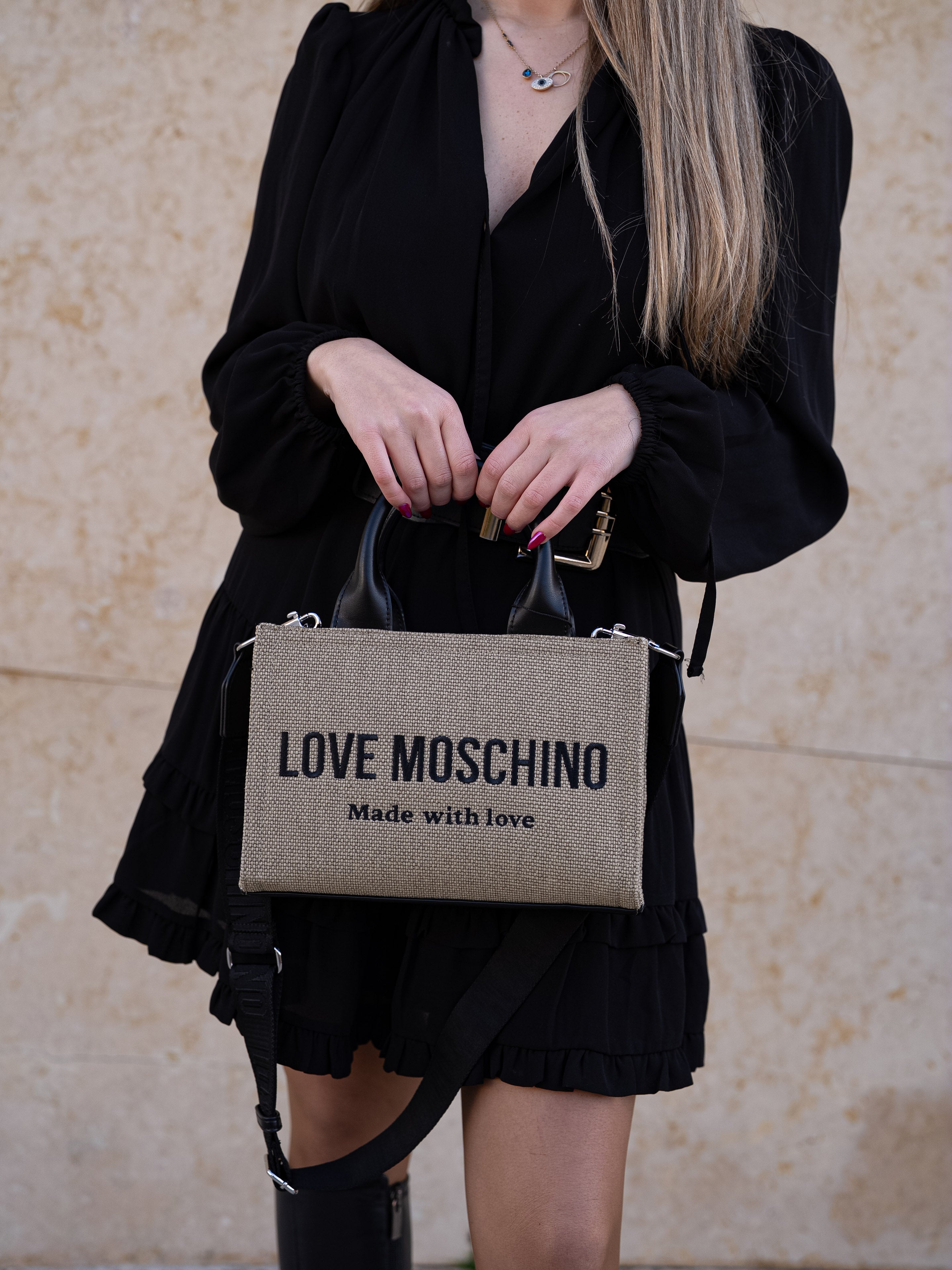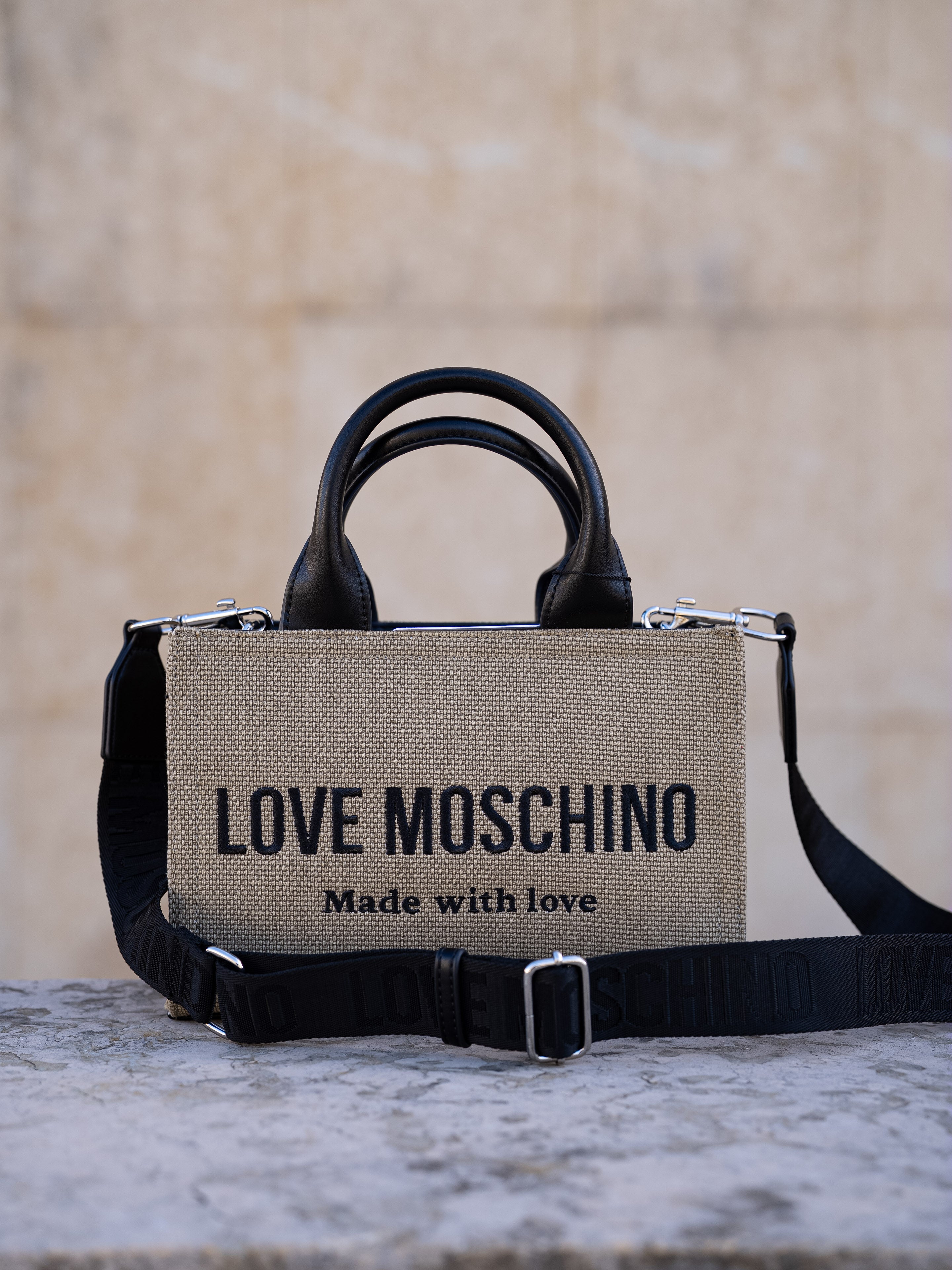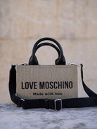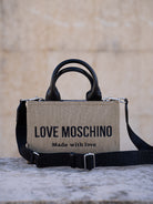 Beige and black handbag