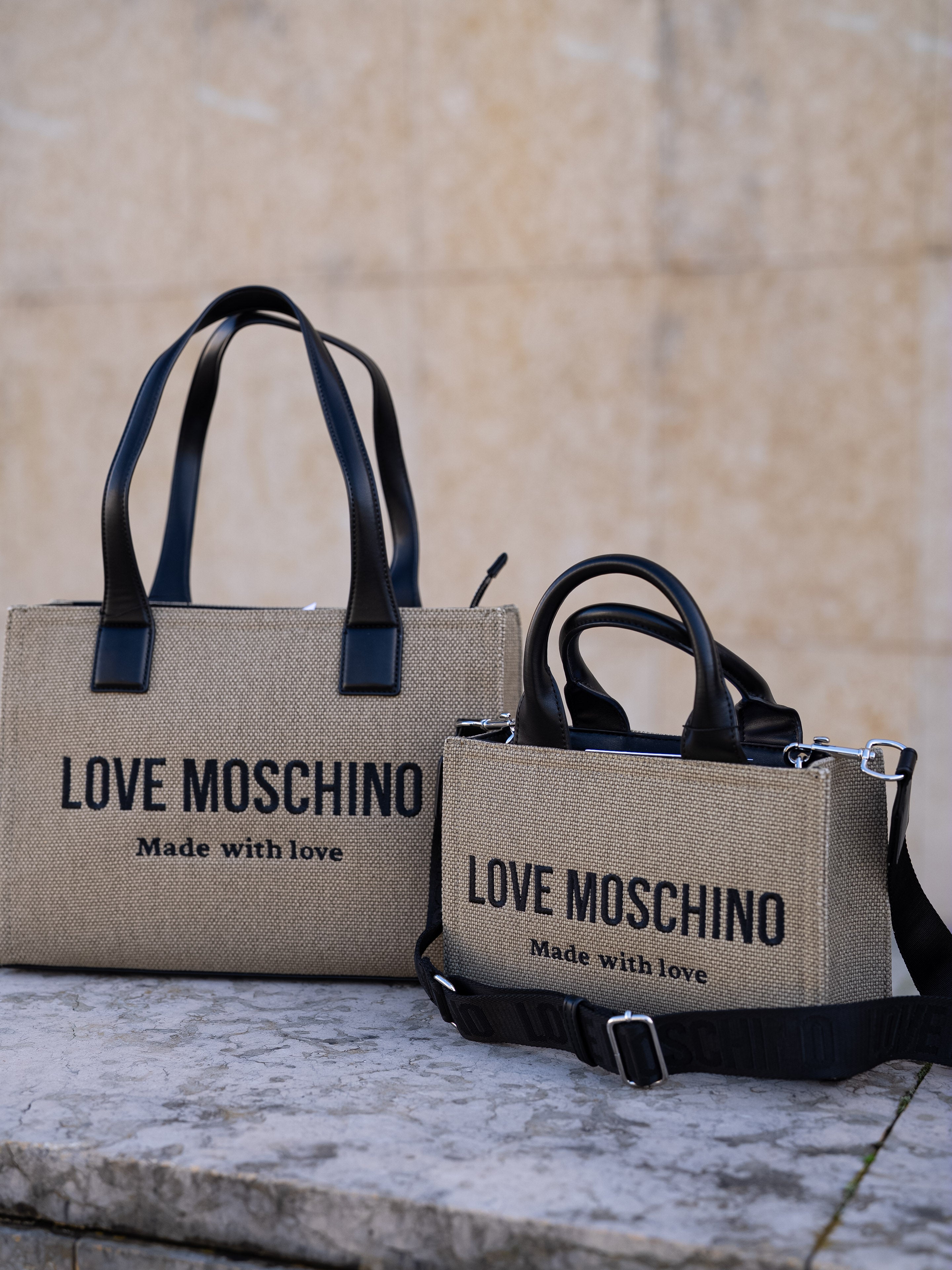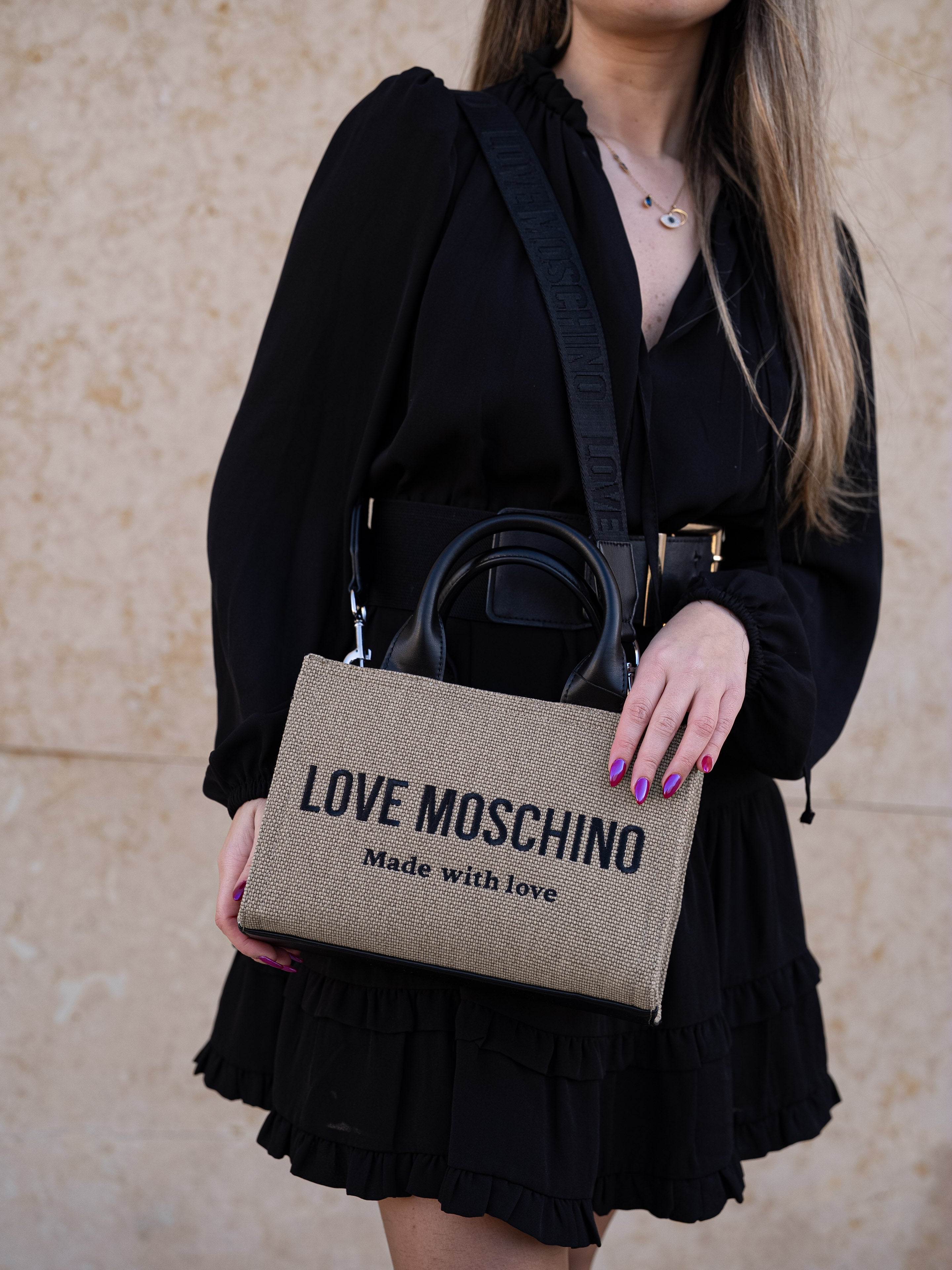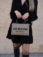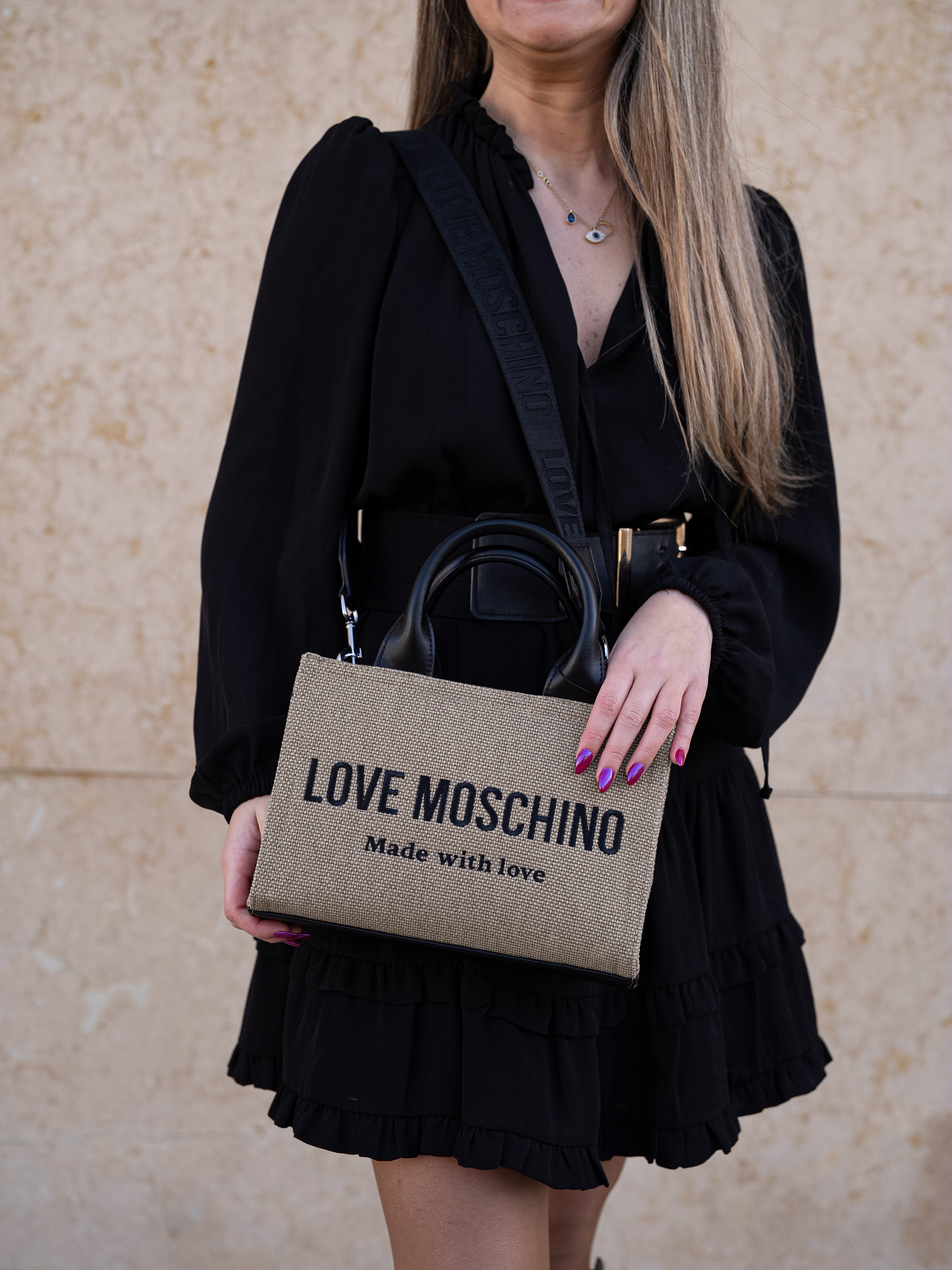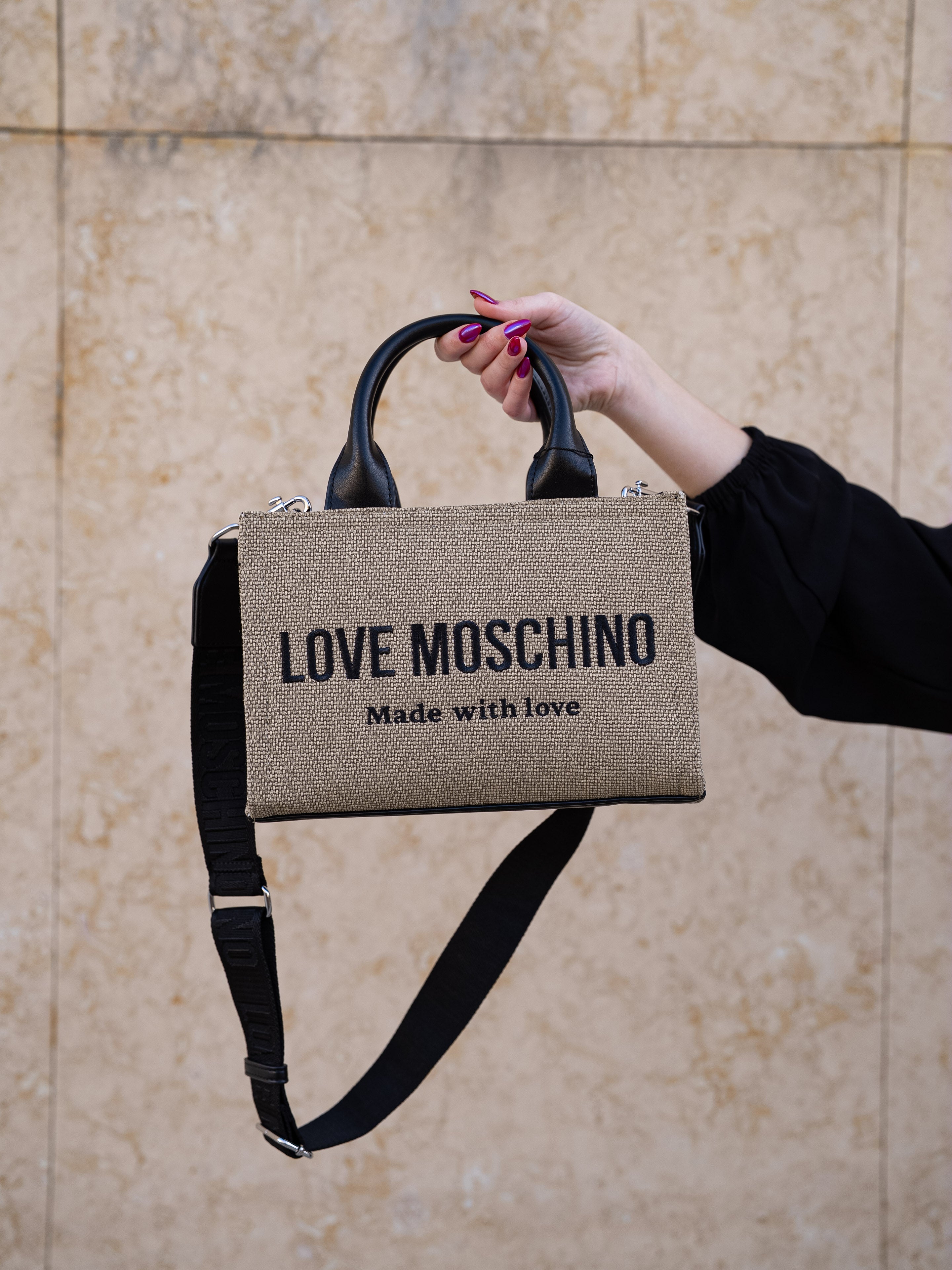 Beige and black handbag