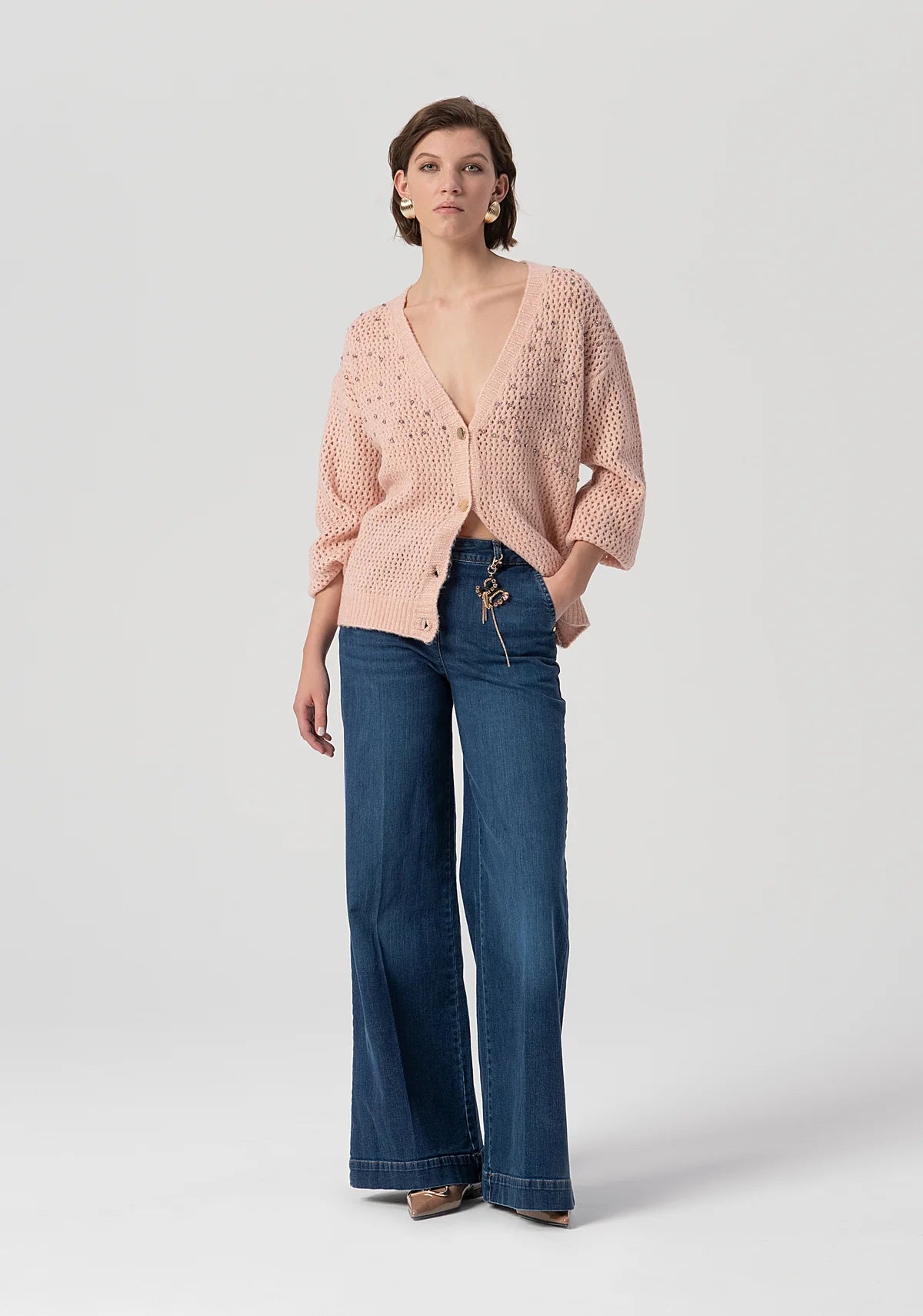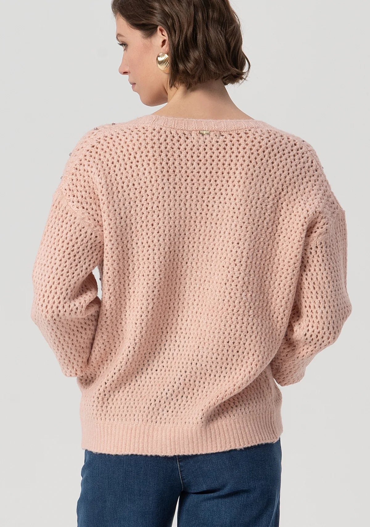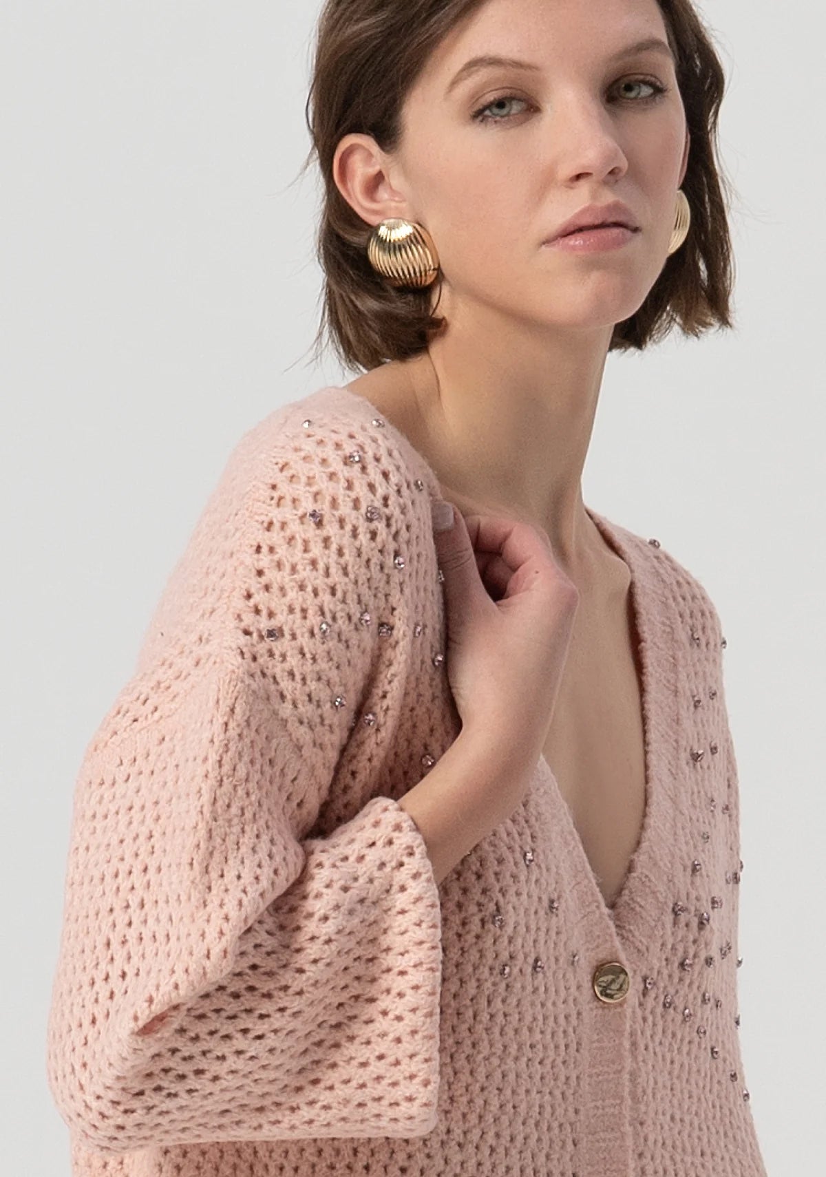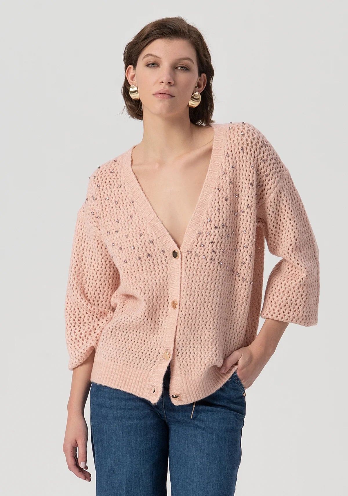 Cardigan over fit with overlock. Shiny stones applied. V-neck drop, central buttons for opening and long sleeve