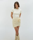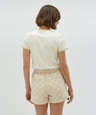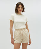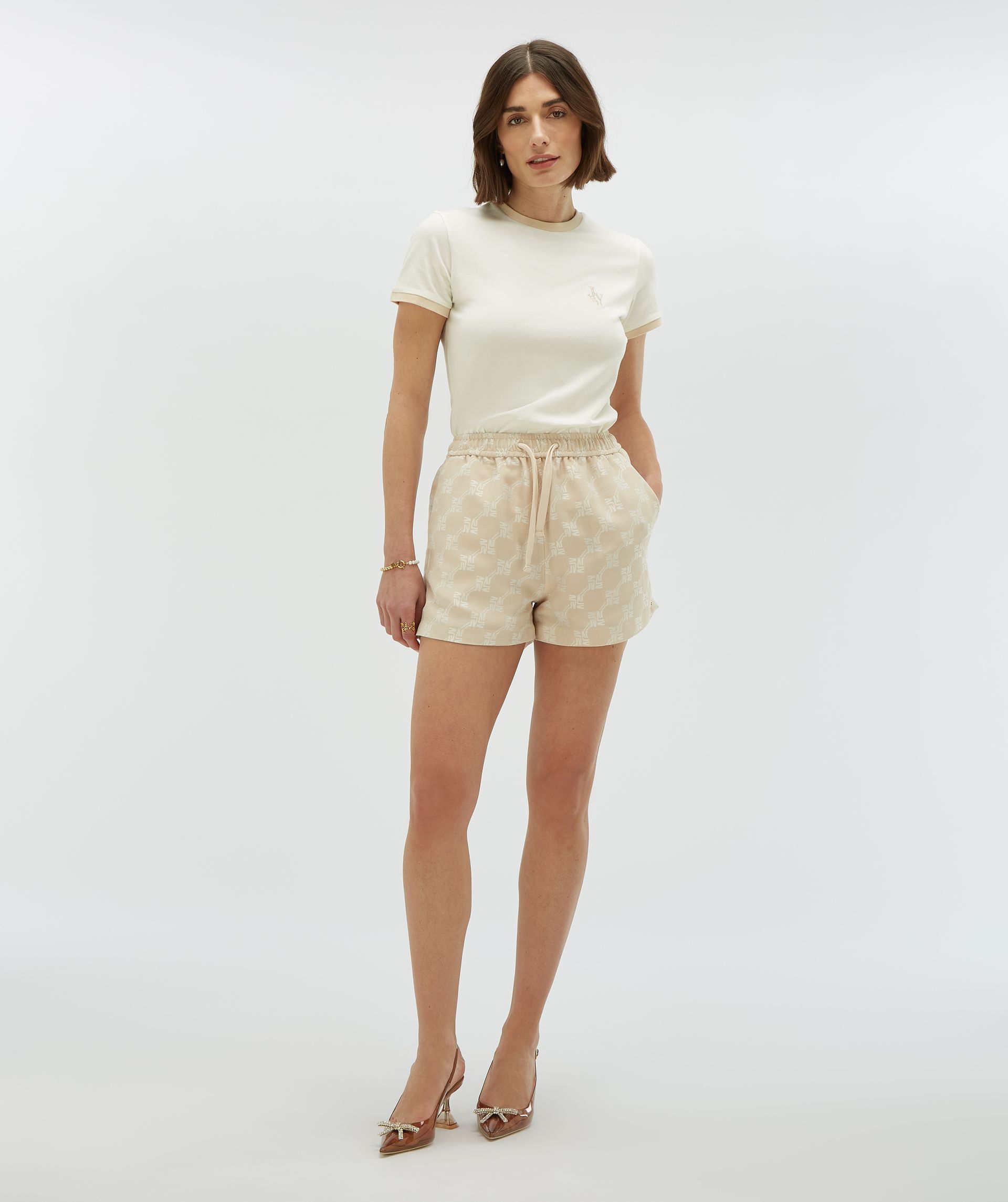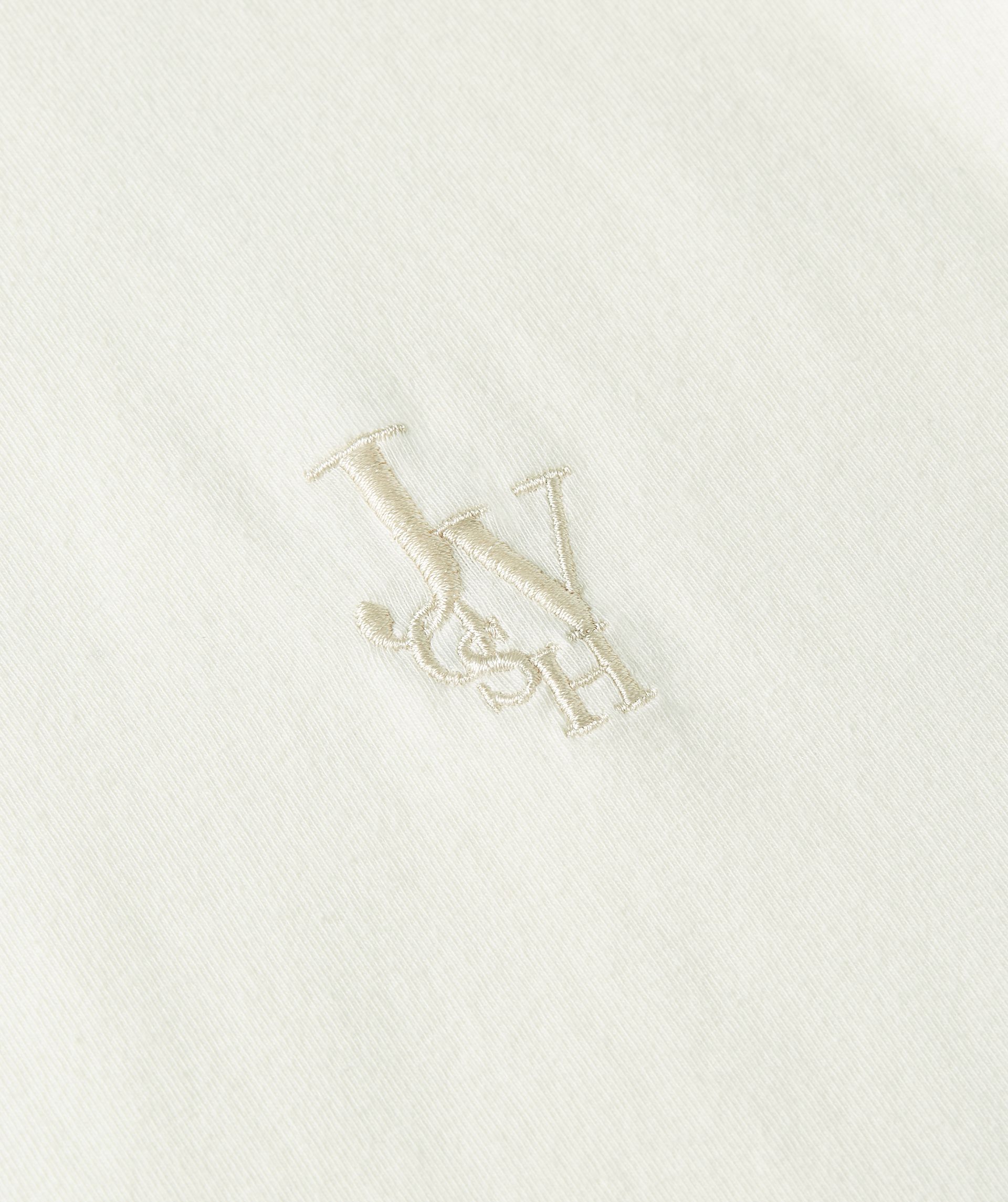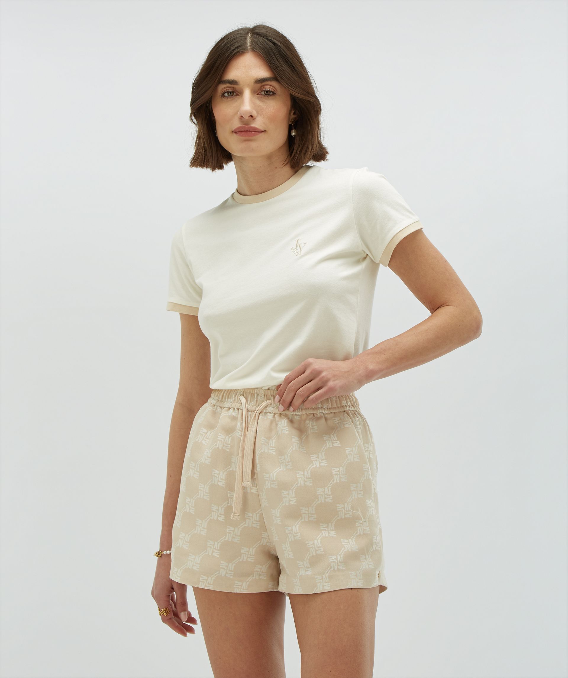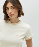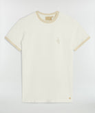 The JOSH V Loren women's T-shirt in the color Off White is the ultimate basic that you can mix and match endlessly. This white jersey tee has a fitted silhouette and is made from cotton with stretch. The cotton is sourced via Better Cotton. The neckline and sleeve ends are finished with a beige trim. Additionally, the embroidered JOSH V logo on the left chest adds a unique detail.