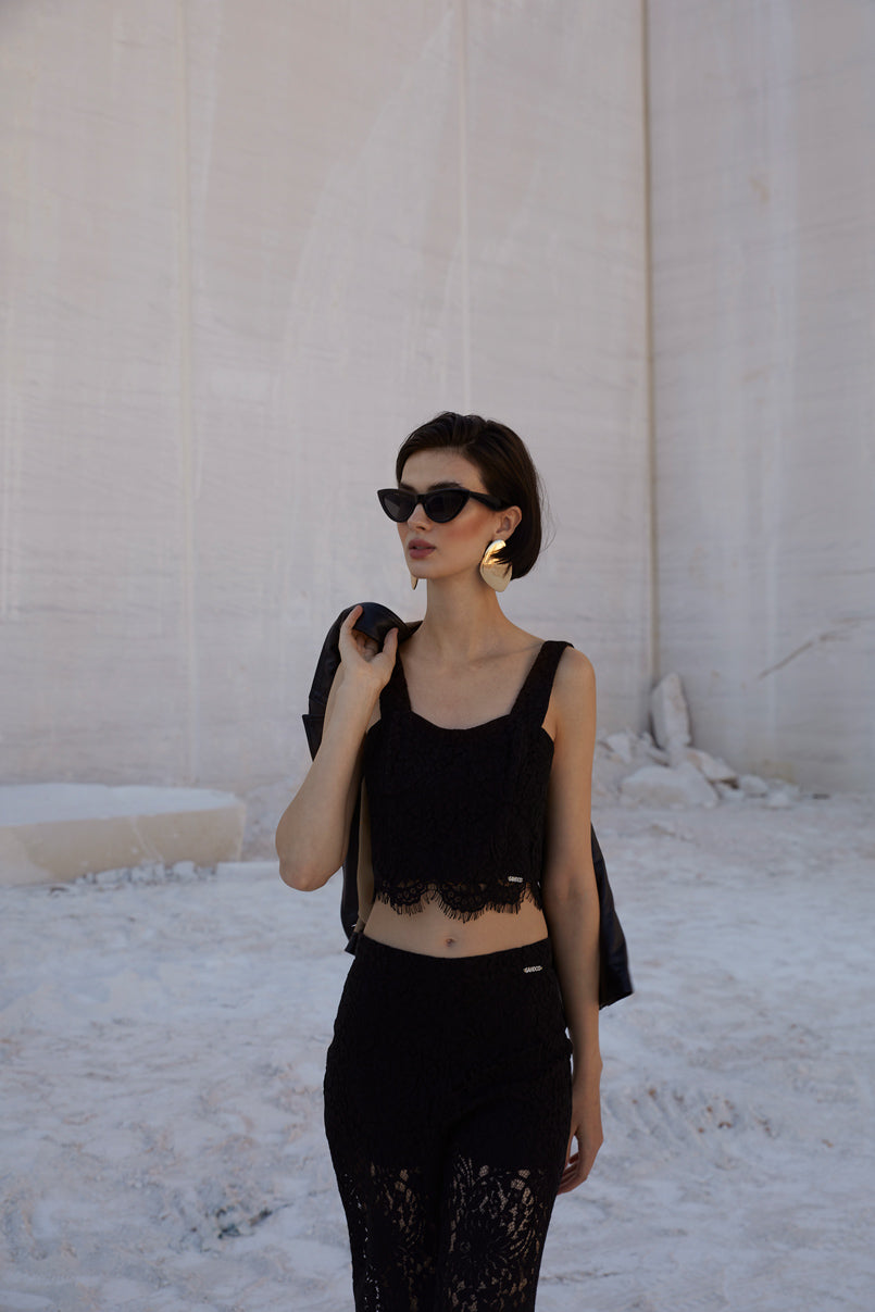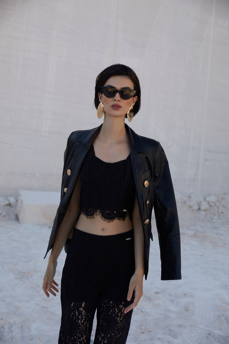 Fecho atrás com fecho de correr metálico. Forro interior.