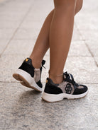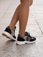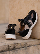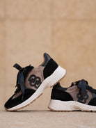 These Bamburi sneakers feature a black velvet upper with blush velvet accents, paired with wide satin laces for a refined touch. The design is completed with a bold white sole and a gum outsole for comfort and grip. The embroidered double-B monogram on the side adds a signature finish, blending sporty aesthetics with elegant luxury.
