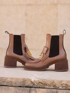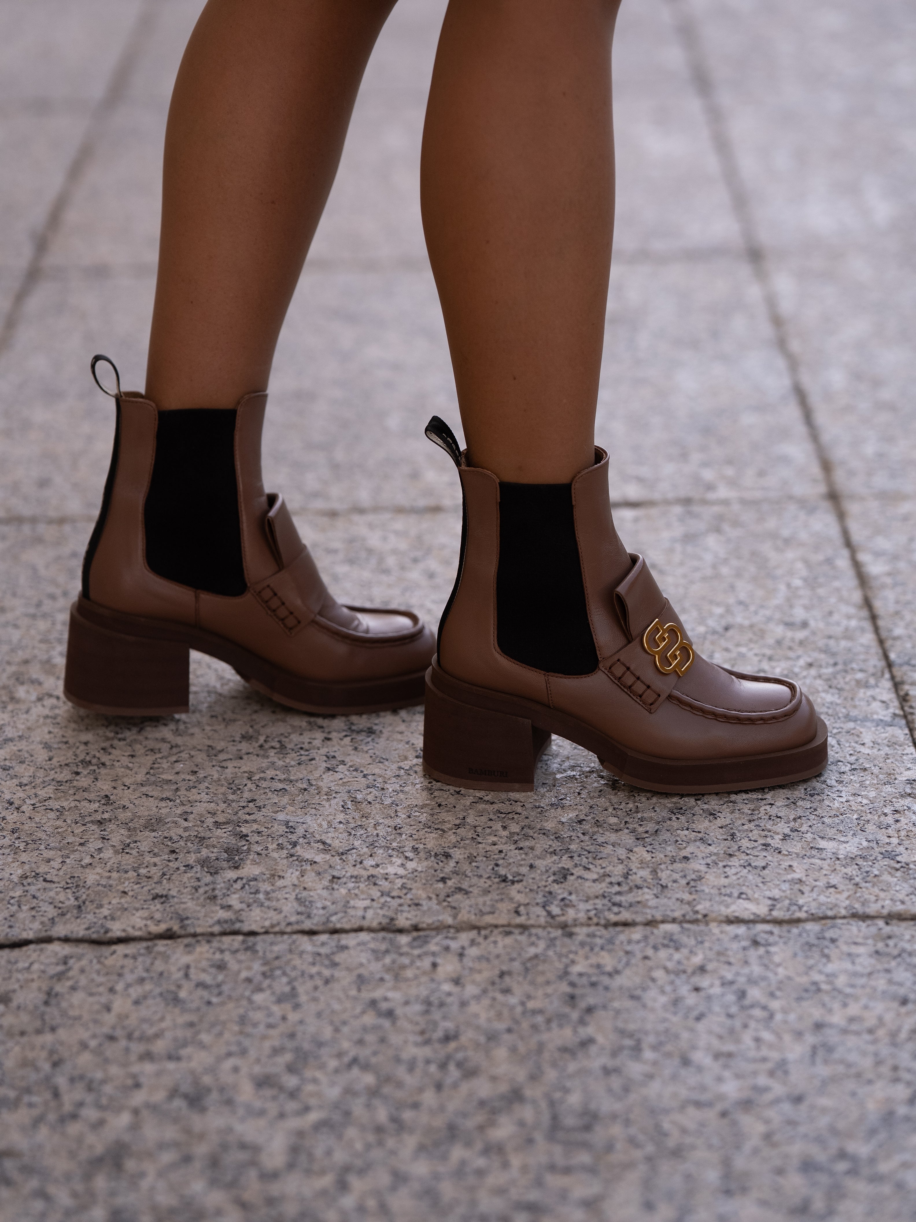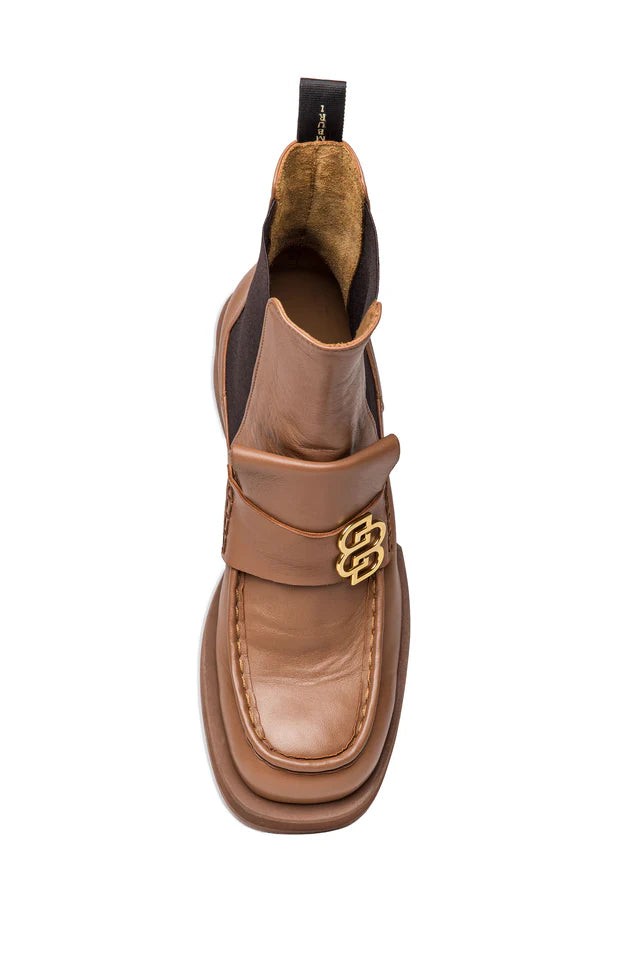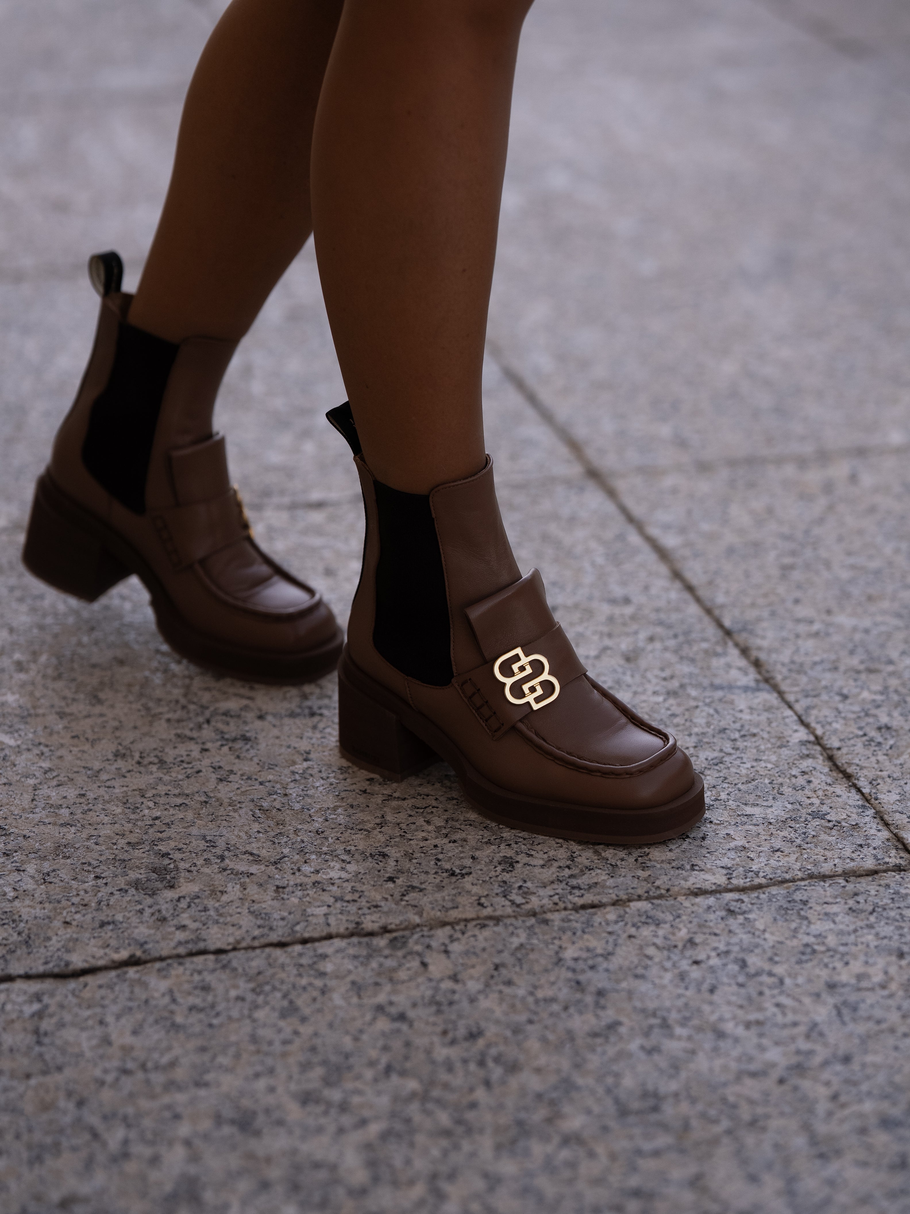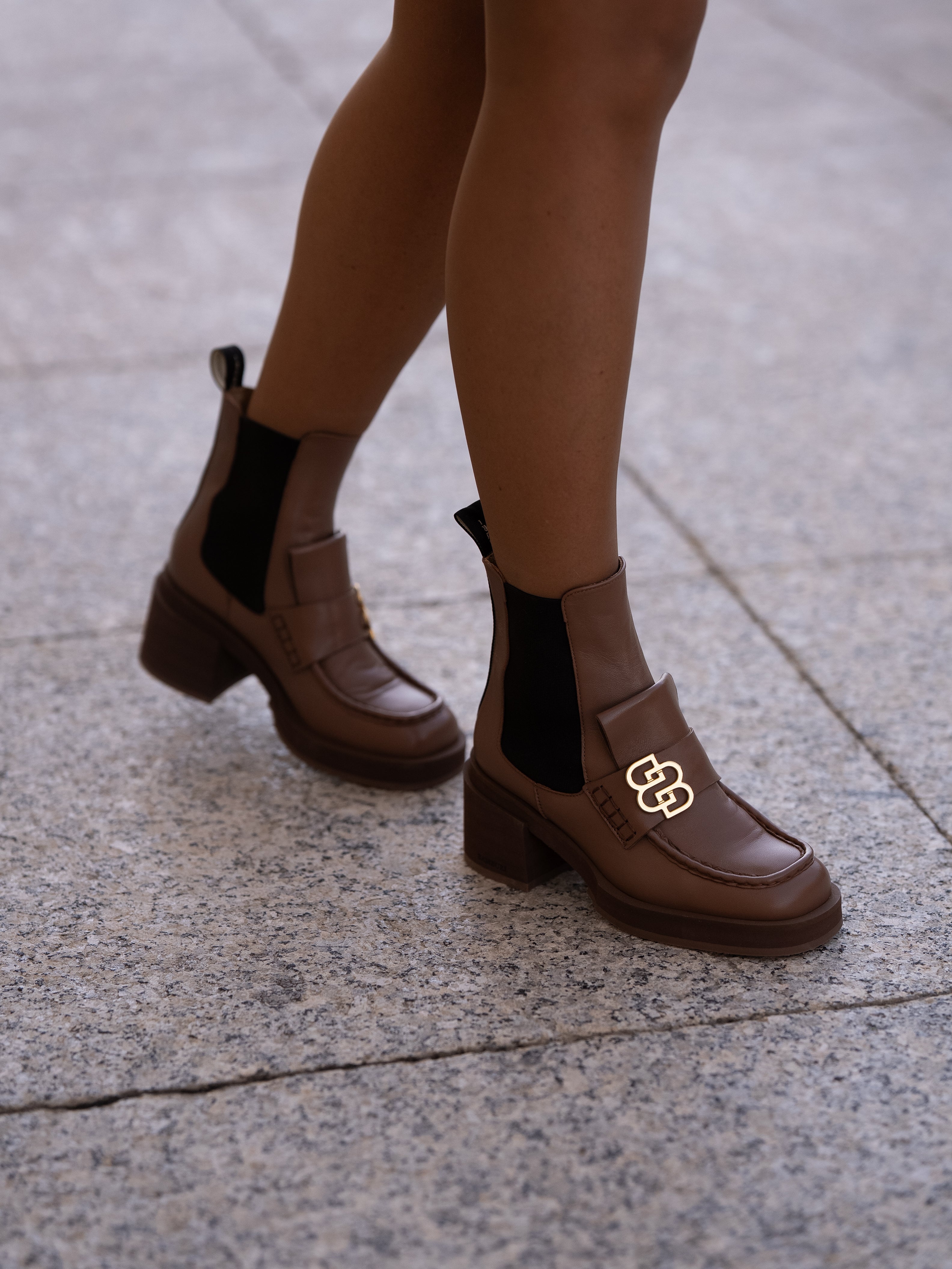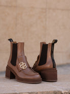 These tan leather Chelsea boots merge timeless design with a bold, structured heel for a modern edge. Featuring stretch side panels, a pull-tab with branded detail, and a statement double-B monogram across the strap, they balance everyday functionality with elevated style. Crafted in smooth leather with a sturdy block heel, they are versatile enough to pair with tailored trousers or denim, making them a wardrobe essential with a contemporary twist.