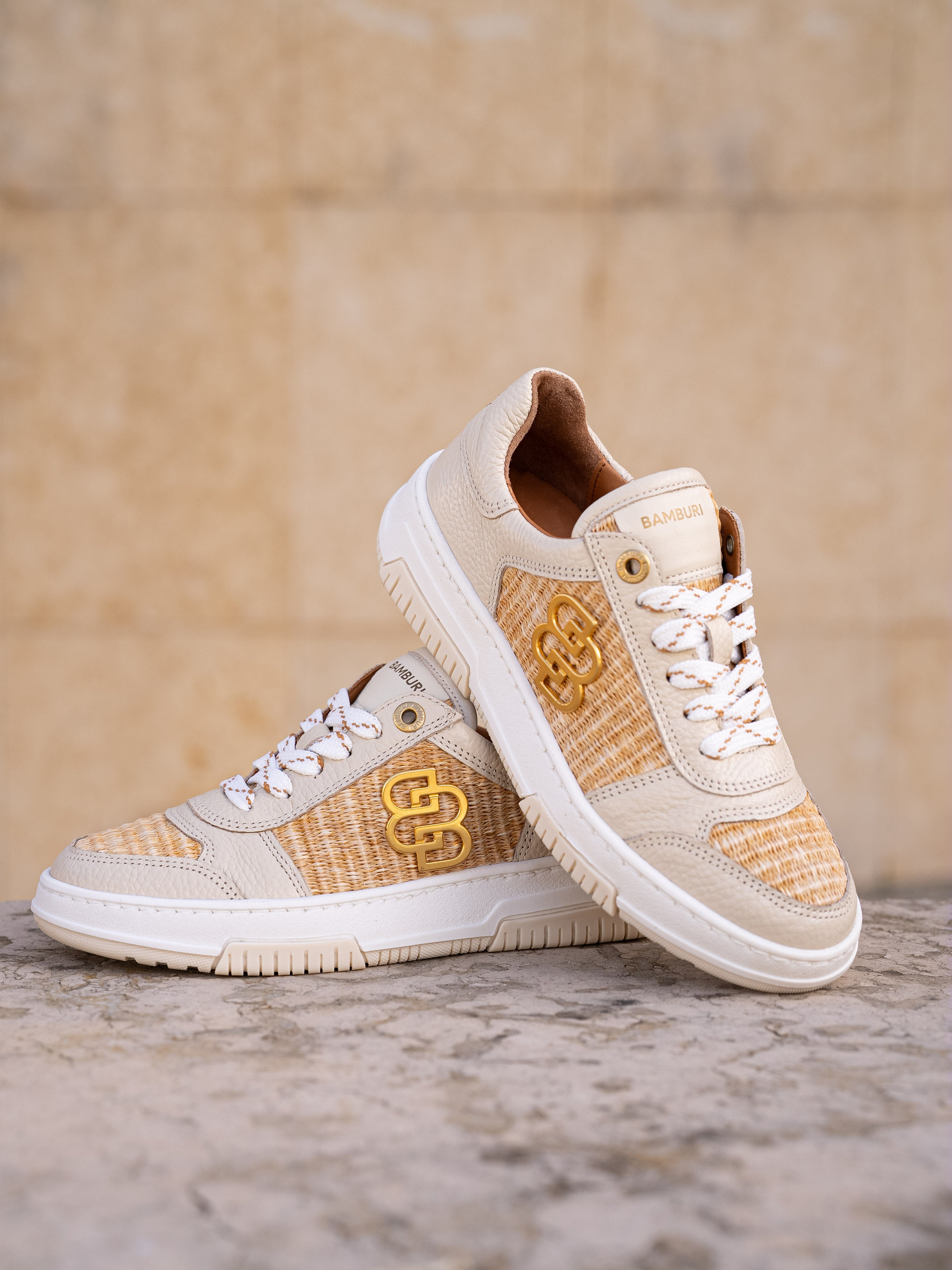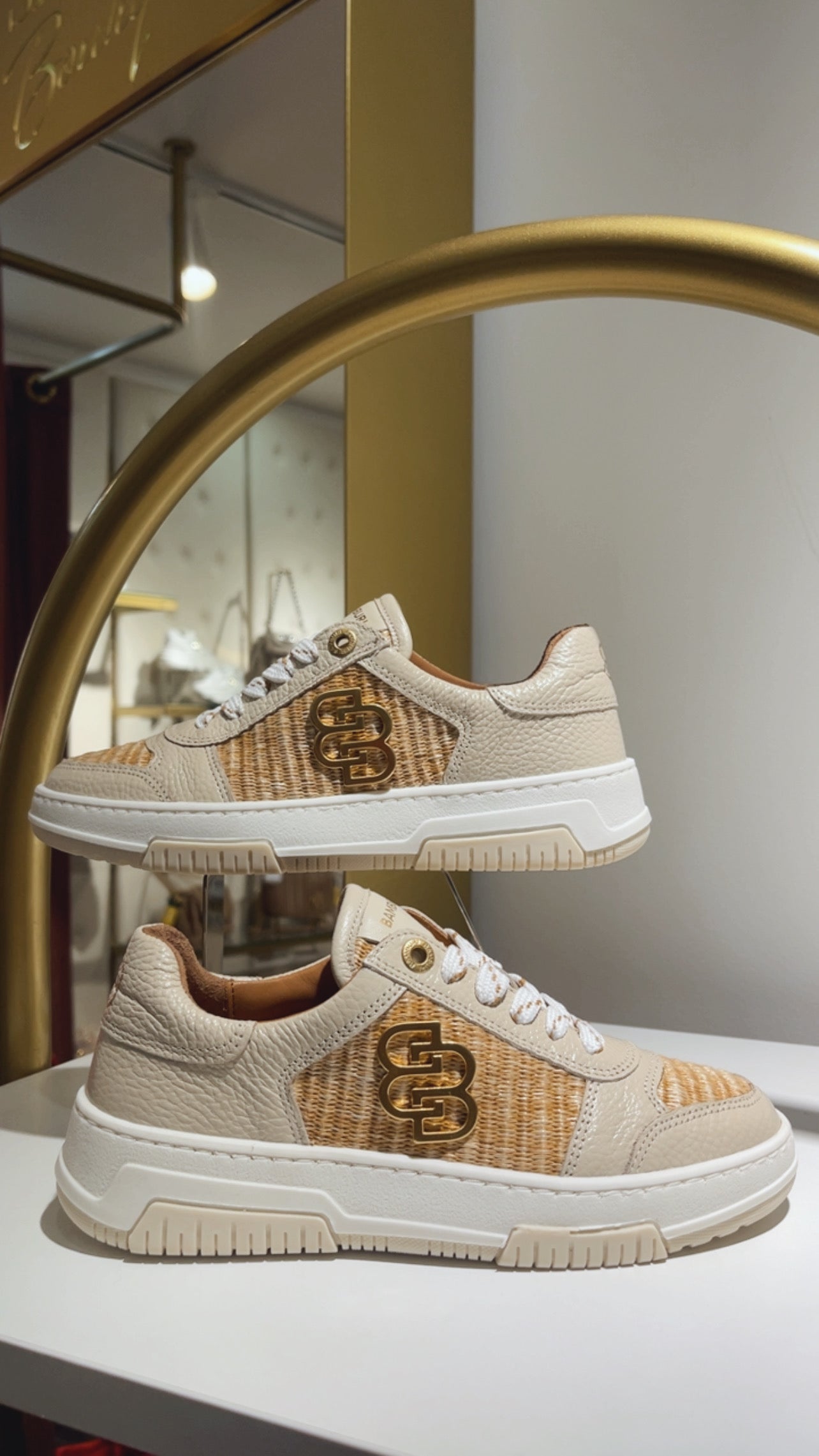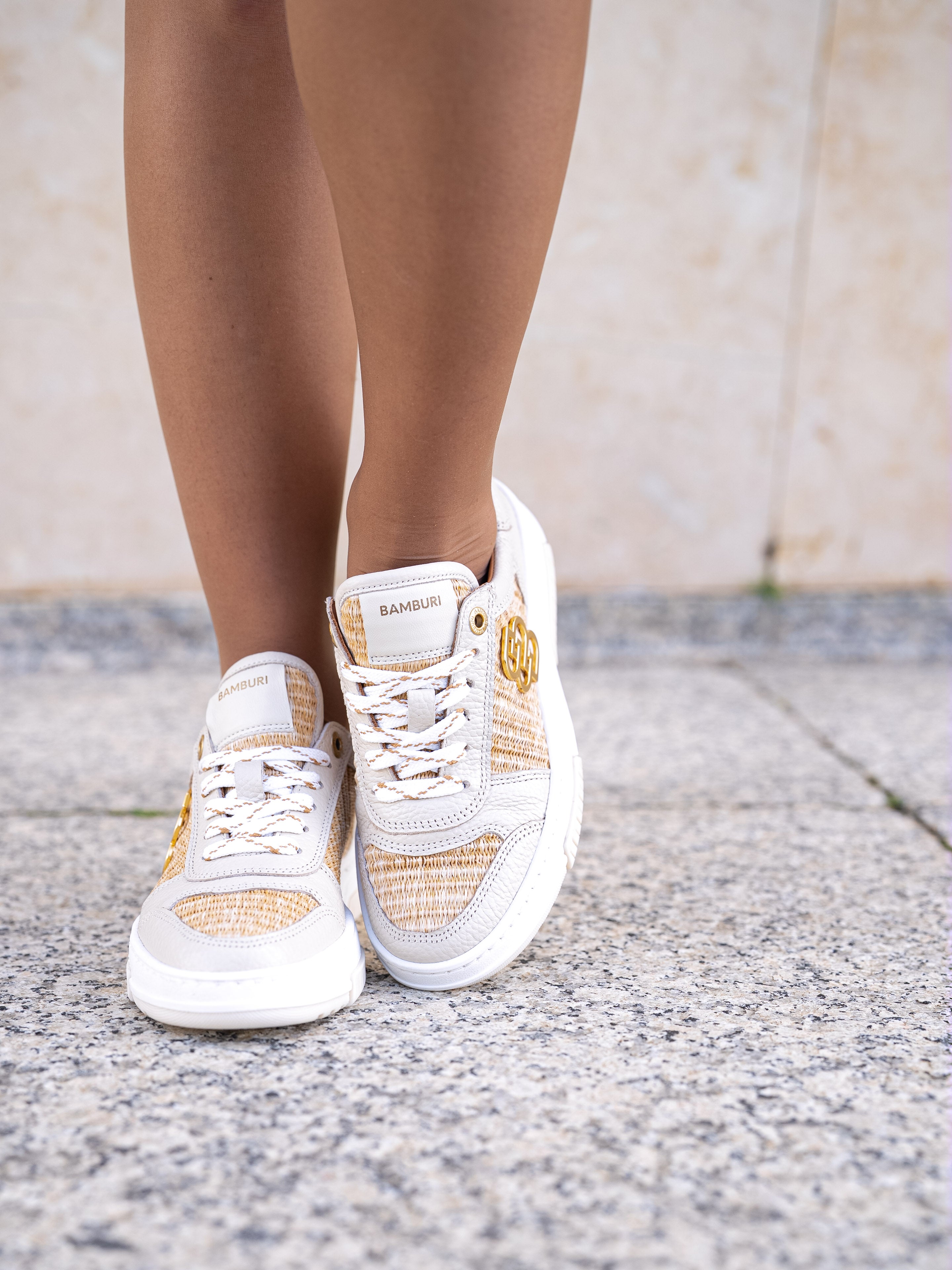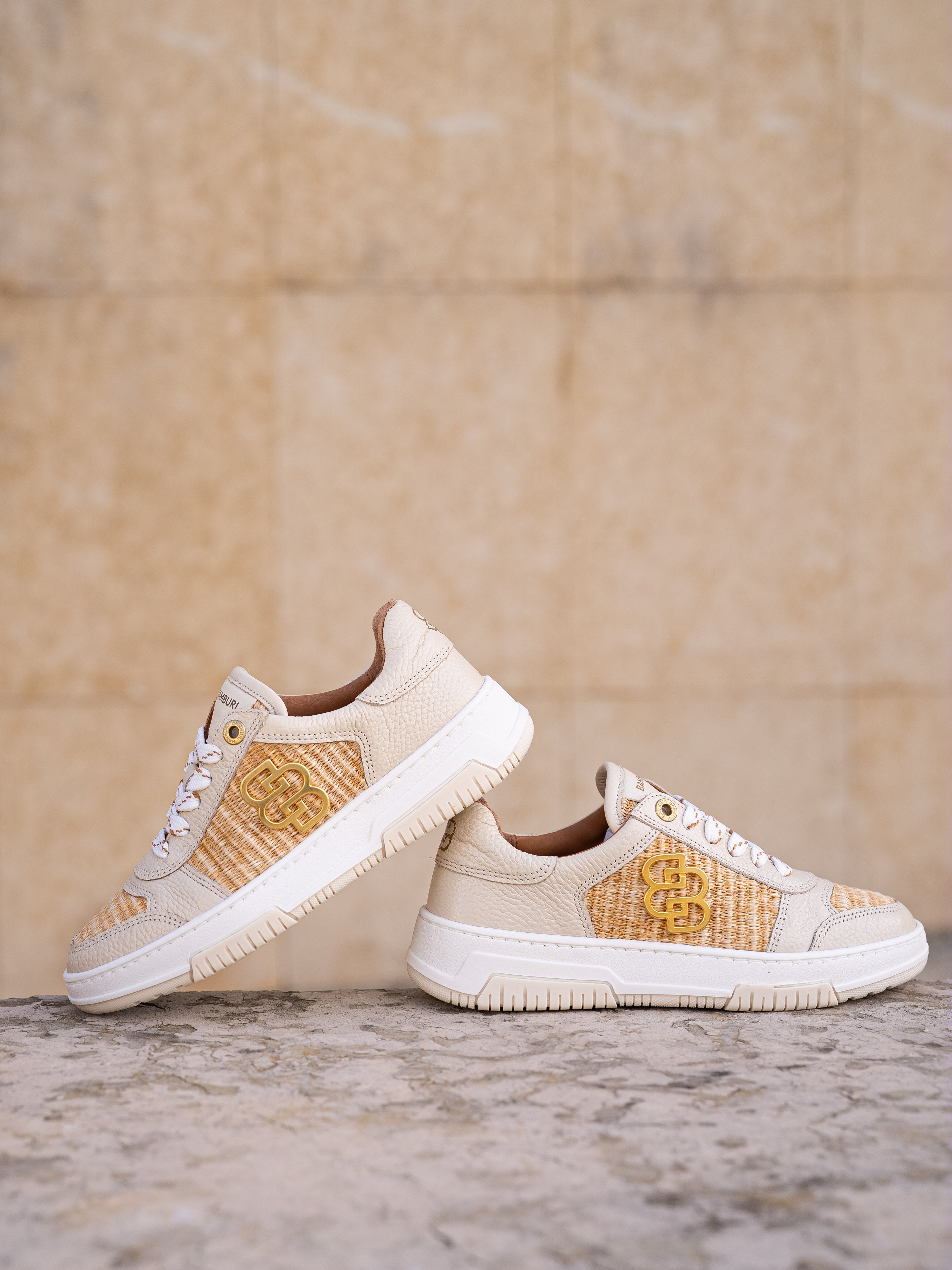 These raffia and leather sneakers combine natural textures with a clean, contemporary silhouette. Crafted from premium leather and woven raffia, they offer a lightweight and breathable feel while maintaining structure and durability. The soft beige tones are complemented by subtle gold-tone details, creating a refined yet relaxed look.