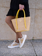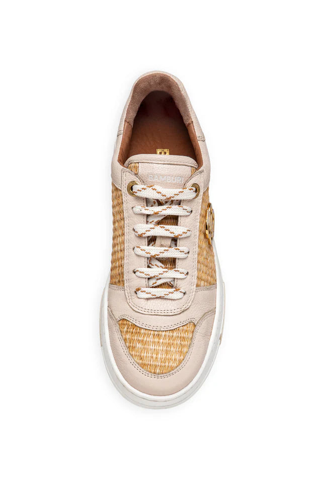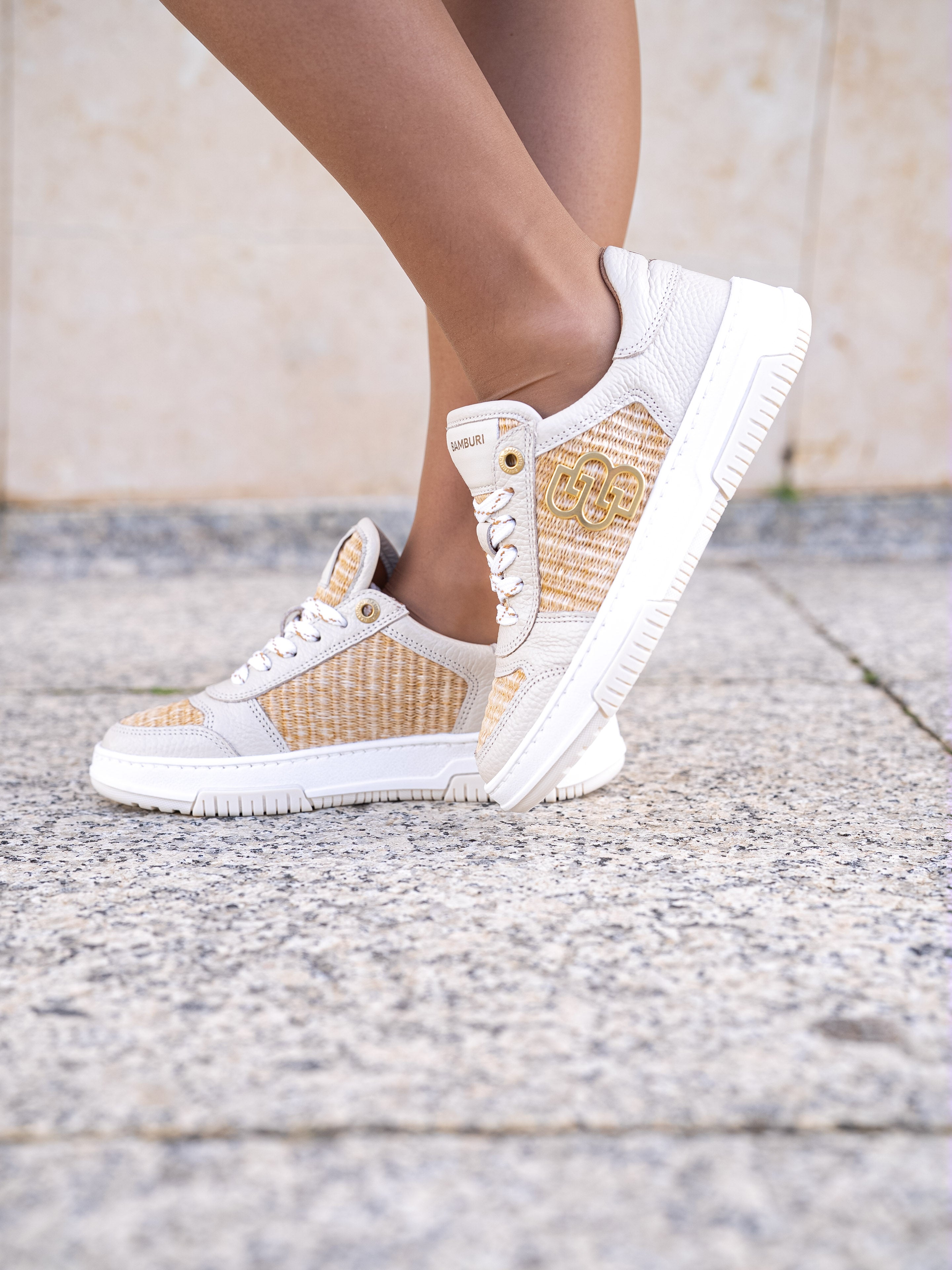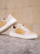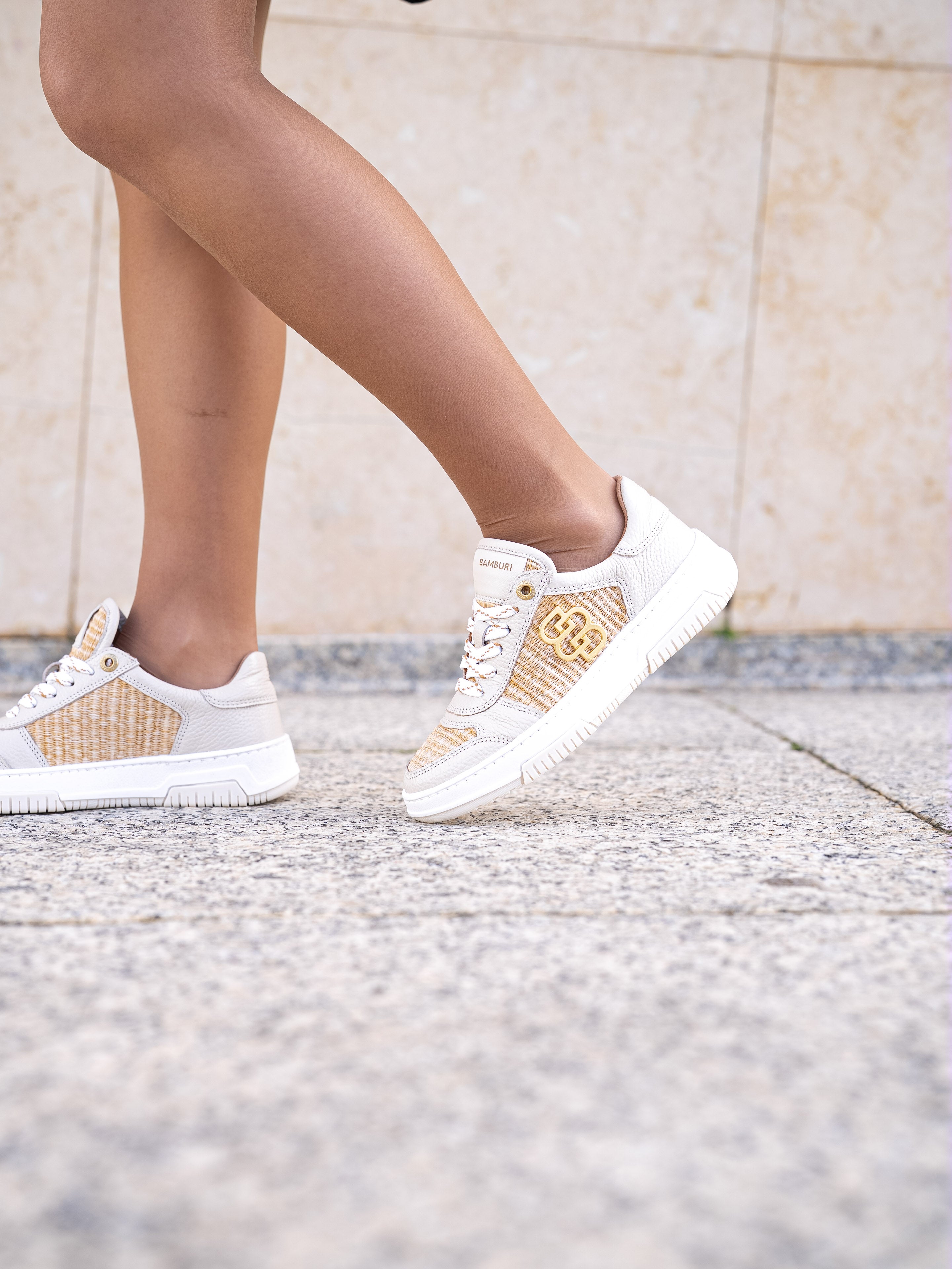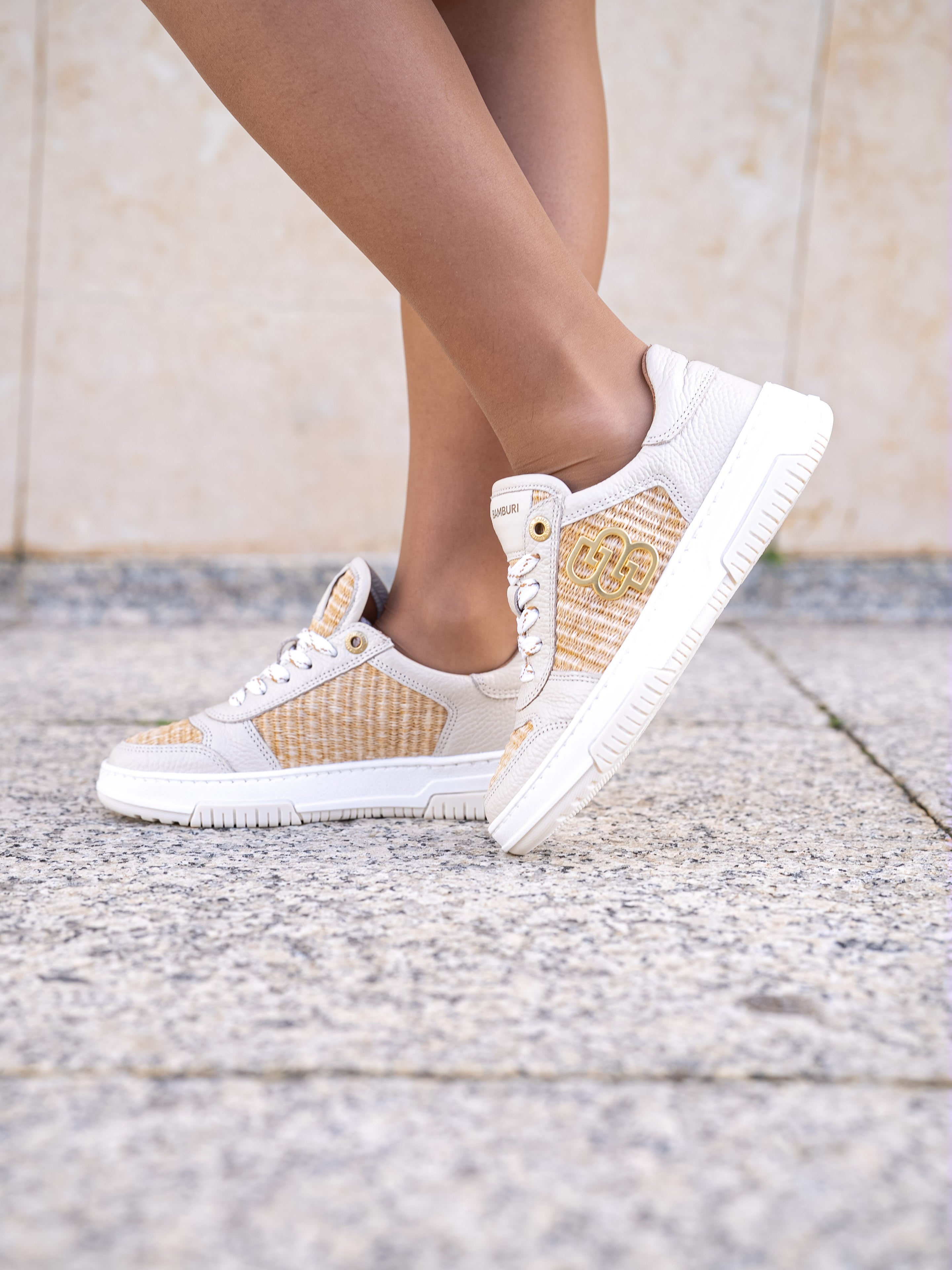 These raffia and leather sneakers combine natural textures with a clean, contemporary silhouette. Crafted from premium leather and woven raffia, they offer a lightweight and breathable feel while maintaining structure and durability. The soft beige tones are complemented by subtle gold-tone details, creating a refined yet relaxed look.